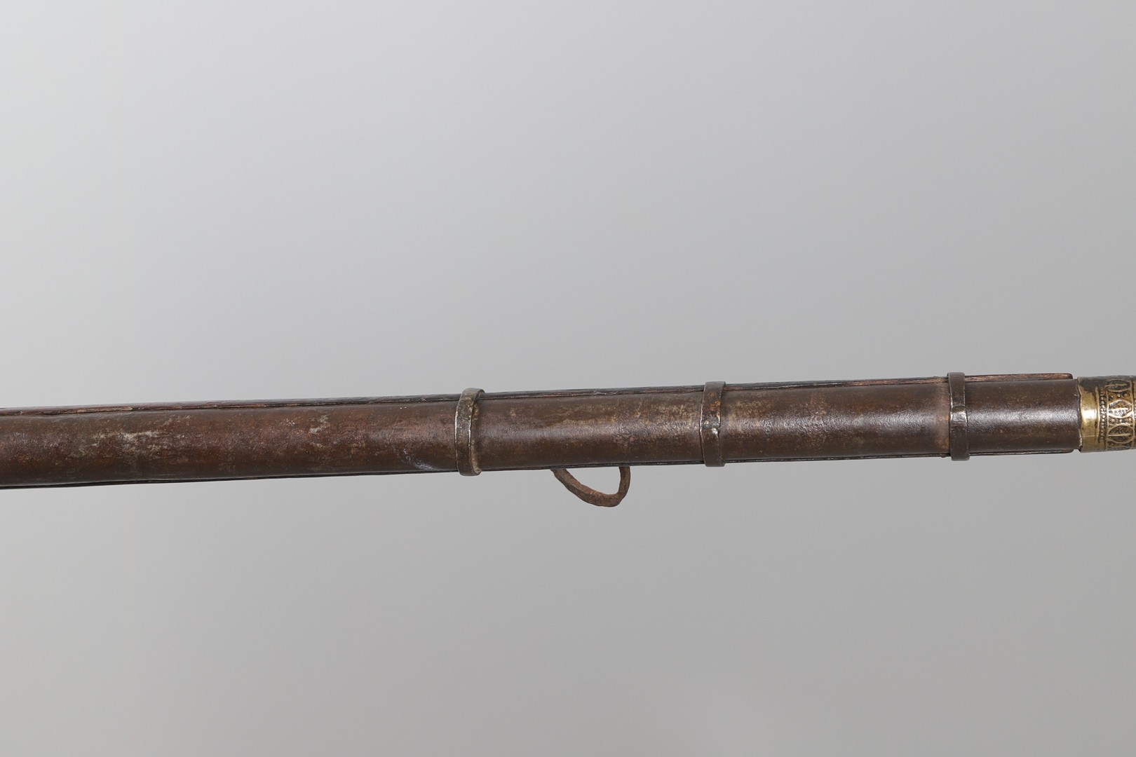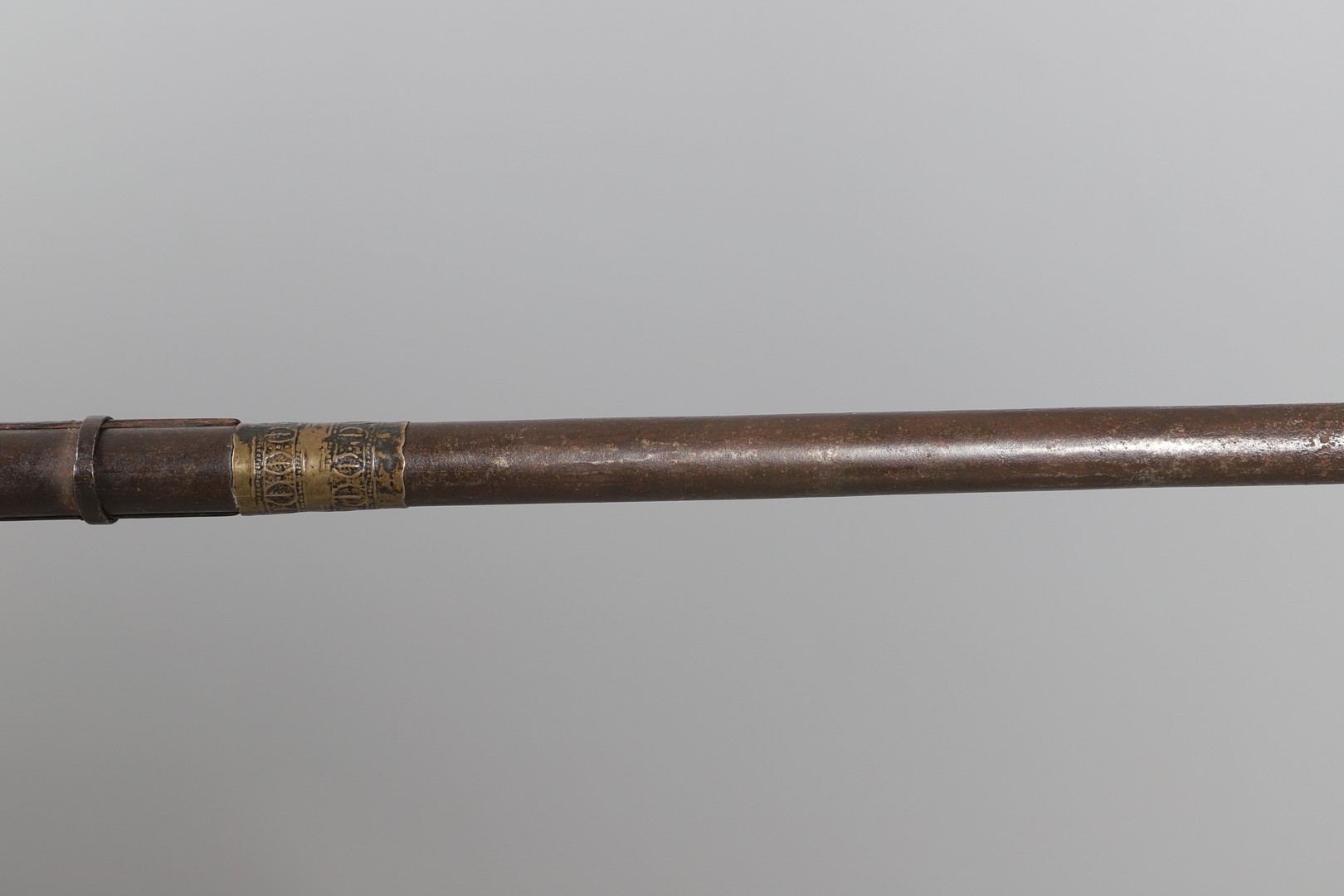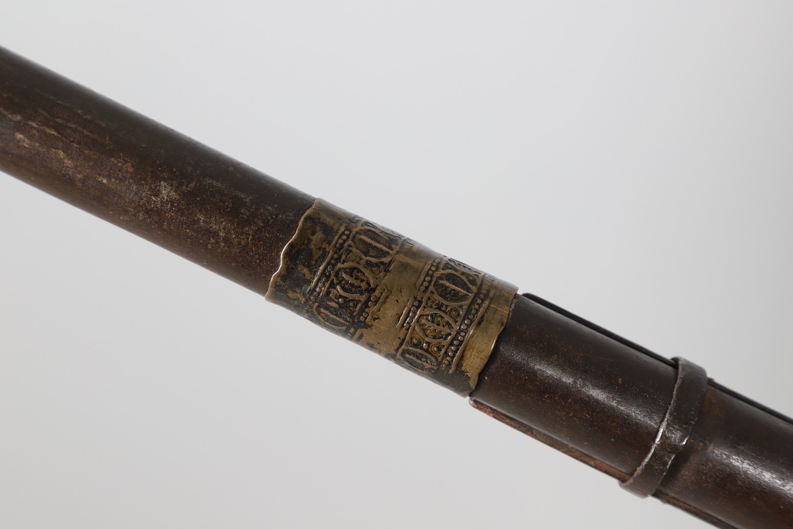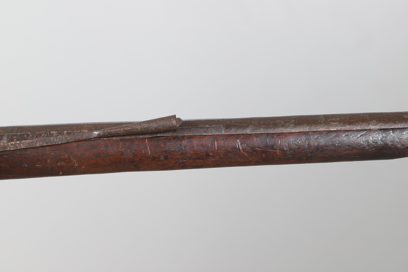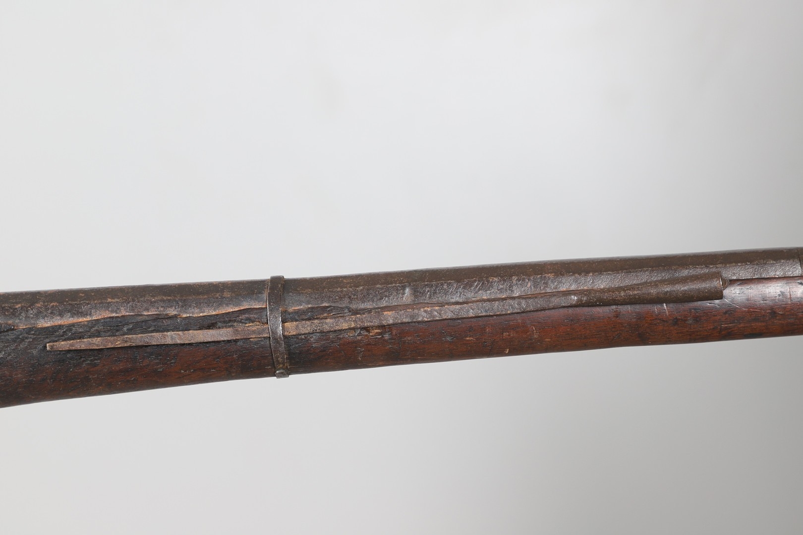 AN AFGHANISTAN JEZAIL MATCHLOCK LONG GUN. The 135 cm tapering barrel, slightly flared at the muzzle with a ram rod below. Fitted with a matchlock action and crooked stock and twin sling mounting points. 175 cm. With an unusual tool fitted beneath one of the metal 'capucine' mounting bands, perhaps a touch-hole prick and a match snuff or loading gauge. "What would seem to be a primitive weapon had a greater and more accurate range than the musket used by the British.".