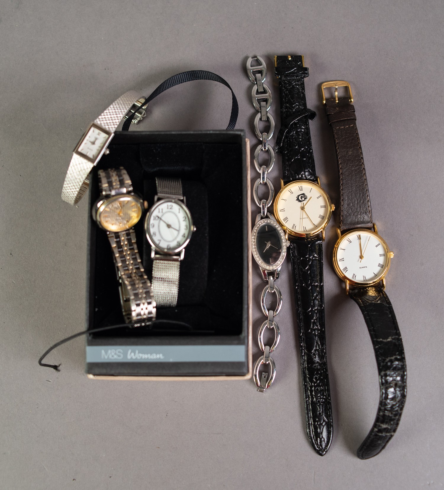 LADY'S ROTARY QUARTZ WHITE METAL BRACELET WATCH with narrow oblong dial, stone set crown; 3 other LADIES QUARTZ WRISTWATCHES and 2 gent's quartz WRISTWATCHES (6)