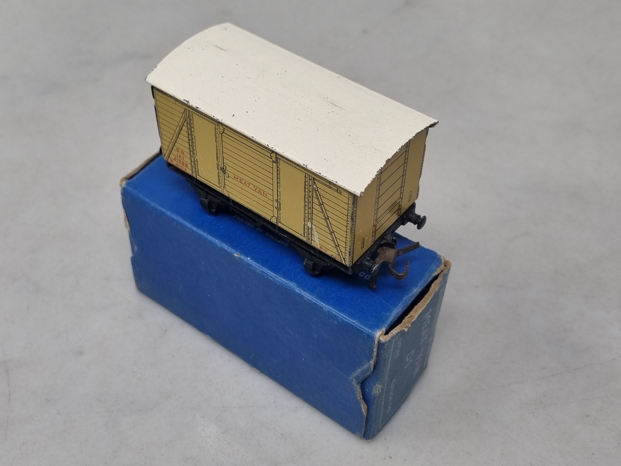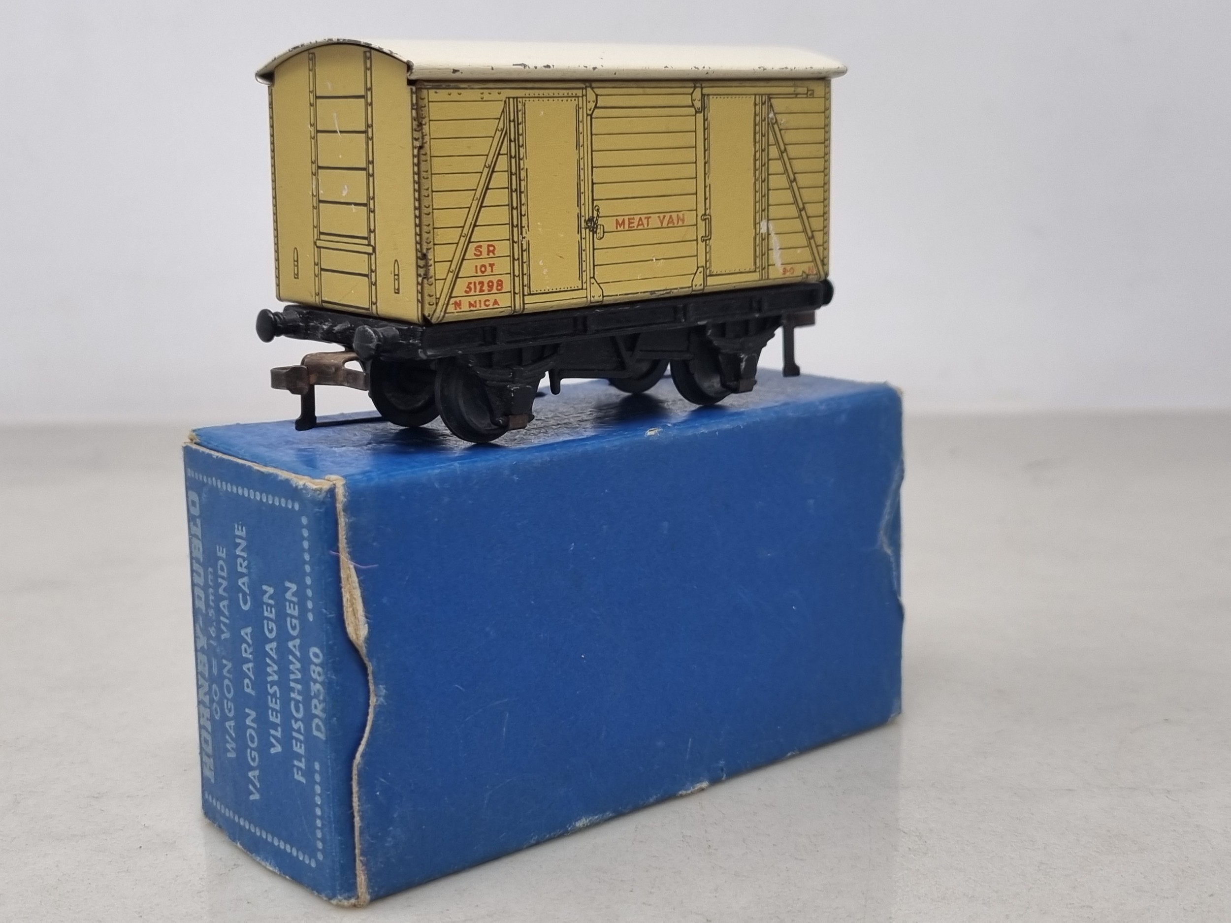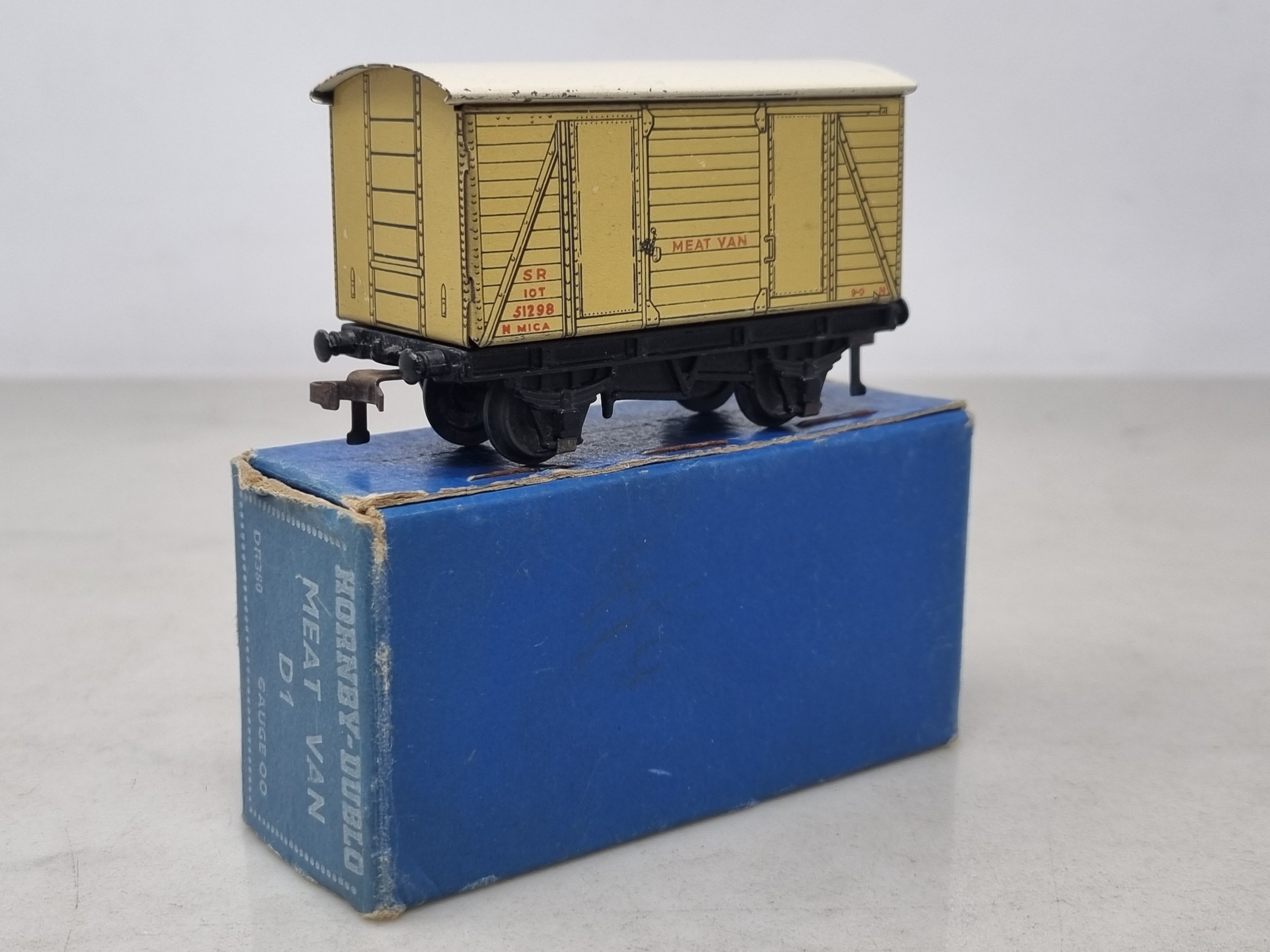 A boxed Hornby Dublo D1 SR Meat Van, VG, some light crazing to roof and scratches to sides, 10/50 box Ex with all flaps but no regional sticker