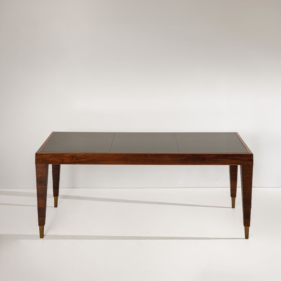 Tavolo. Legno di noce, ottone, vetro opalino. Italia fine anni '20. Perizia Gio Ponti Archives.