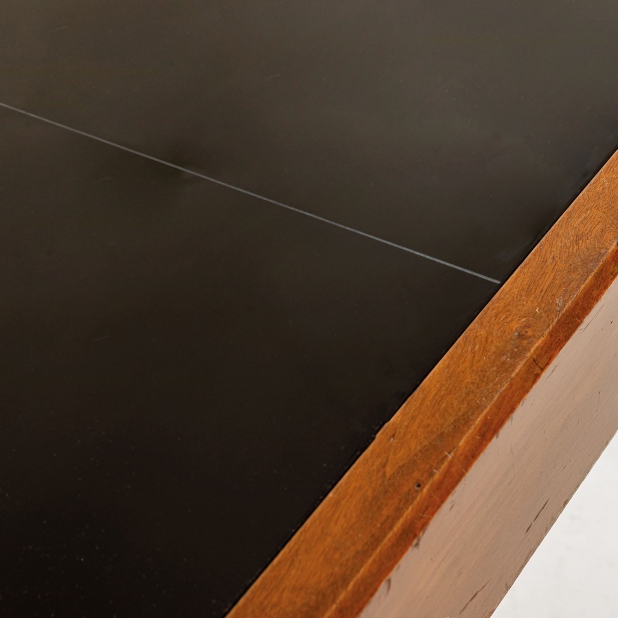 Buone condizioni generali. Piccole righe, leggeri graffi, normali segni dovuti all'uso quotidiano. Struttura in legno recentemente rilucidata. Ottone in patina con lieve ossidazione. Qualche piccola riga sul piano in vetro.