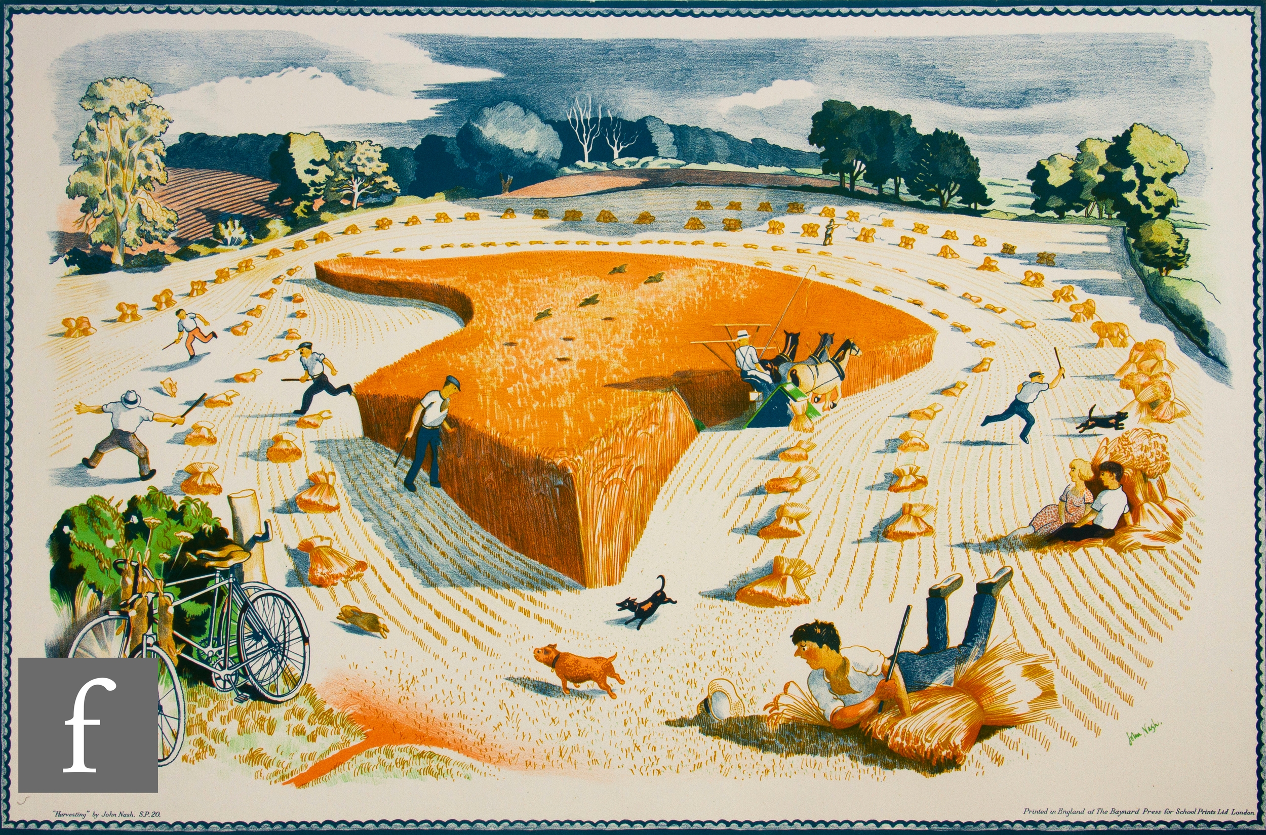 After John Nash (1893-1977) -'Harvesting', lithograph, published by Baynard Press, London for School Prints Ltd, unframed, 49cm x 76cm.