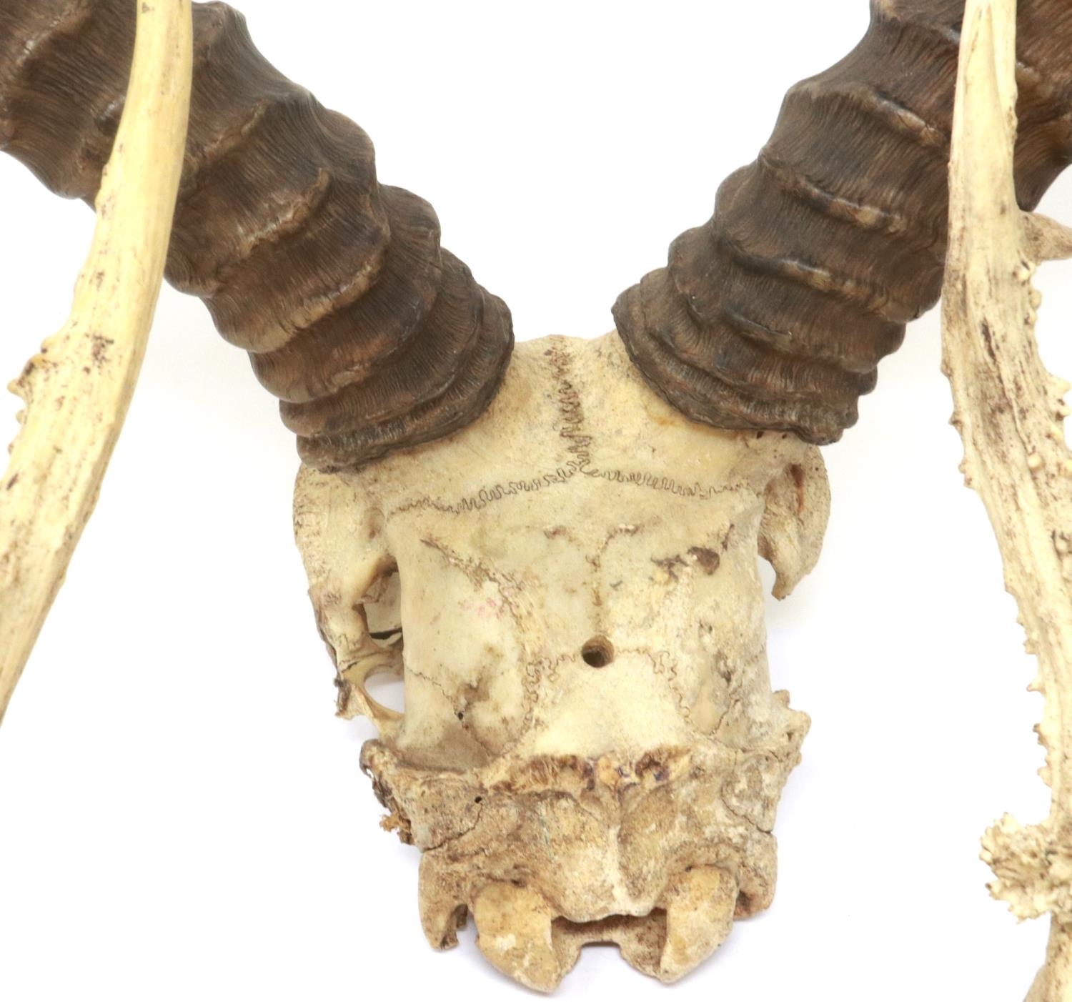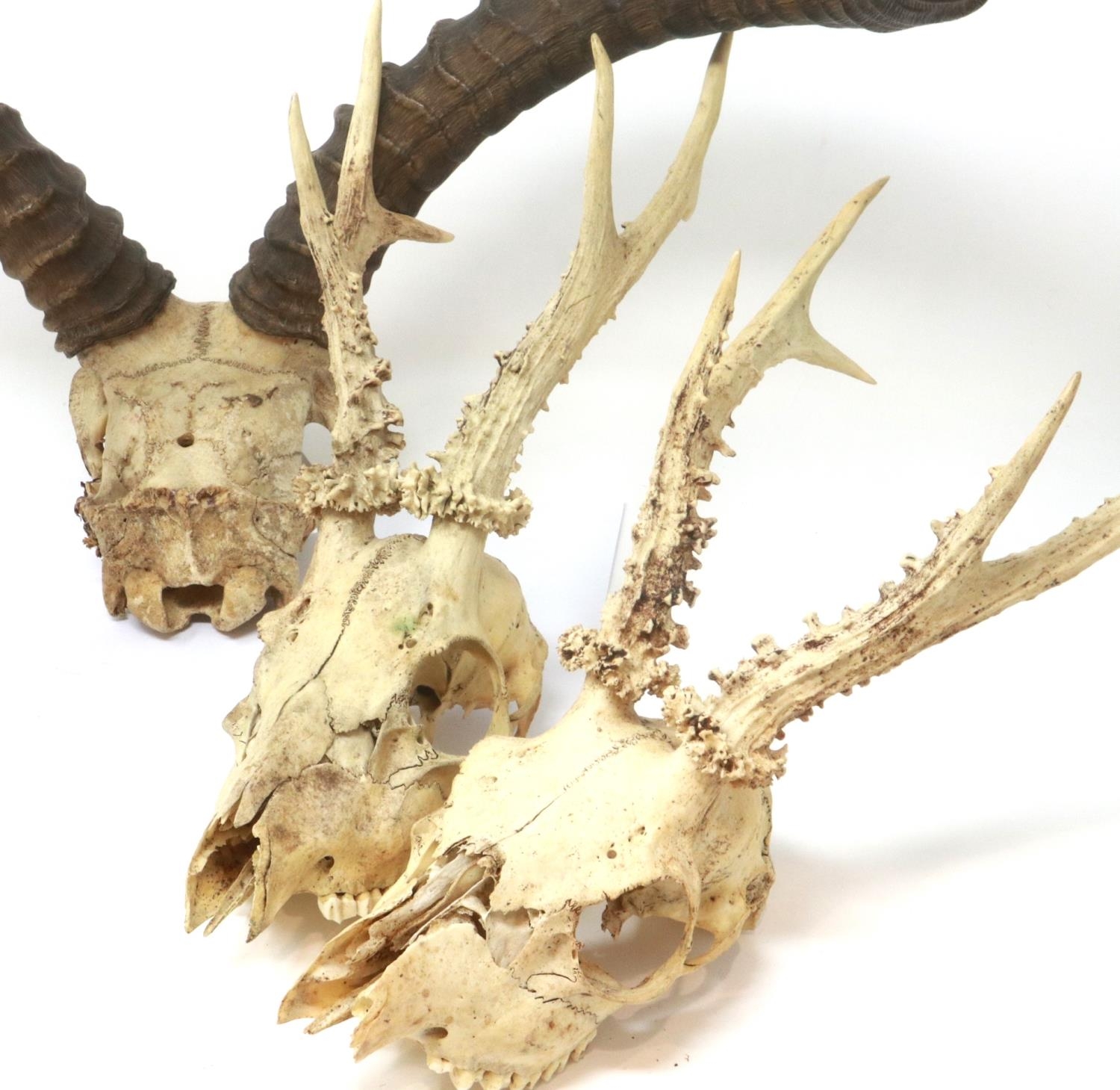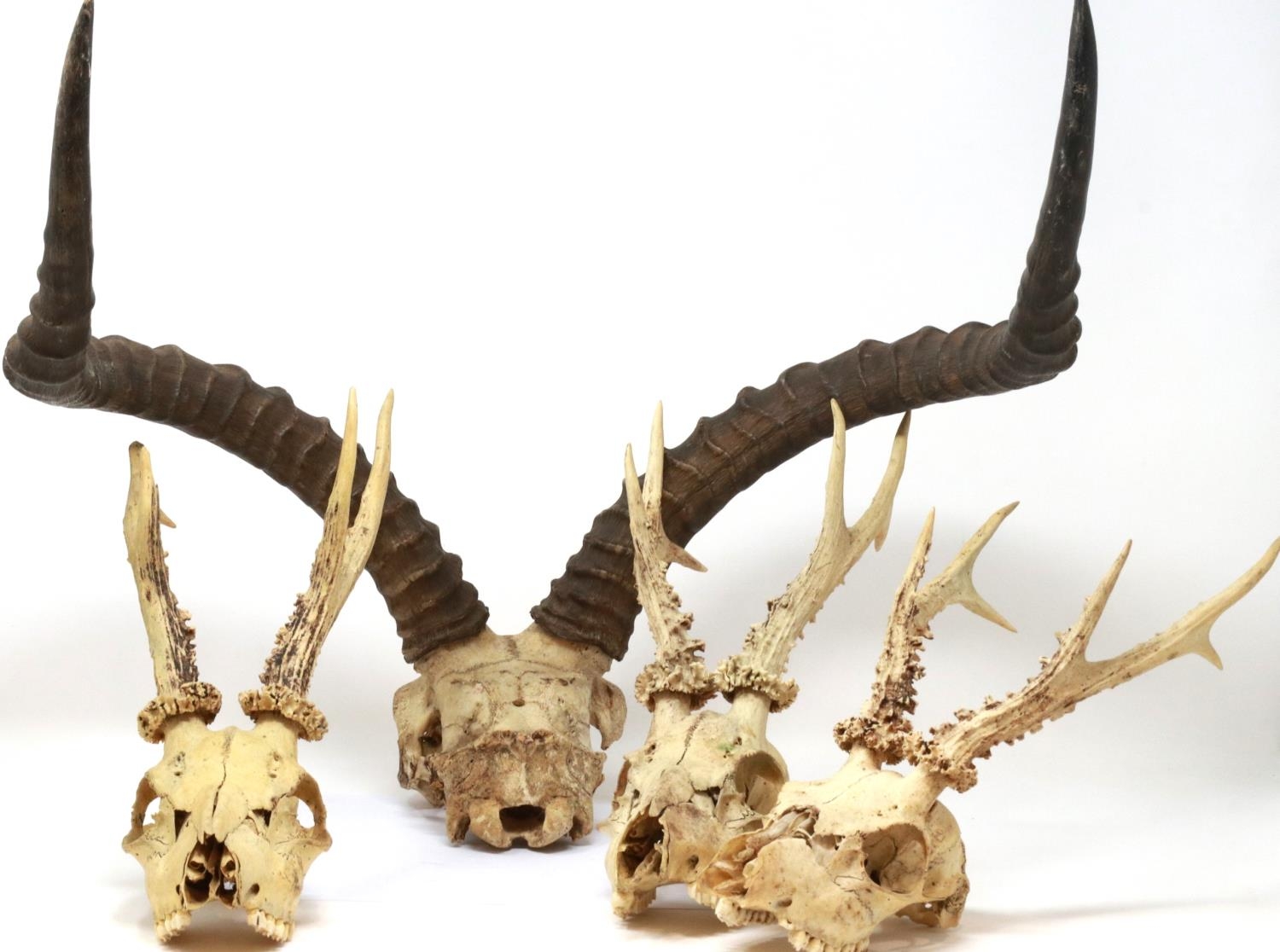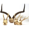 Four taxidermy deer skulls, some losses throughout. Not available for in-house P&P