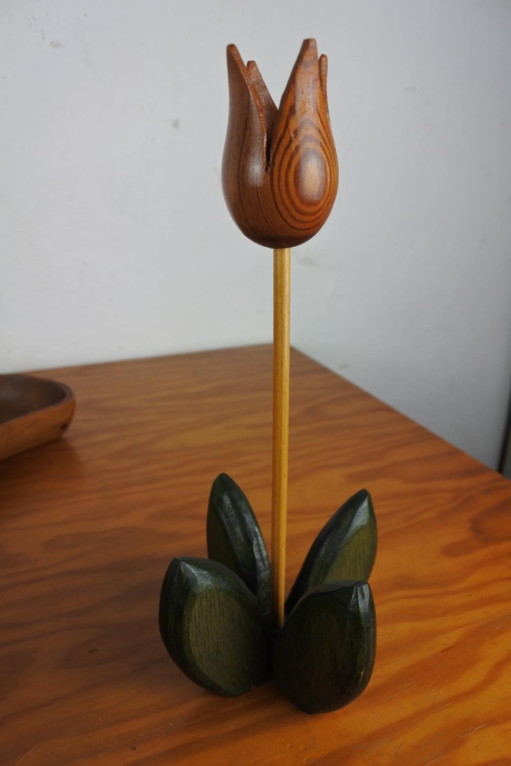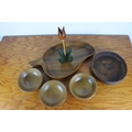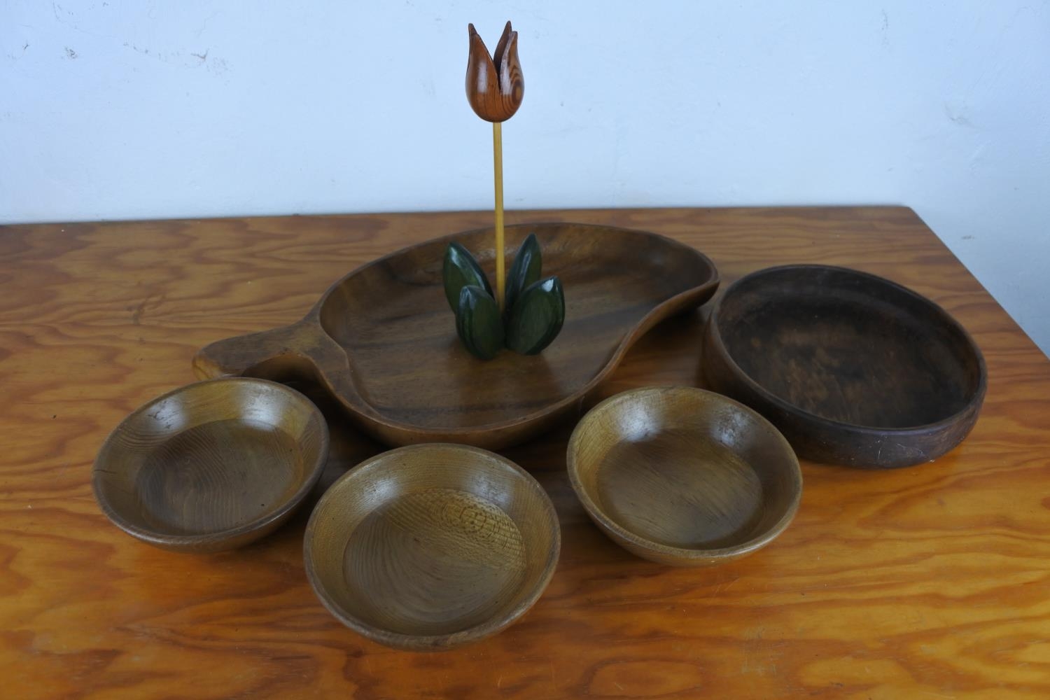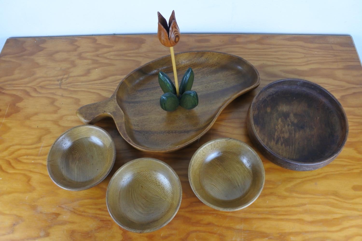 An assorted lot of vintage wooden bowls and a wooden candle holder.