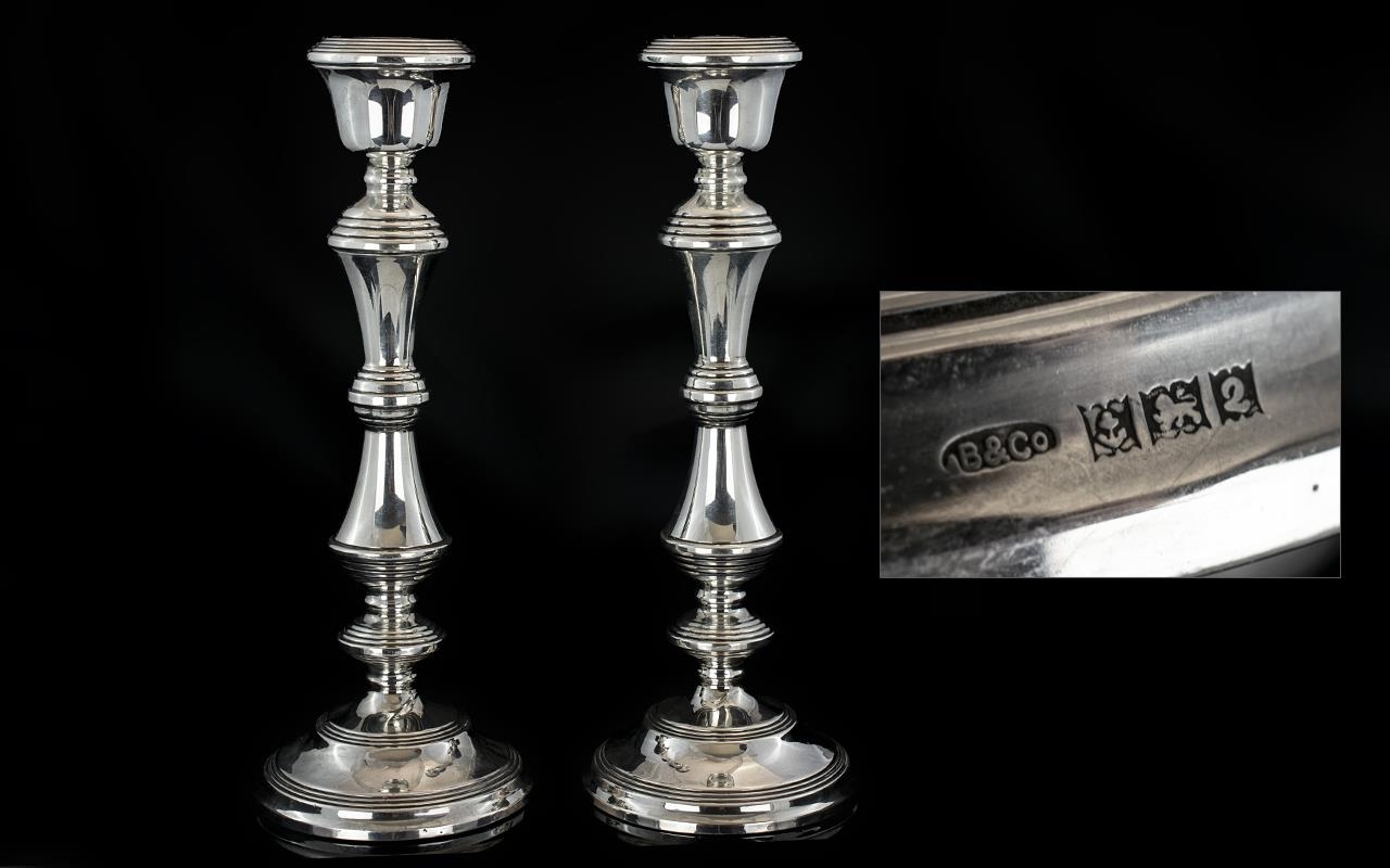 Elizabeth II - Large and Very Fine Pair of Sterling Silver Candlesticks of Pleasing Proportions and Design. Hallmark Birmingham 1965, Maker B & Company, W.I. Broadway & Co. Height 10.75 Inches - 26.90 cms Each. Total Weight 1246.4 grams, Loaded Bases, Each Candlestick Nr Mint Condition - Please Confirm with Photo.
