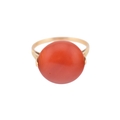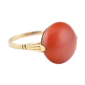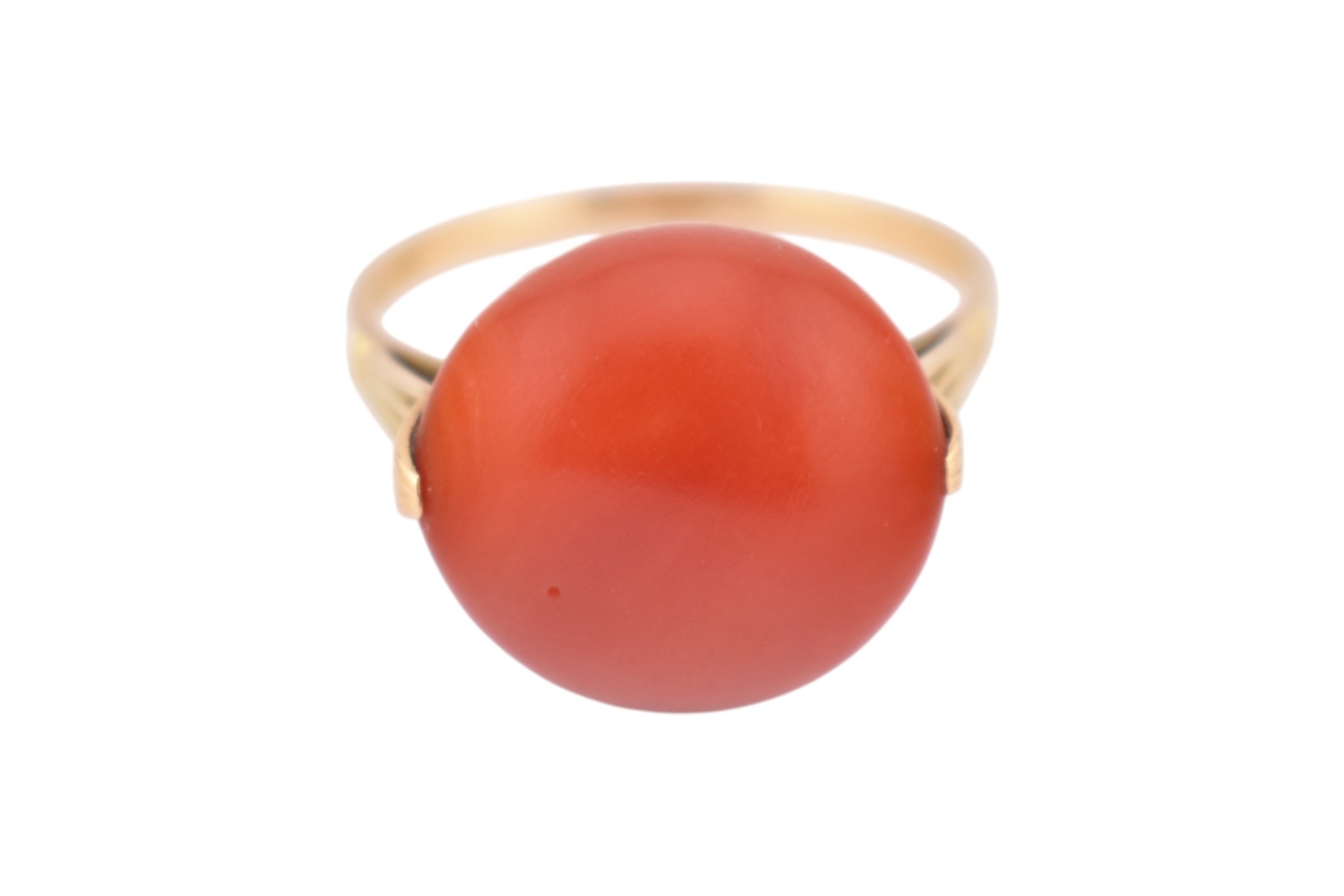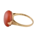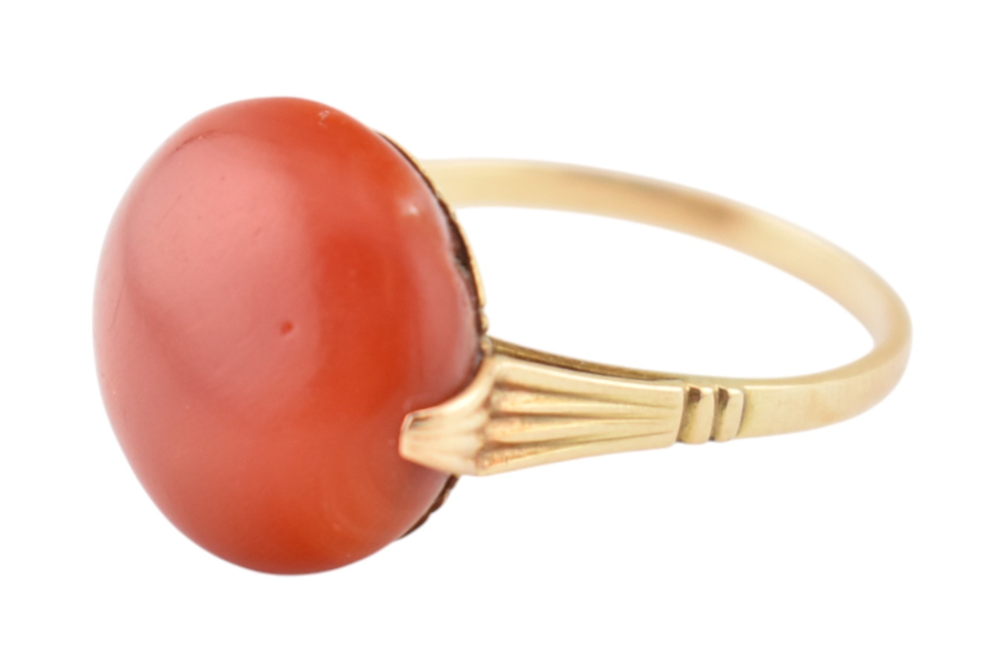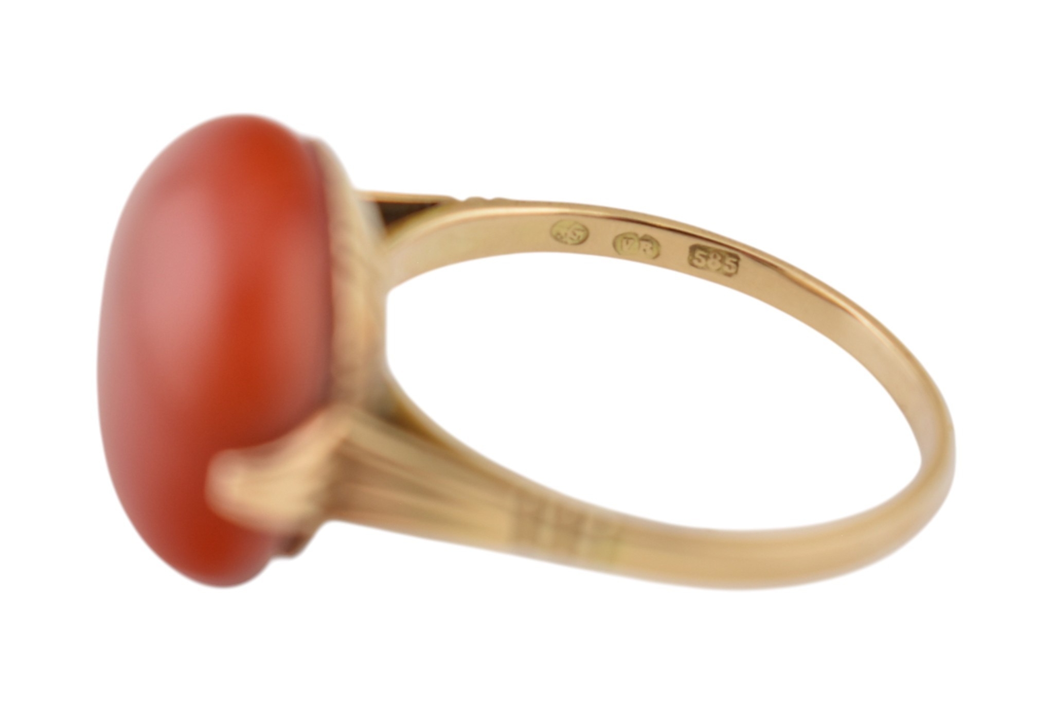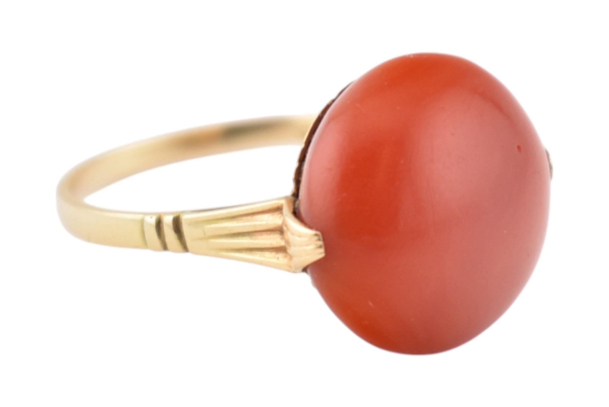 An Art Deco 14ct gold & and coral cabochon ring. The ring set with a large round coral cabochon with to stylised shoulders. Assay marks for 14ct gold 585. Weight 4.1g. Size N.5.