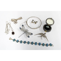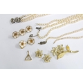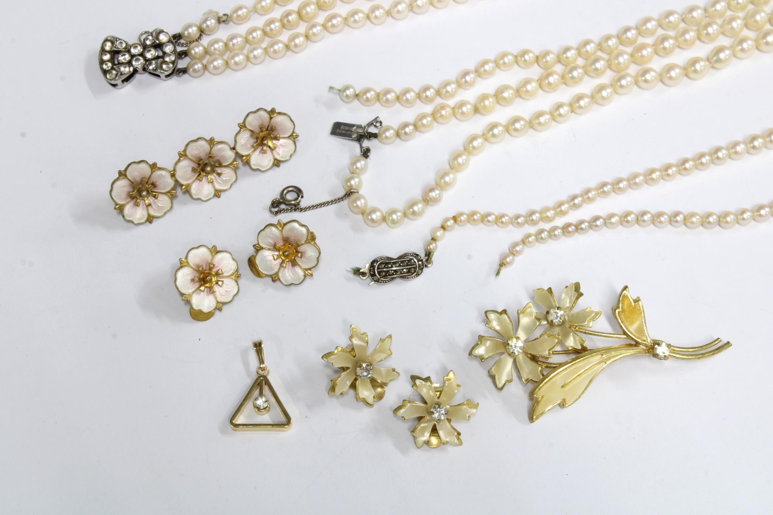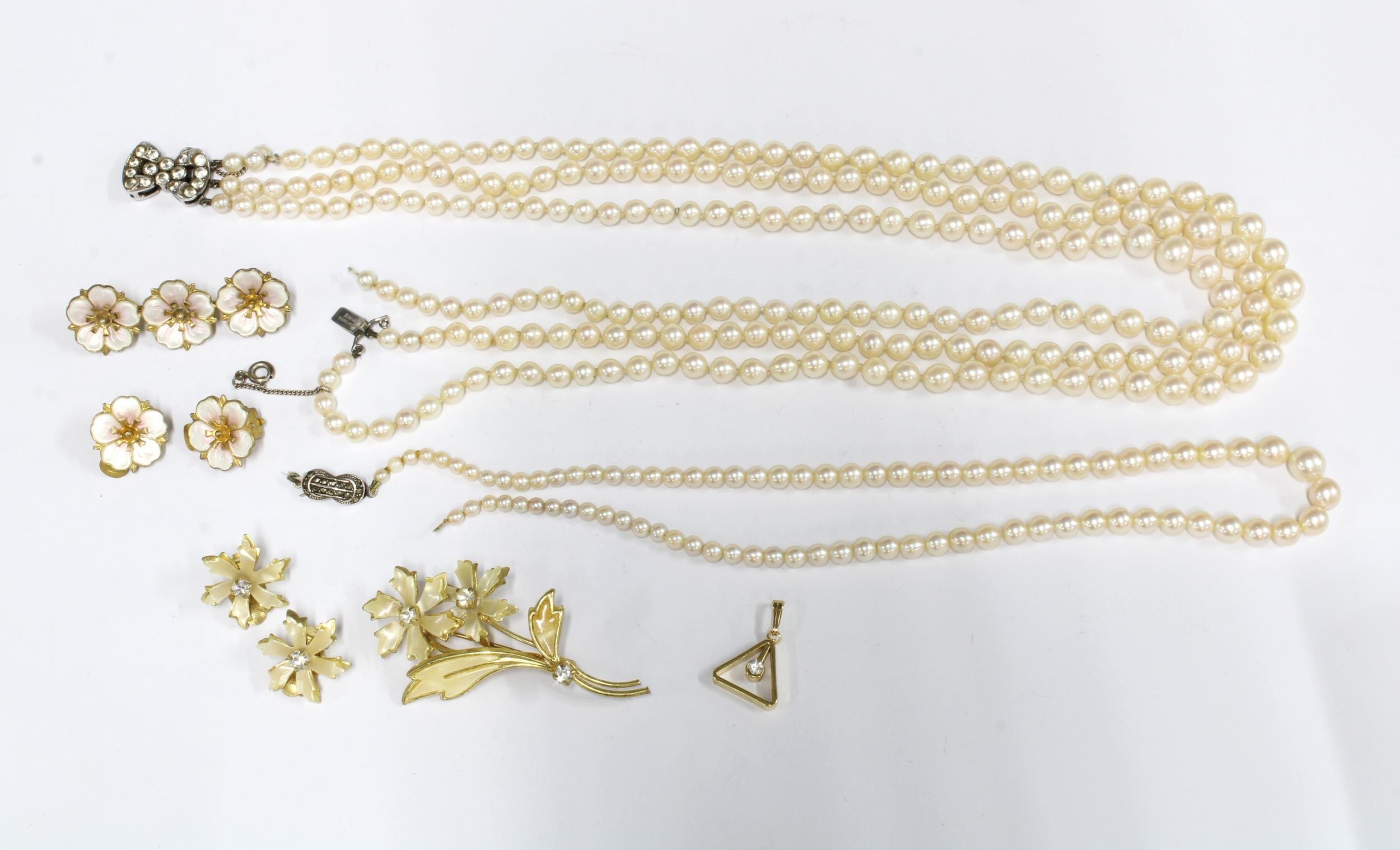Scandinavian silver gilt and enamel flower brooch and earrings, a floral spray brooch, earrings and triangle pendant together with a triple strand pearl necklace and single strand (pearls a/f)