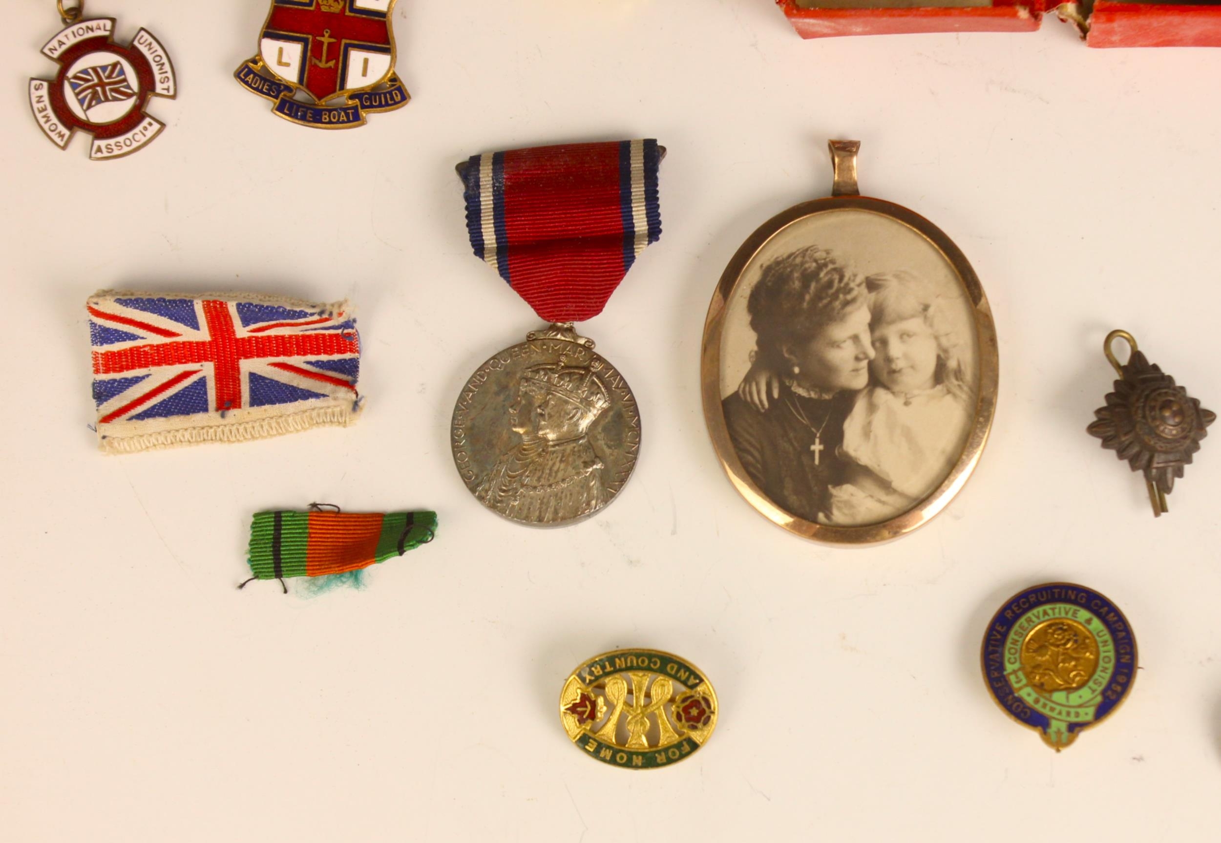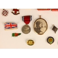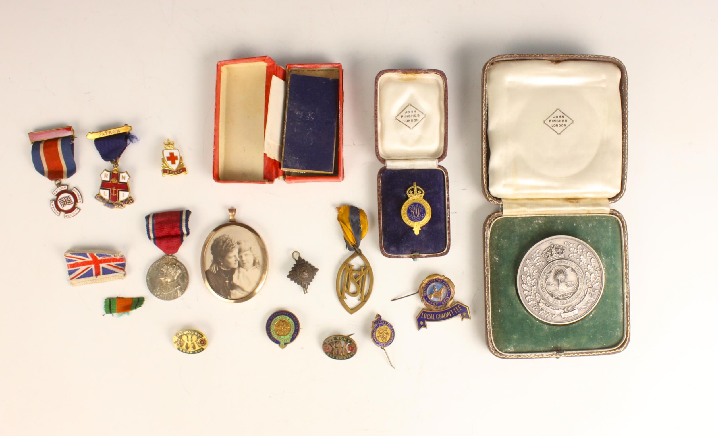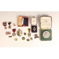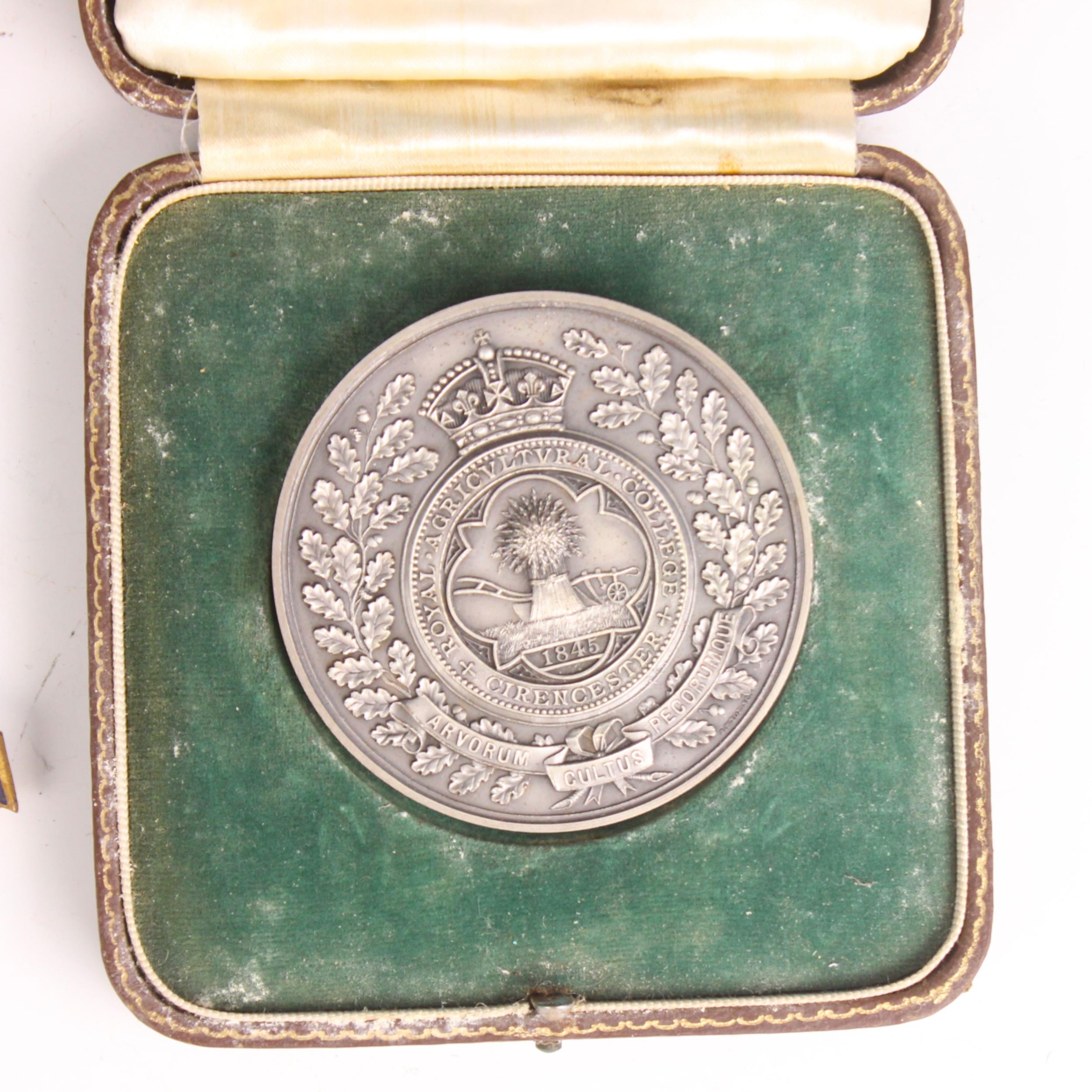 A Cirencester 'Goldstand silver' medal, for the student of the year, within case (at fault) with a collection of badges and buttons, and a 1930 Jubilee medal within case (qty) (at fault)