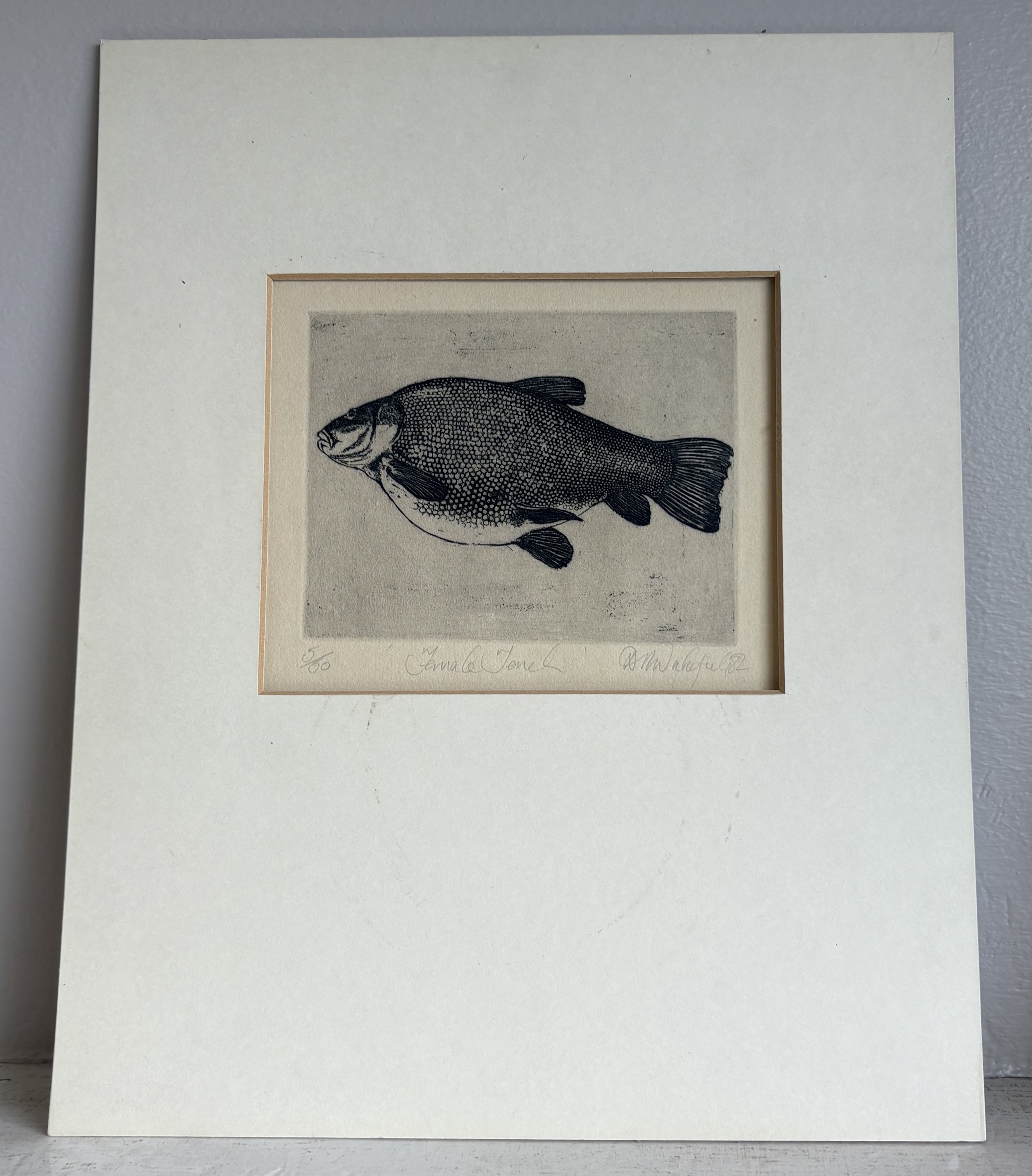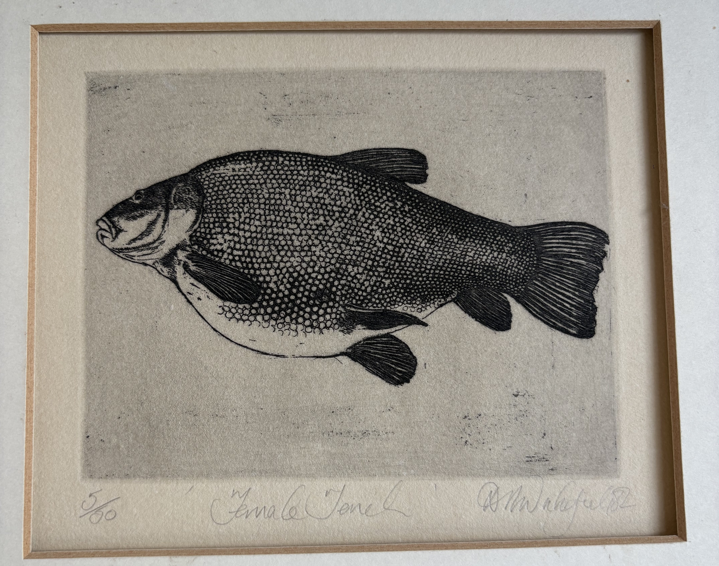 A Limited-Edition book plate print entitled 'Female Tench' from 'The Diary and Observations of a Tench Fisher'. Numbered 5 / 50. Pencil signed D R Wakefield and dated 82 to bottom right. Approx. 14 cm x 11.5 cm. PROVENANCE: NOEL CHANAN. Est. £60 - £80.