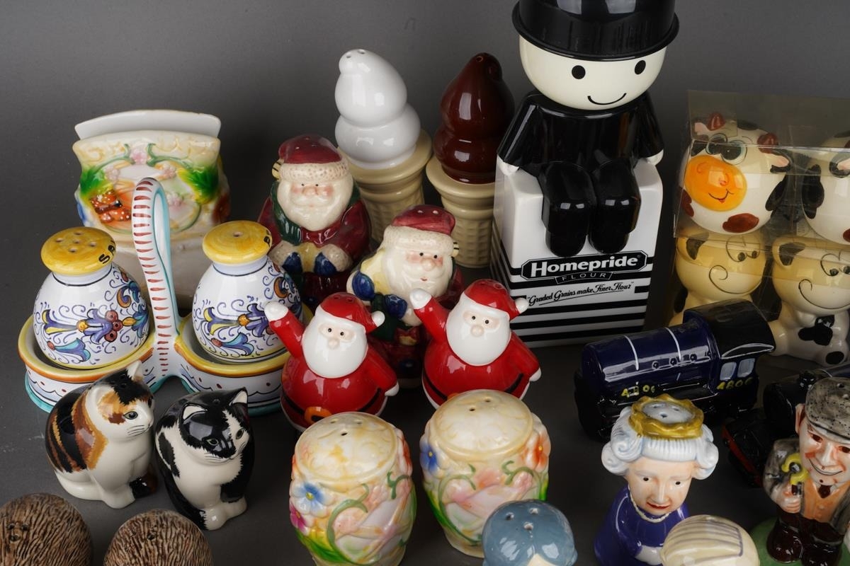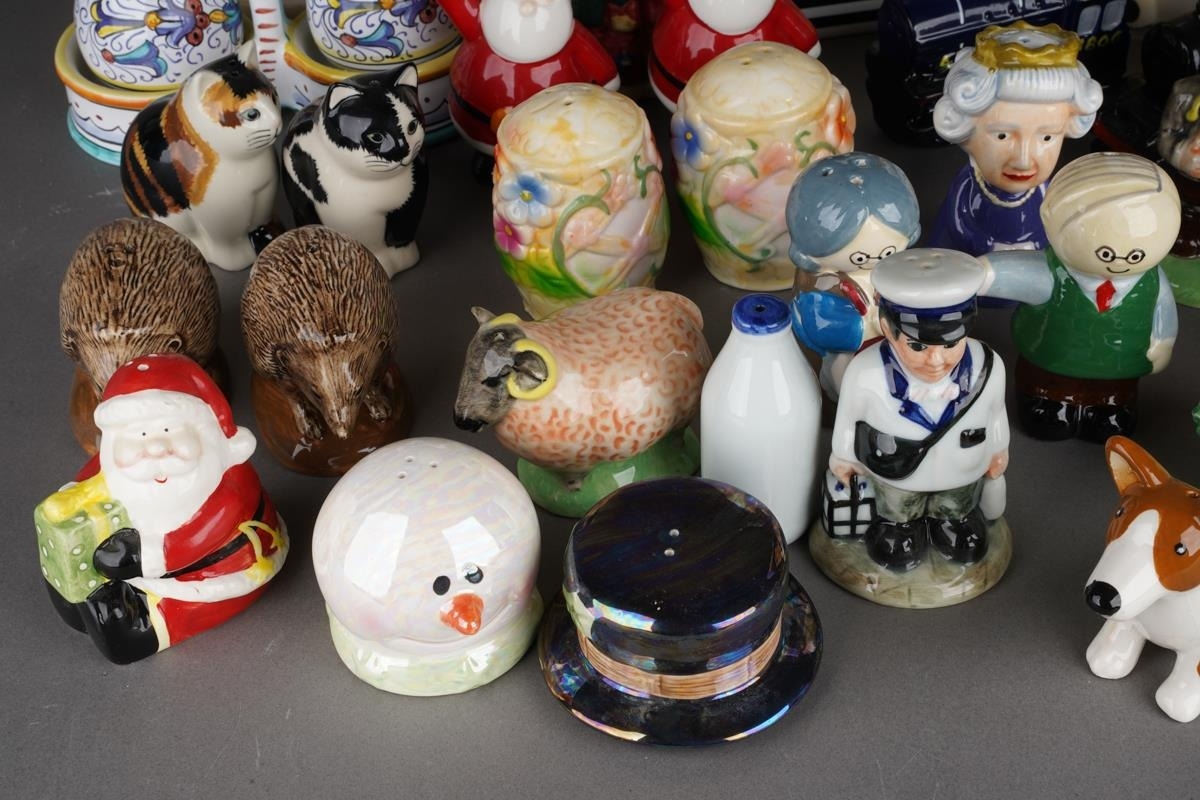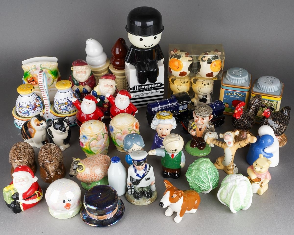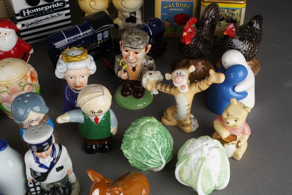 A Lenox Collection The Pooh and Tigger salt & pepper set with Certificate together with further novelty salt and peppers including Chickens, vegetables, Cats, Santa Claus, Trains, Fruit Tins, Dogs, Queen Elizabeth II, Farmers etc [1 box]