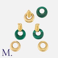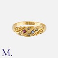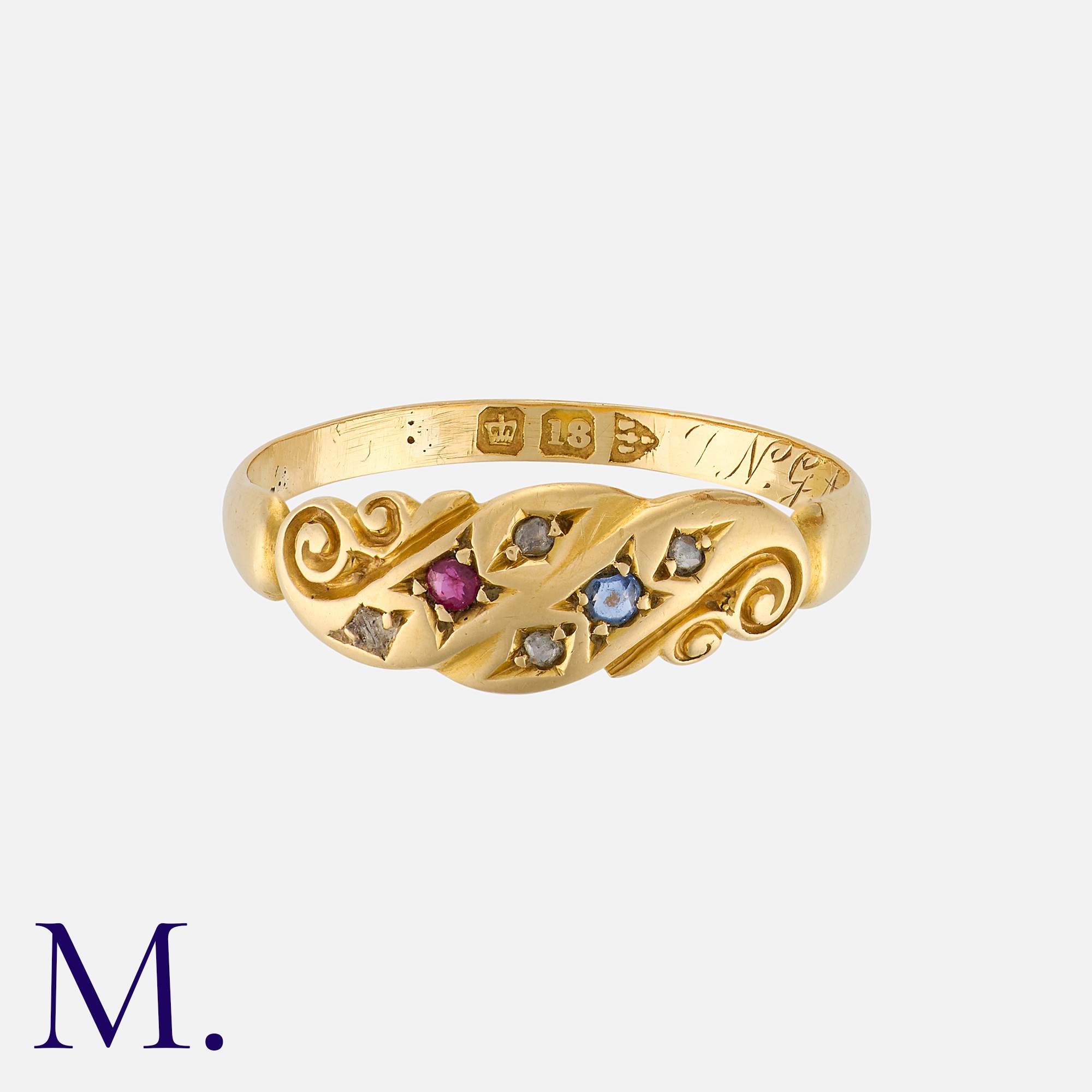 An Antique Ring in 18 carat gold, of scrolling form, set with a ruby and a sapphire, accented by diamonds. Marked 18.