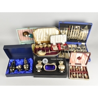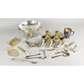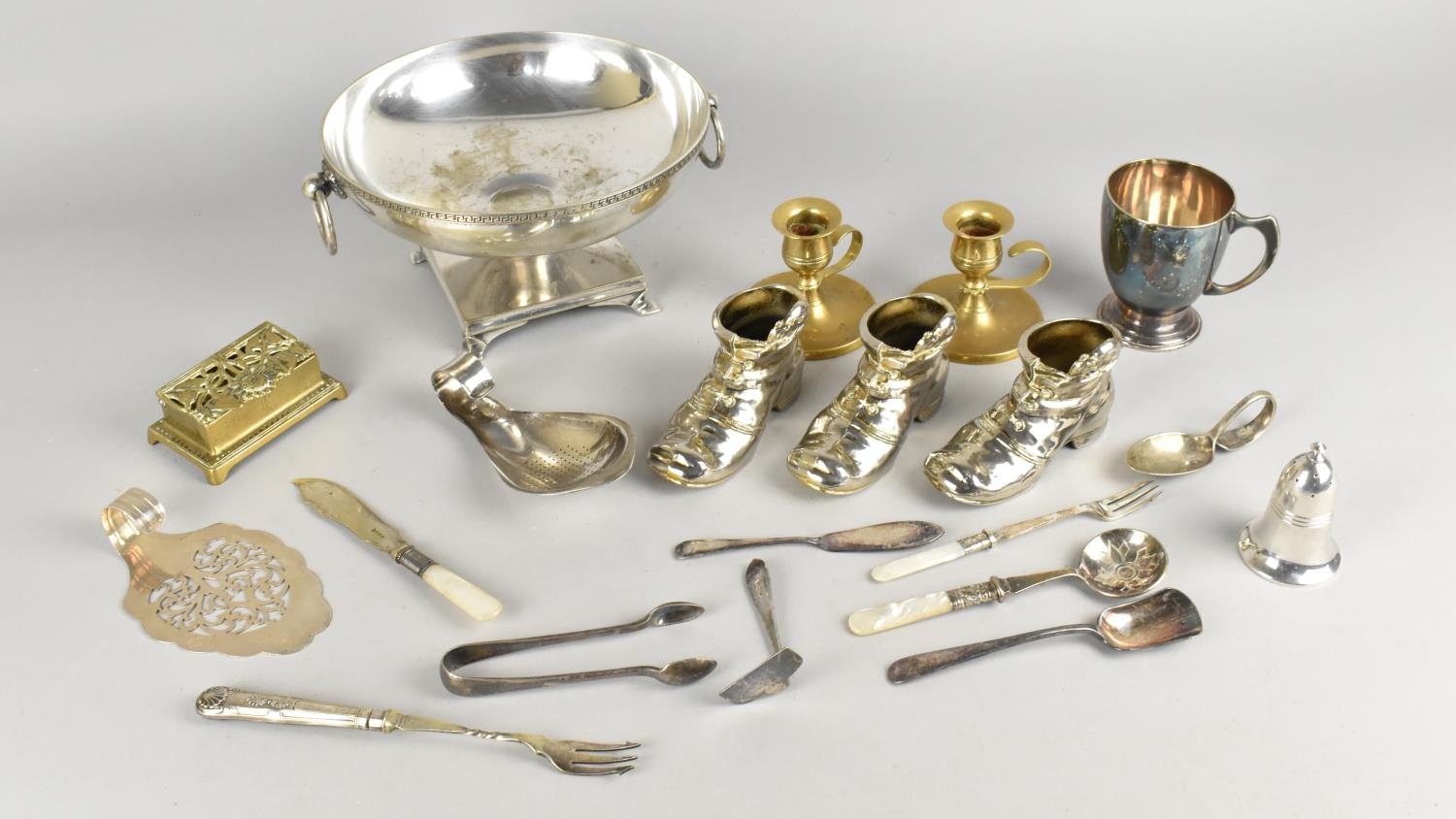A Collection of Metalwares to Comprise Silver Handled Kings Pattern Pickle Fork, Mother of Pearl Handled Cutlery, Silver Plated Twin Handled Pedestal Bowl, Brass Stamp Holder etc