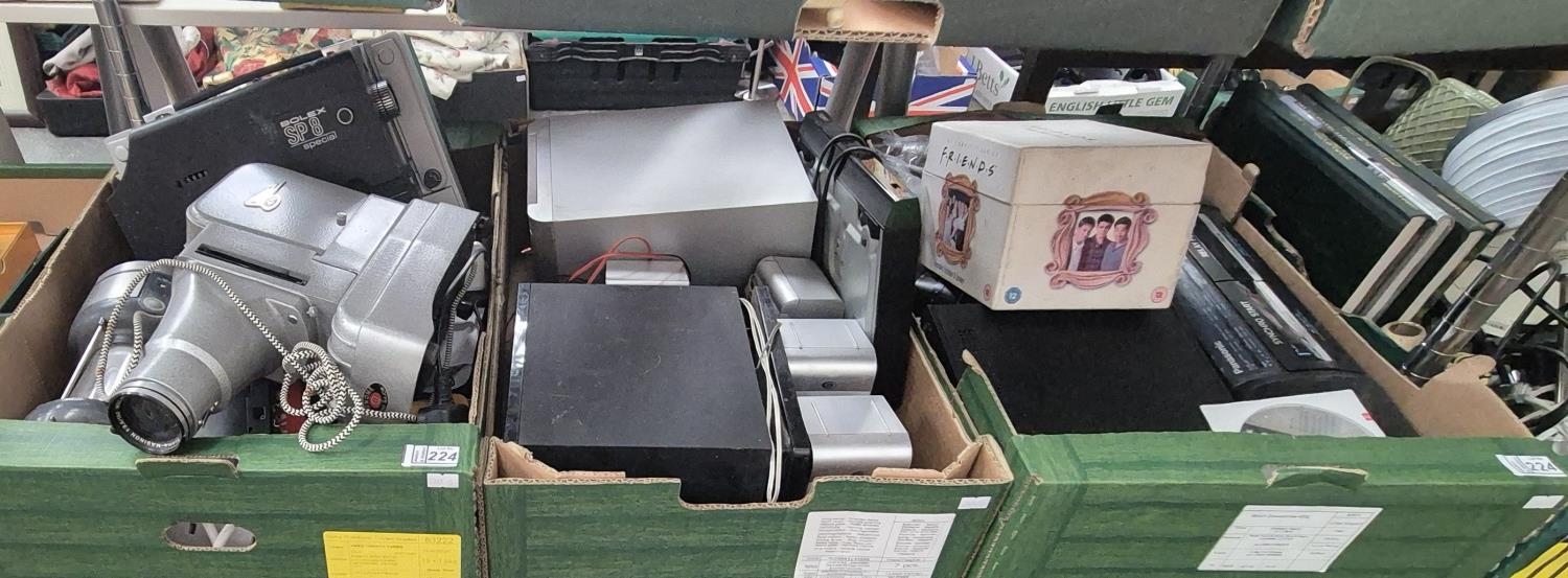3 Boxes containing electronics including projectors, speakers, music systems etc