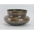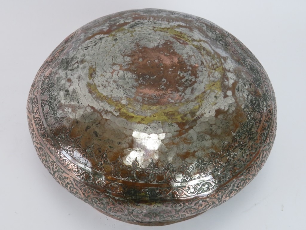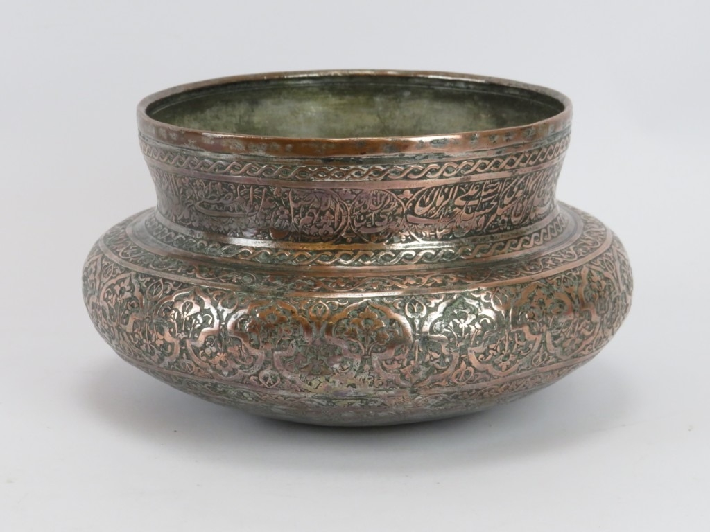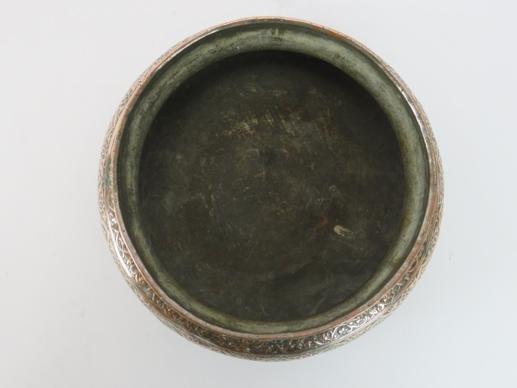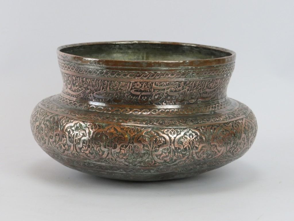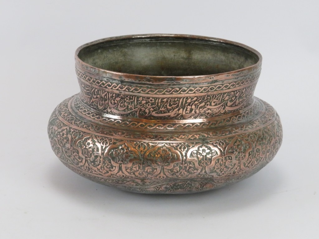 A Persian Safavid tinned copper bowl, Iran, probably 18th century. Decorated with foliate and inscribed bands of decoration. 24 cm diameter.
