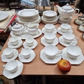 58 pieces of Star Festival bone china in a dainty white with a Greek inspired gilt meander border. The pieces feature an organic notched hexagonal shape. Lovely pieces in very good condition. Including the tea pot.