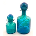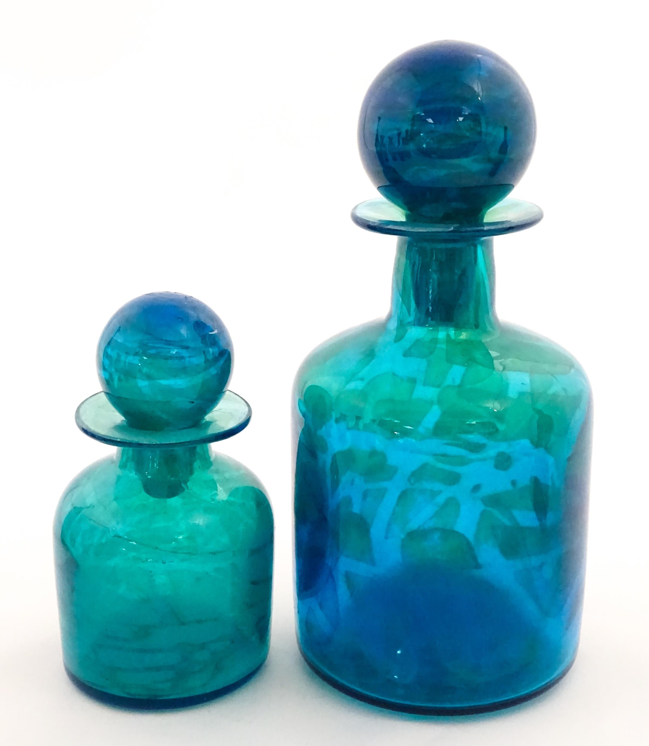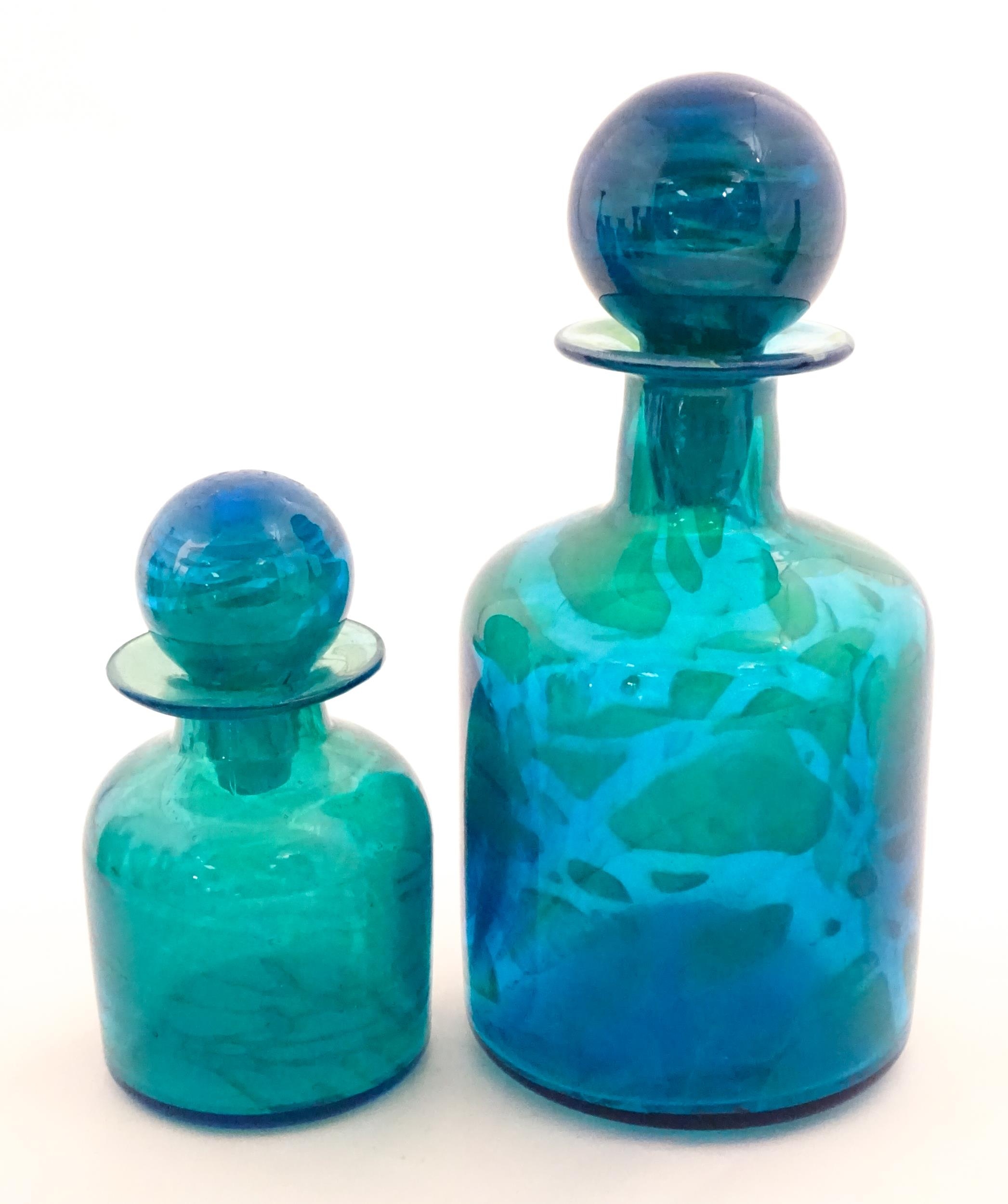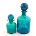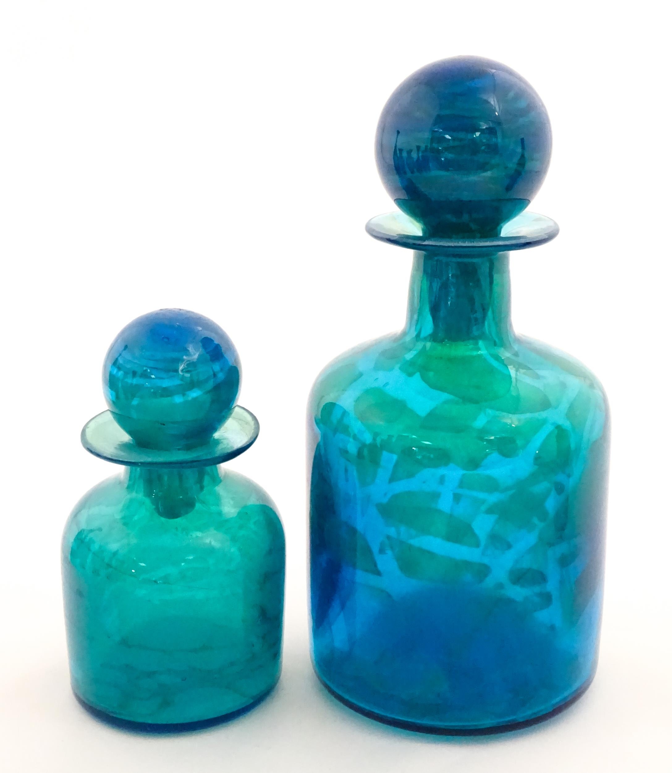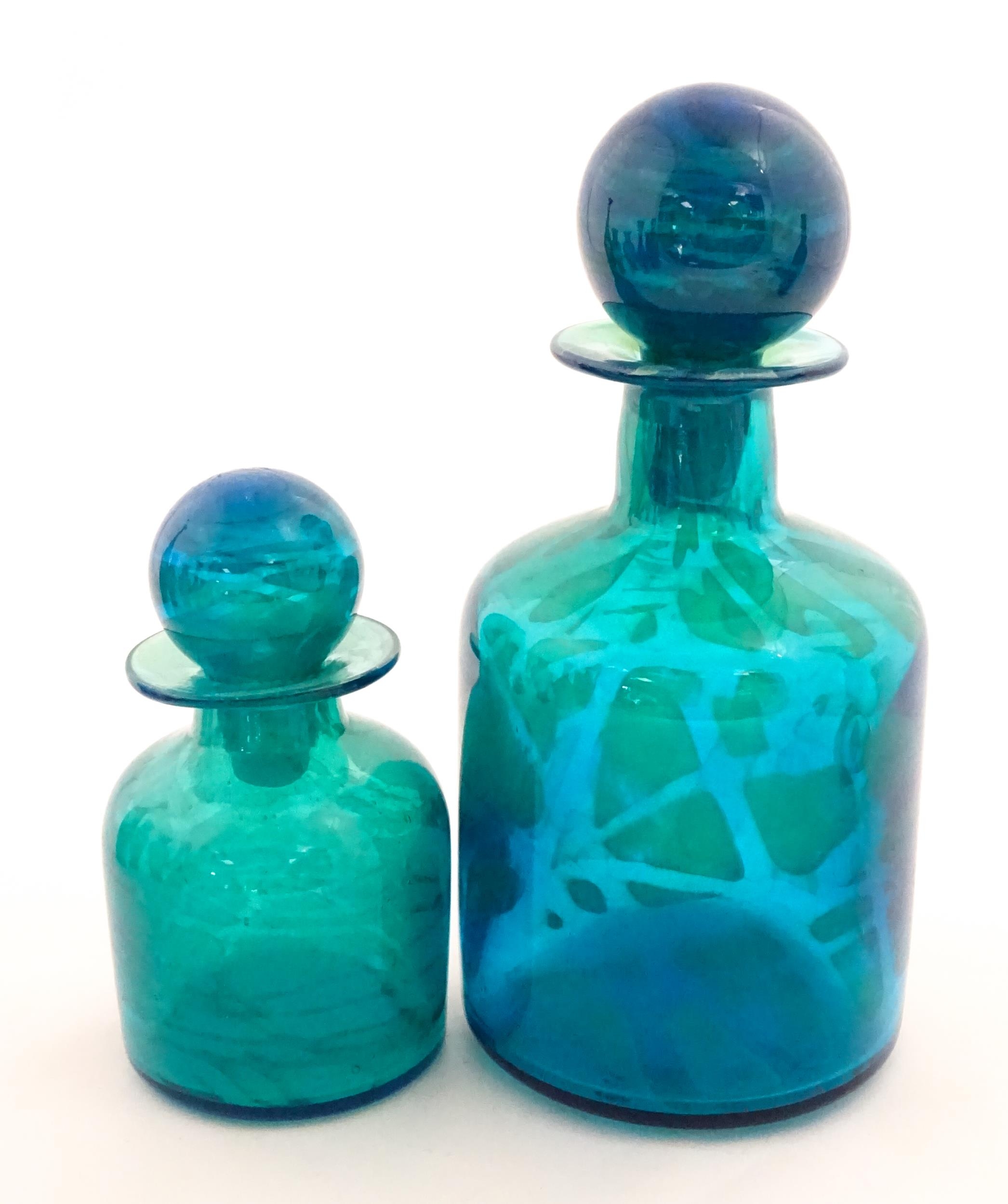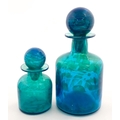 A large Mdina blue glass decanter. Together with a smaller example. Both signed Mdina under. Largest approx. 12" high (2)