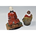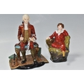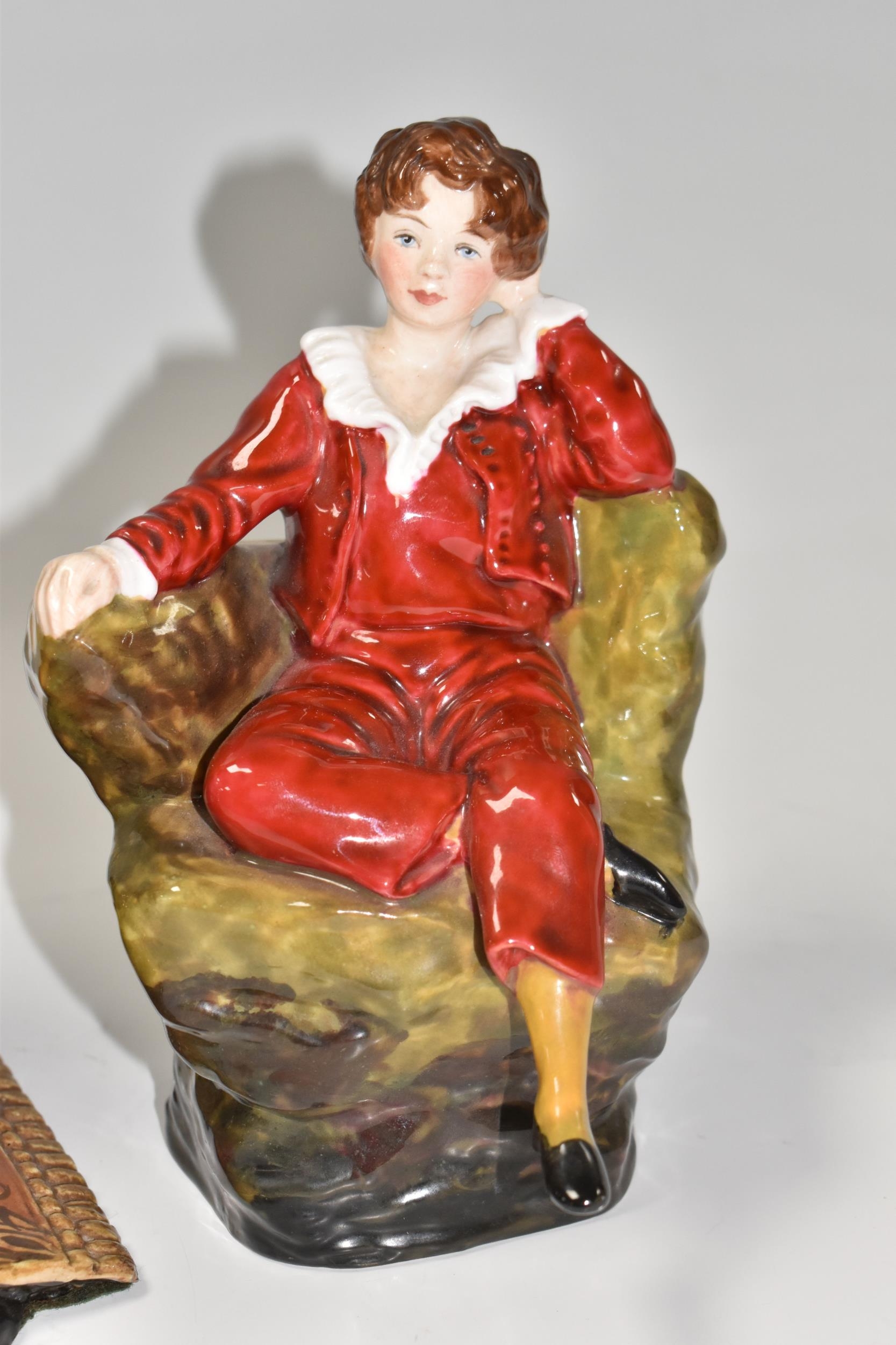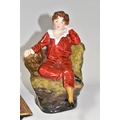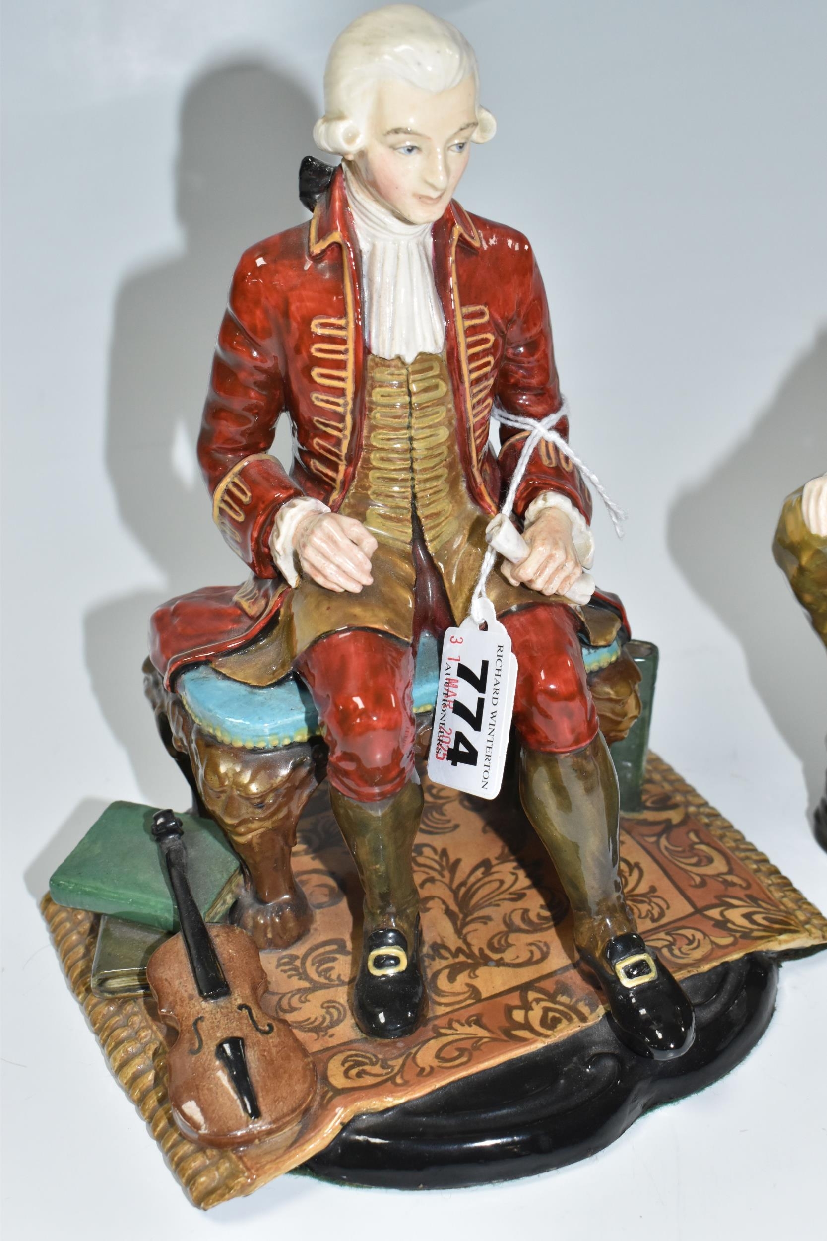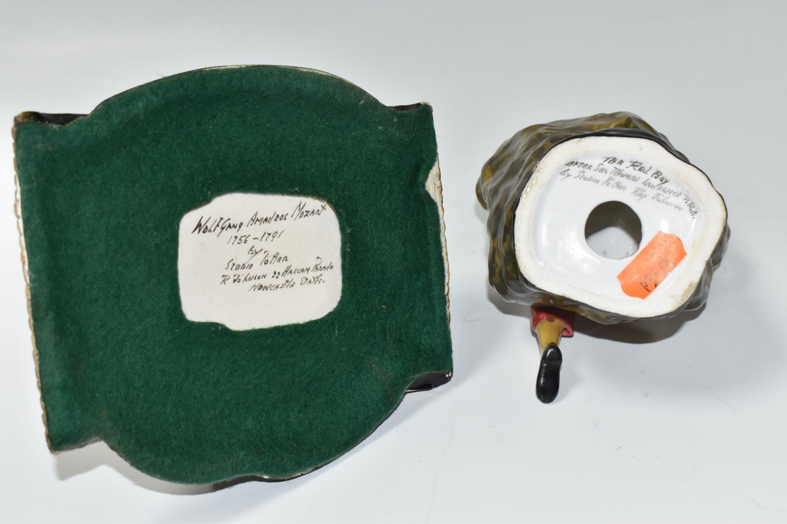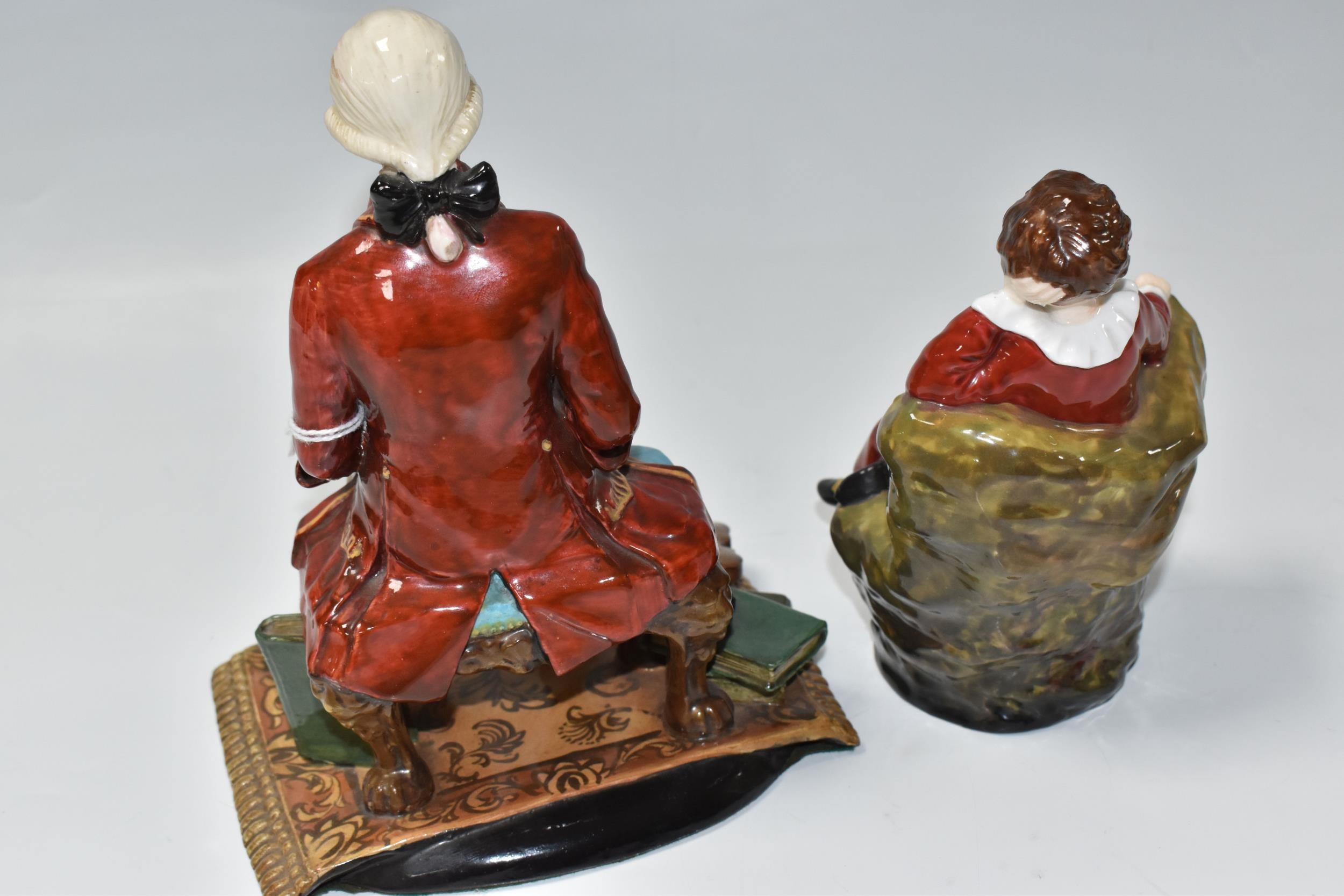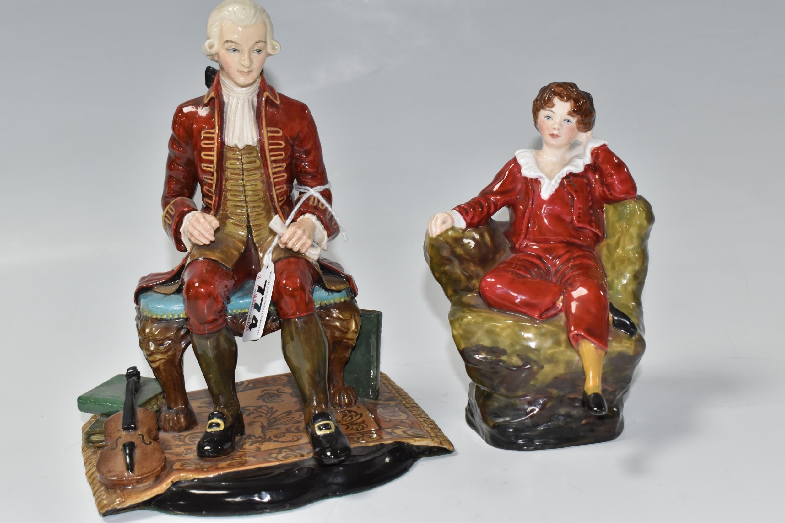 TWO REG JOHNSON FIGURES, comprising Wolfgang Amadeus Mozart 1756-1791, modelled sitting on a stool beside a violin and a pile of books, signed to base, height 20cm (tiny chip and possible restoration on corners of rug), together with The Red Boy, signed to base, height 14.5cm (2) (Condition Report: generally ok, specific obvious damage as stated)