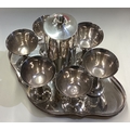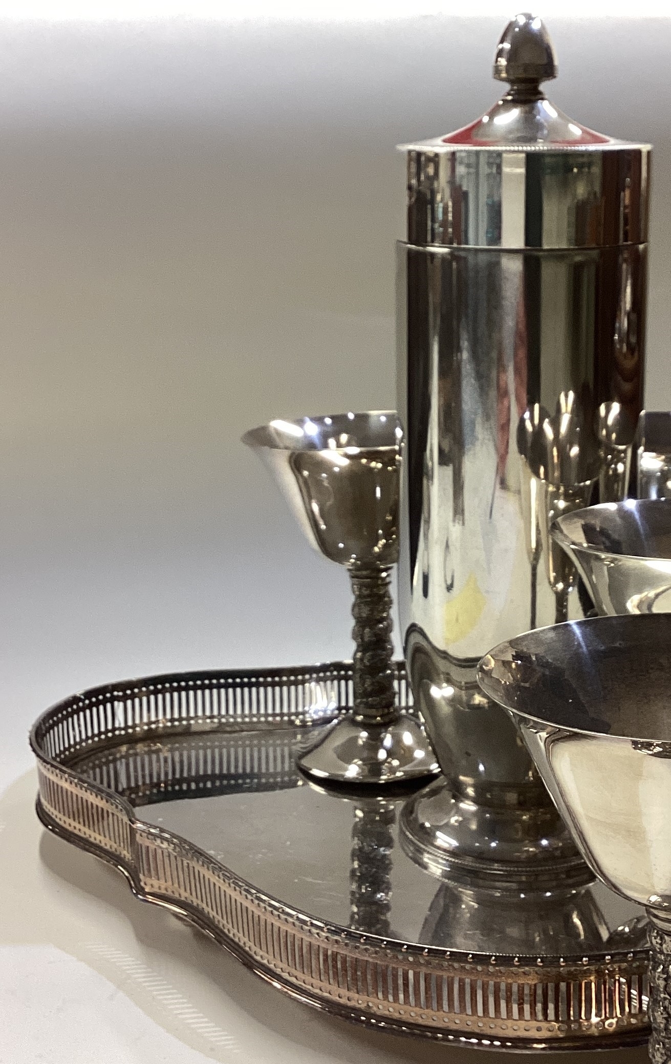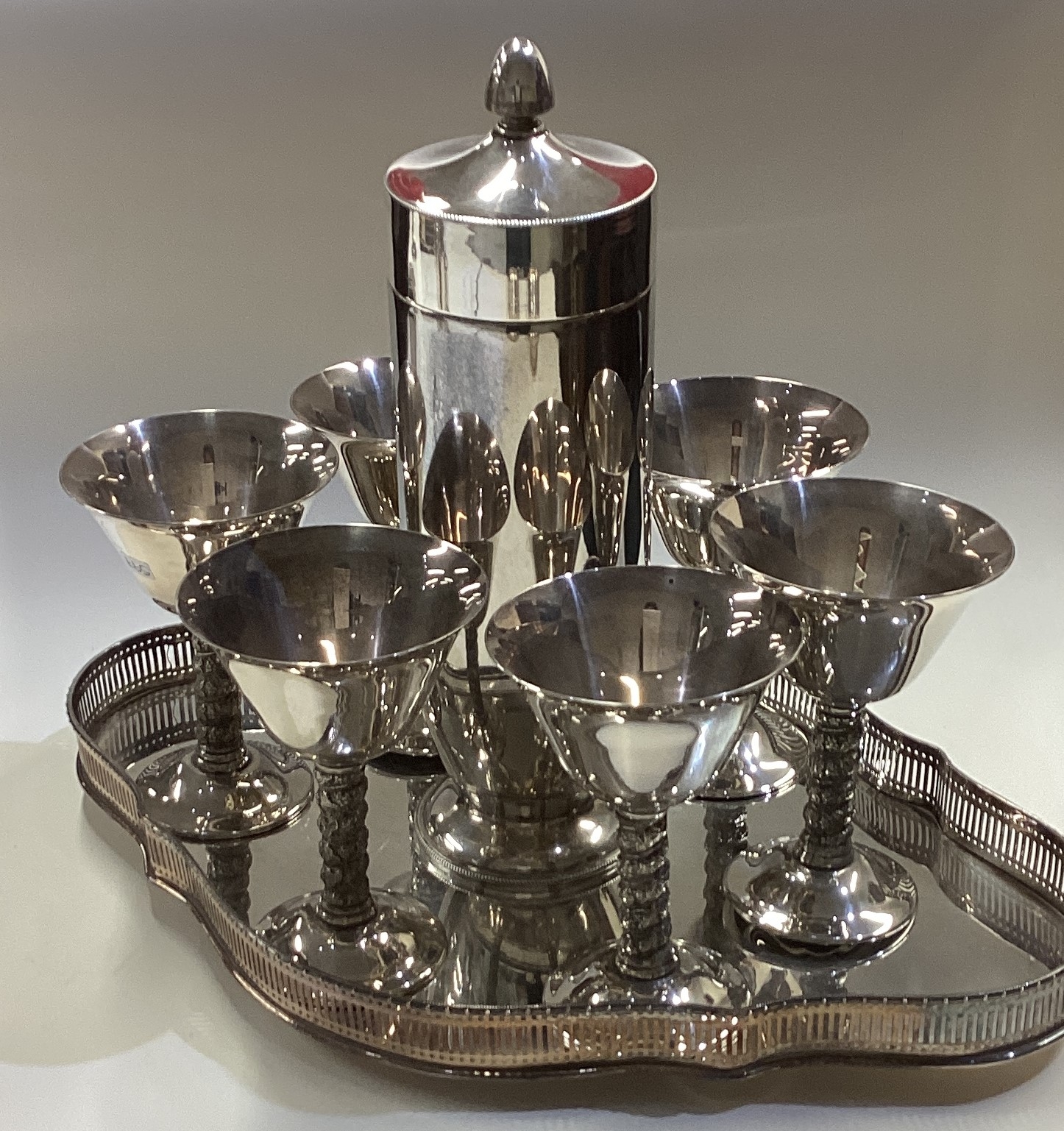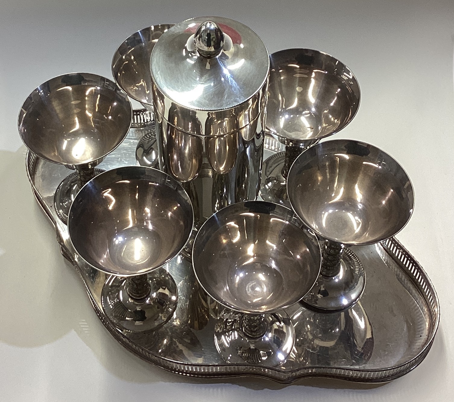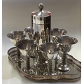 A good silver plated cocktail shaker on tray with six goblets. Est. £50 - £80.