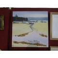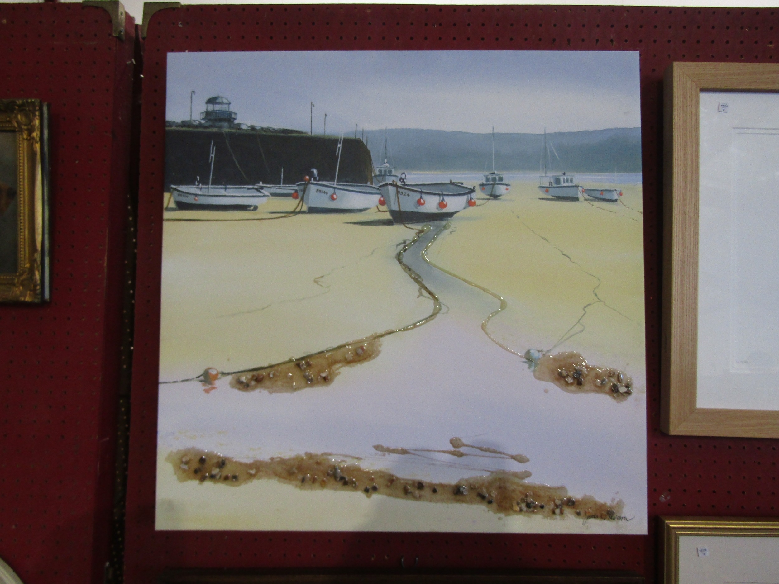 JUDI TREVORROW: A mixed media canvas wrap-around titled "Waiting for the Tide I", signed lower right, 60cm x 60cm