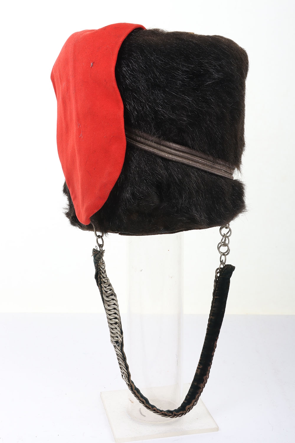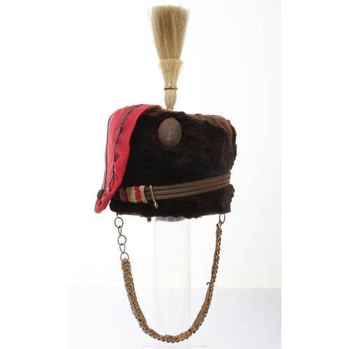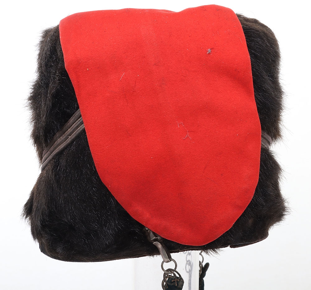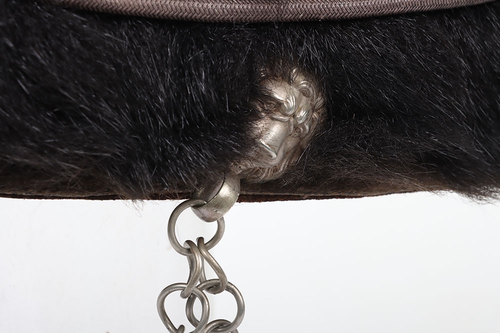 Westmoreland and Cumberland Yeomanry Cavalry Busby. Victorian pre 1897 Senior NCO’s black sealskin busby with plain scarlet bag, lions head chin chain hooks, stitched on silver triple cord cap lines, WM chin chain, crimson headband & lining height at front 7 ½” . In worn and damaged condition with wear to edges and bald patches to fur.