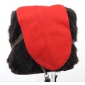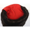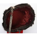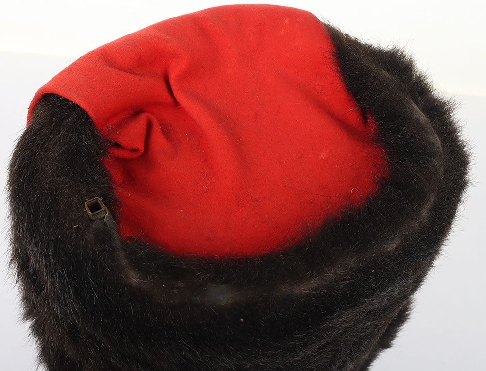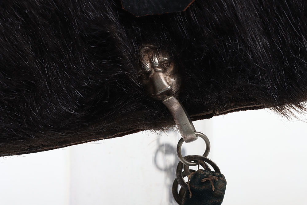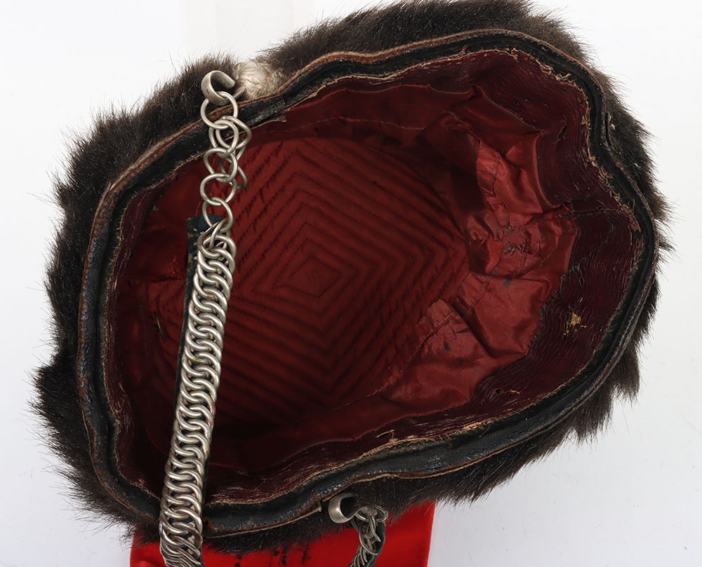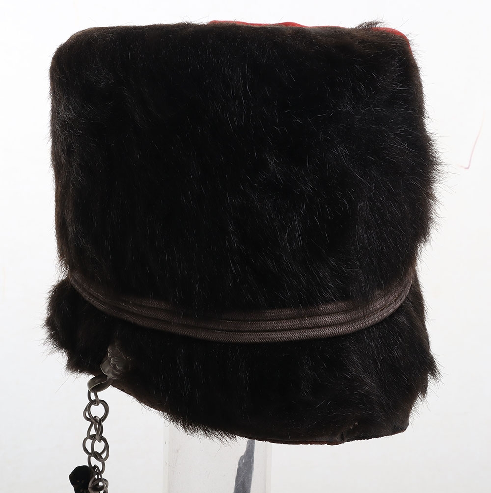 Westmoreland and Cumberland Yeomanry Cavalry Busby. Victorian pre 1897 Senior NCO’s black sealskin busby with plain scarlet bag, lions head chin chain hooks, stitched on silver triple cord cap lines, WM chin chain, crimson headband & lining height at front 7 ½” . In worn and damaged condition with wear to edges and bald patches to fur.
