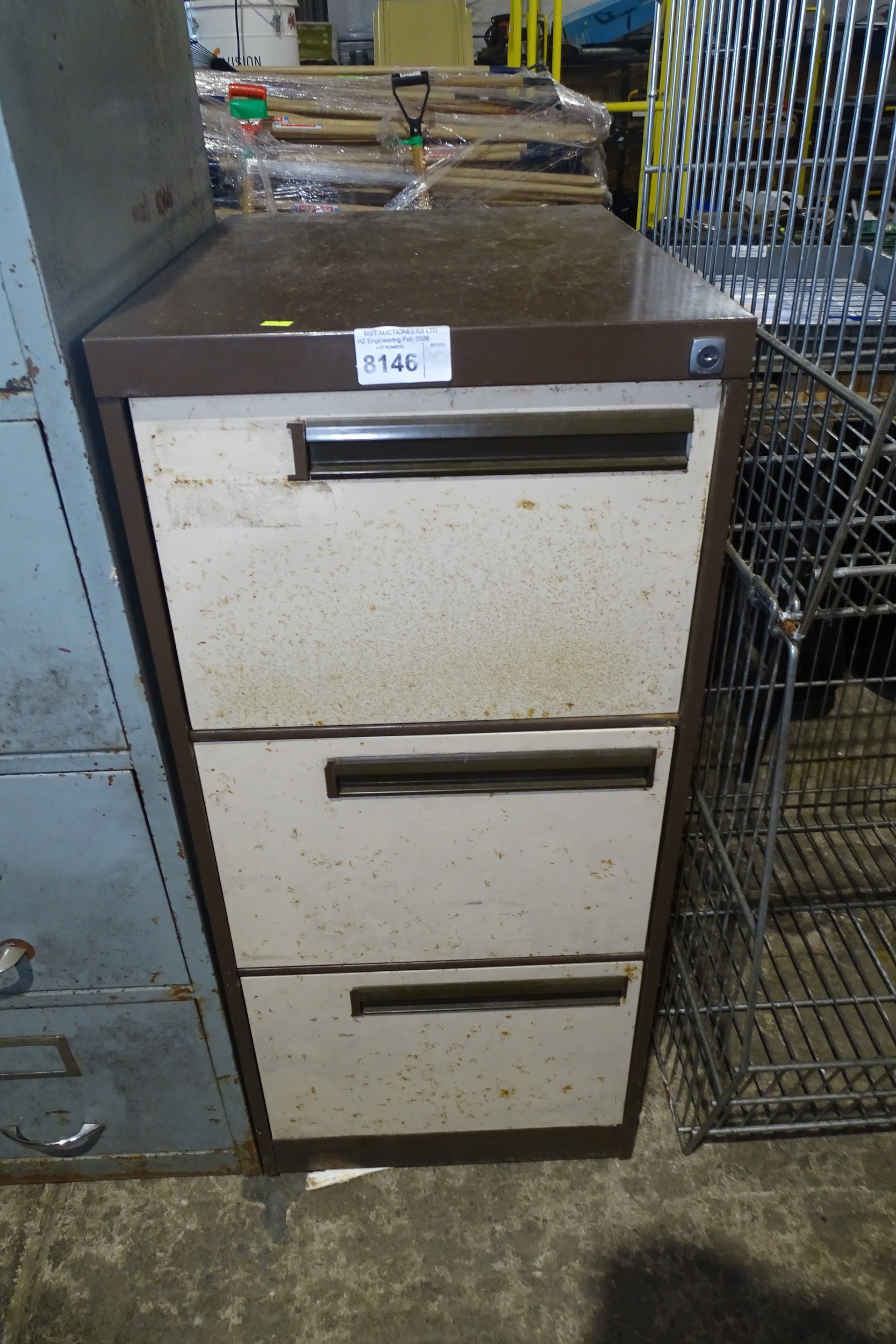 A brown metal three drawer filing cabinet, some drawers contain various engineering items / tools. Not practical to list in detail so please view or see photographs