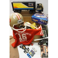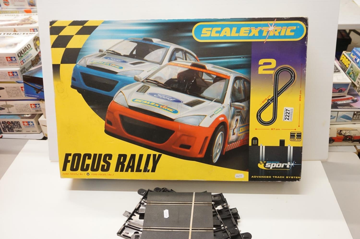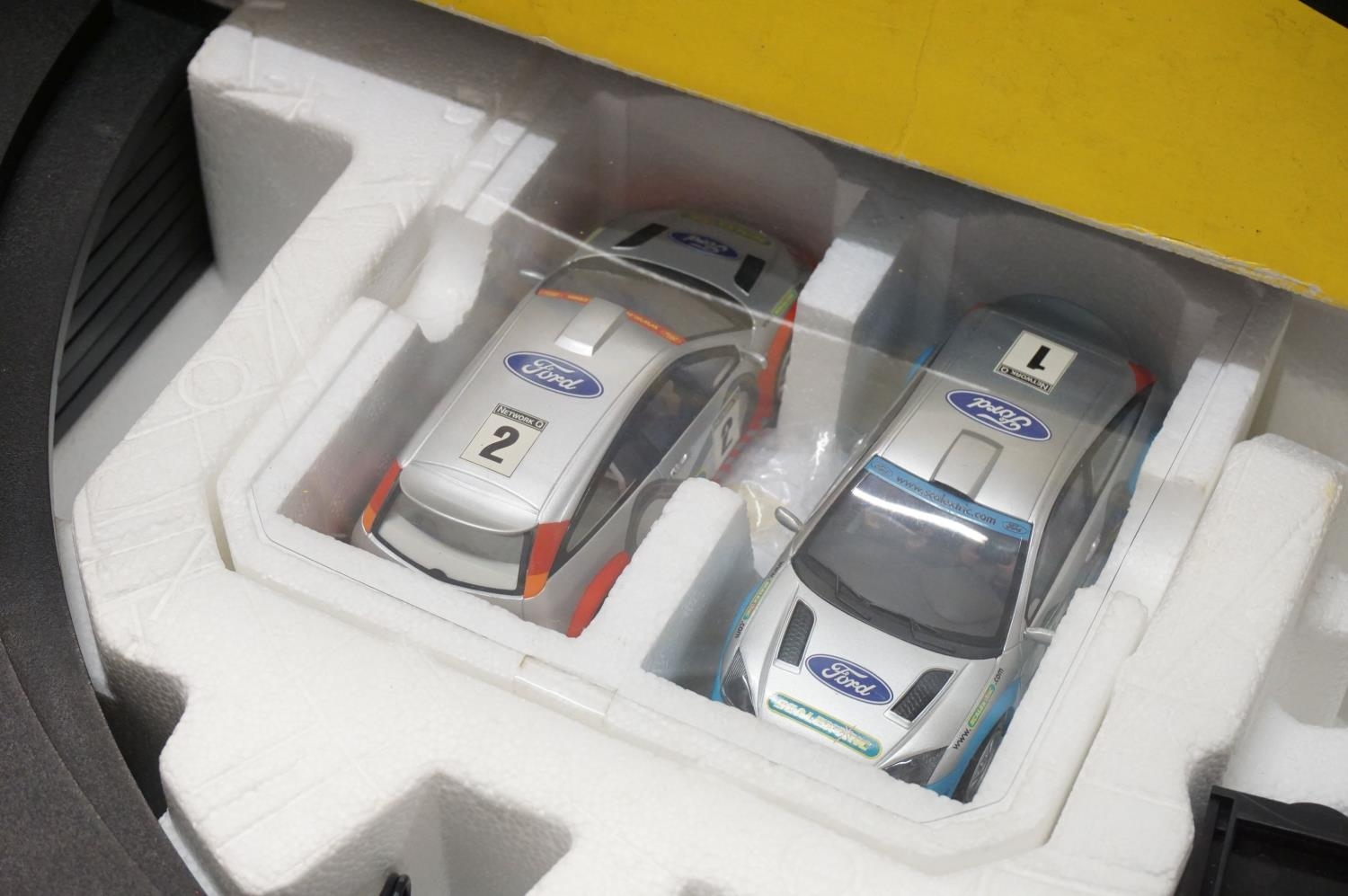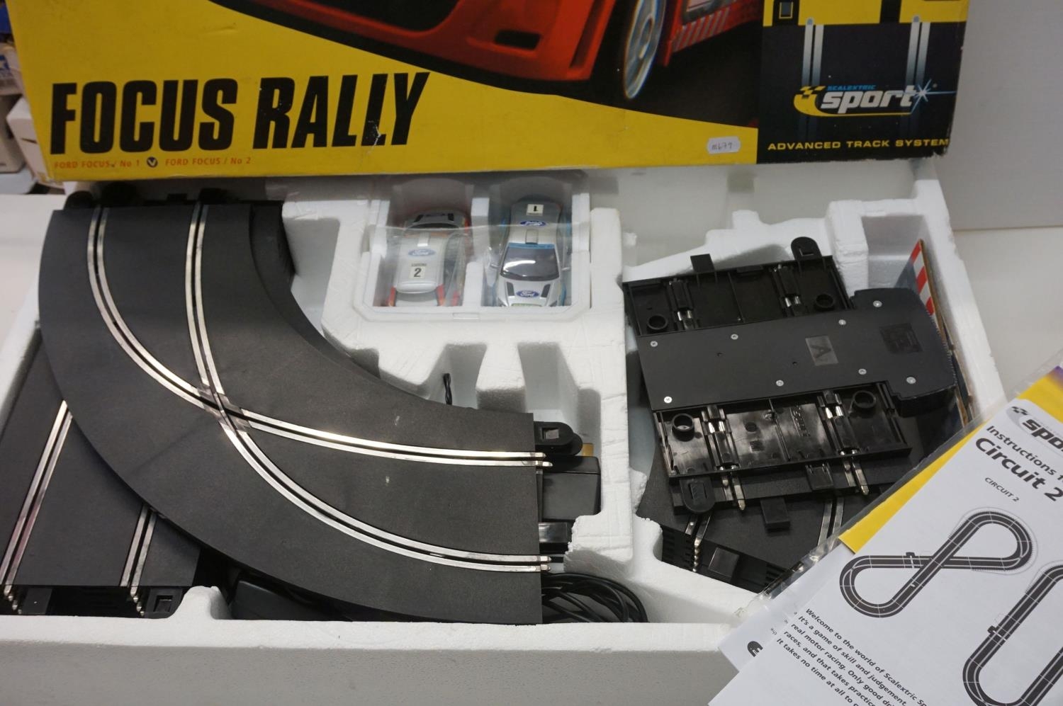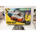 Boxed Scalextric 1095 Focus Rally with two stock cars, appearing complete but unchecked. Plus a quantity of track