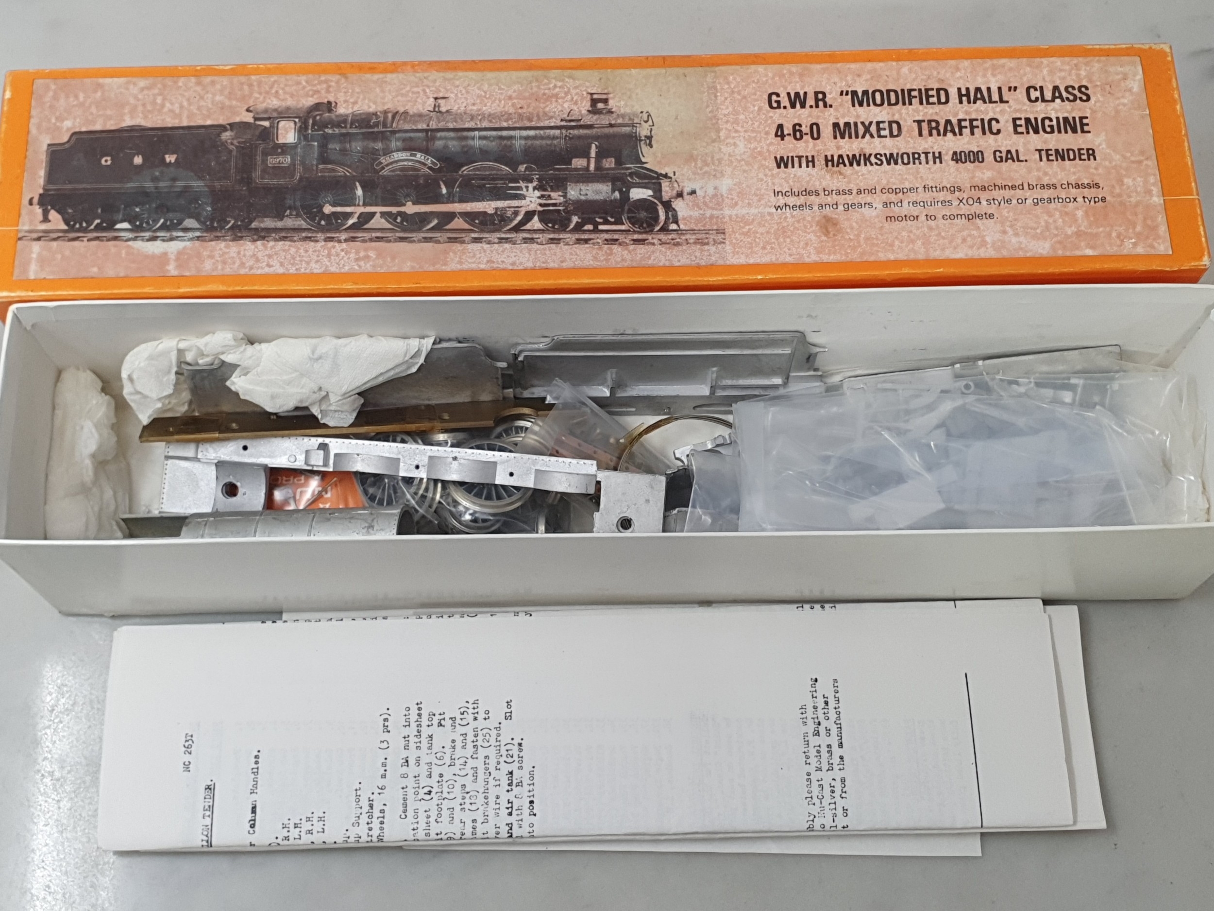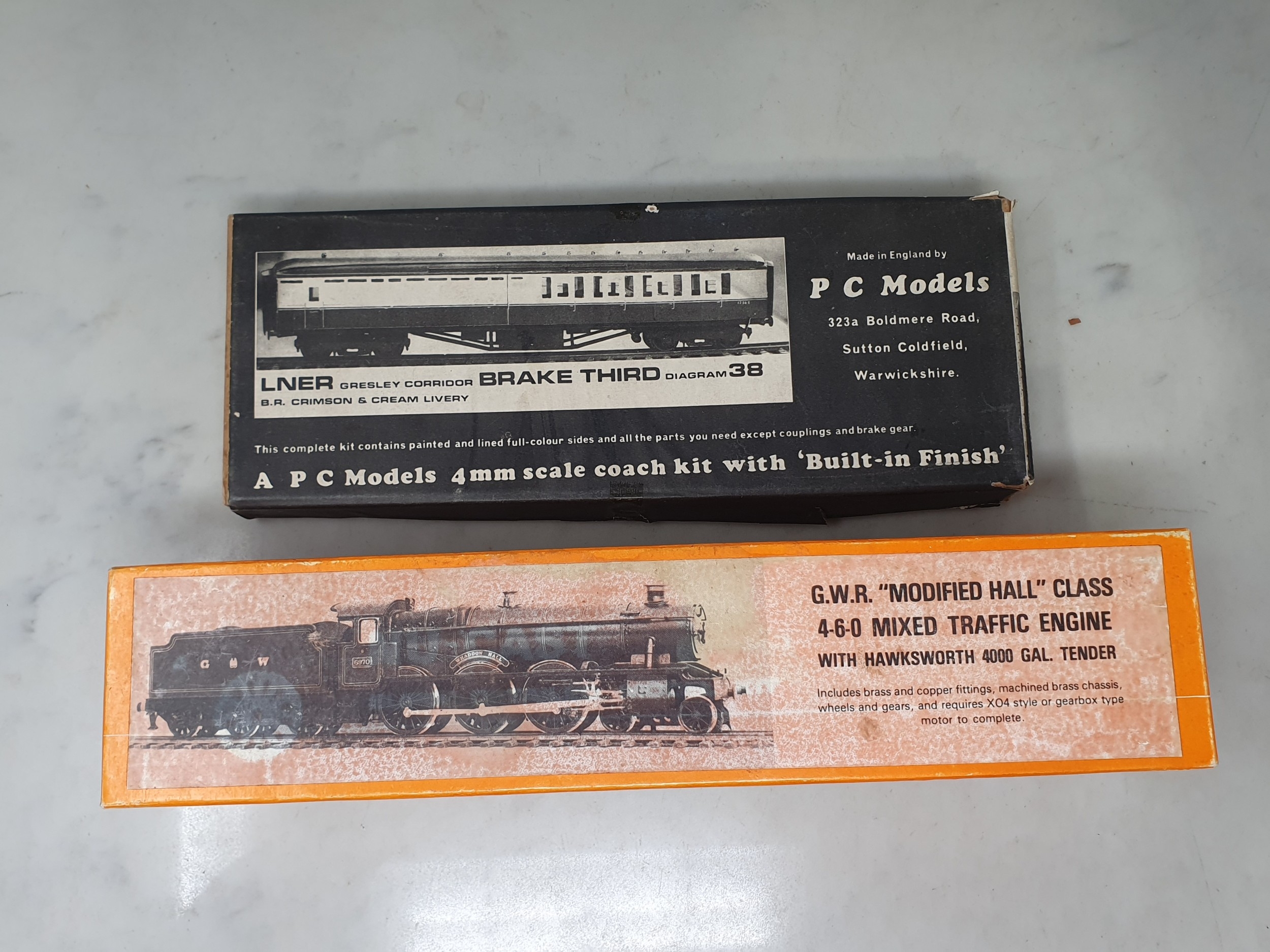 A boxed Nu-Cast white metal and brass 4mm scale Kit of a GWR 'Modified Hall' Class 4-6-0, appears complete; together with a boxed P C Models LNER Gresley Corridor Brake/3rd Coach Kit, appears complete