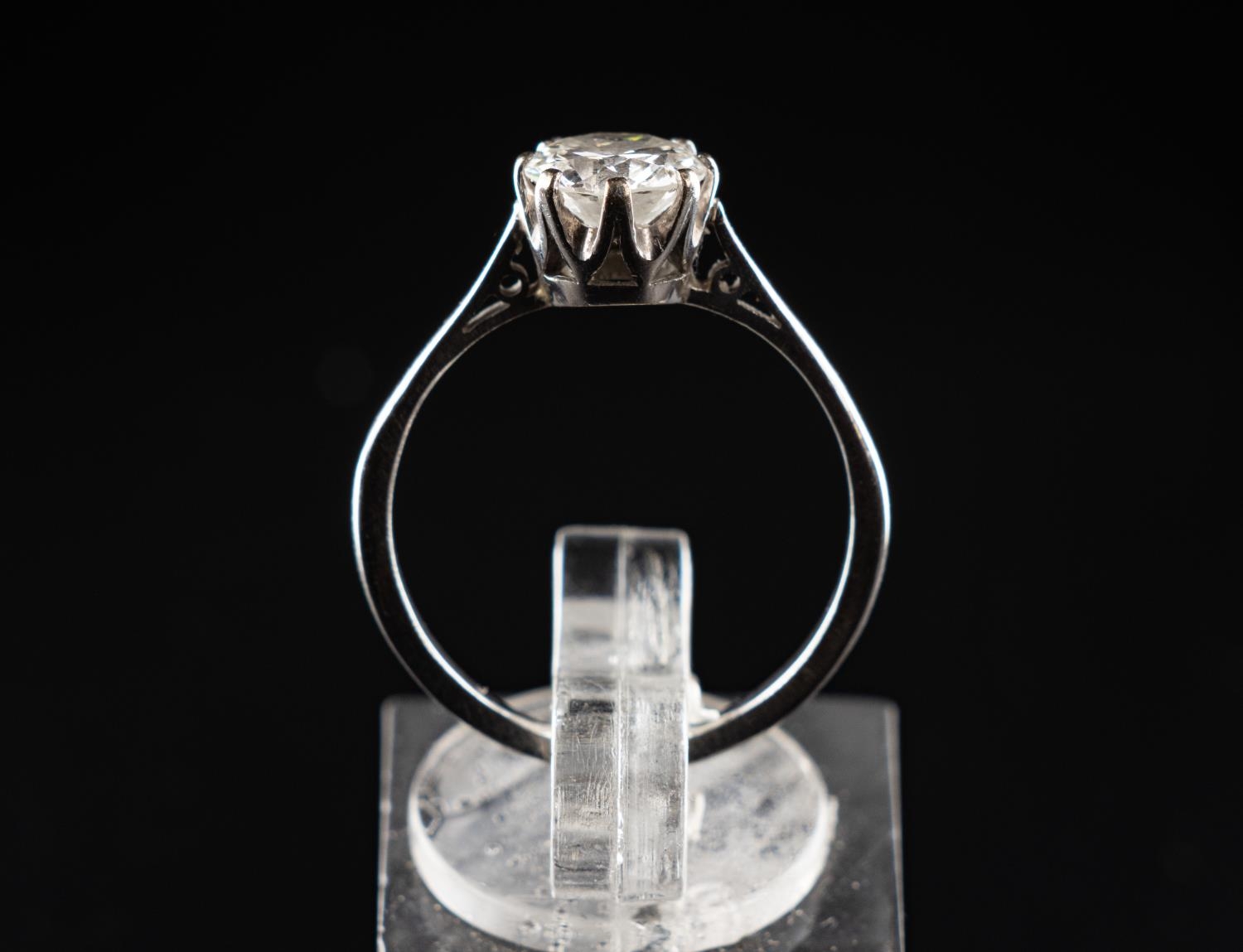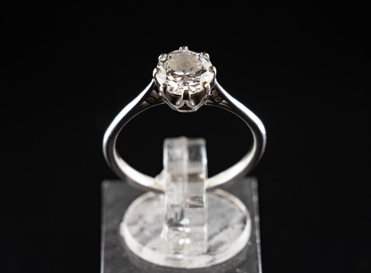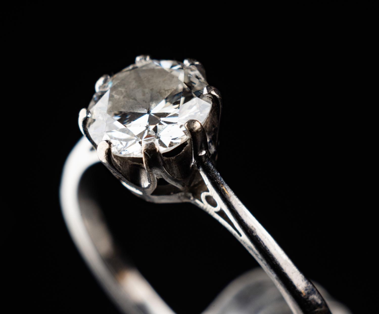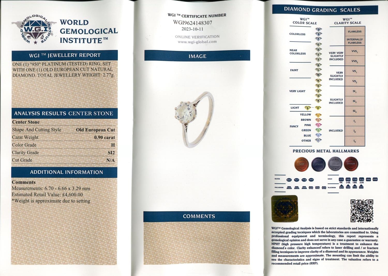 Platinum (950) ring set with one 0.90 carat Old European Cut diamond. Clarity SI2, colour grade H. Total weight 2.77 grams