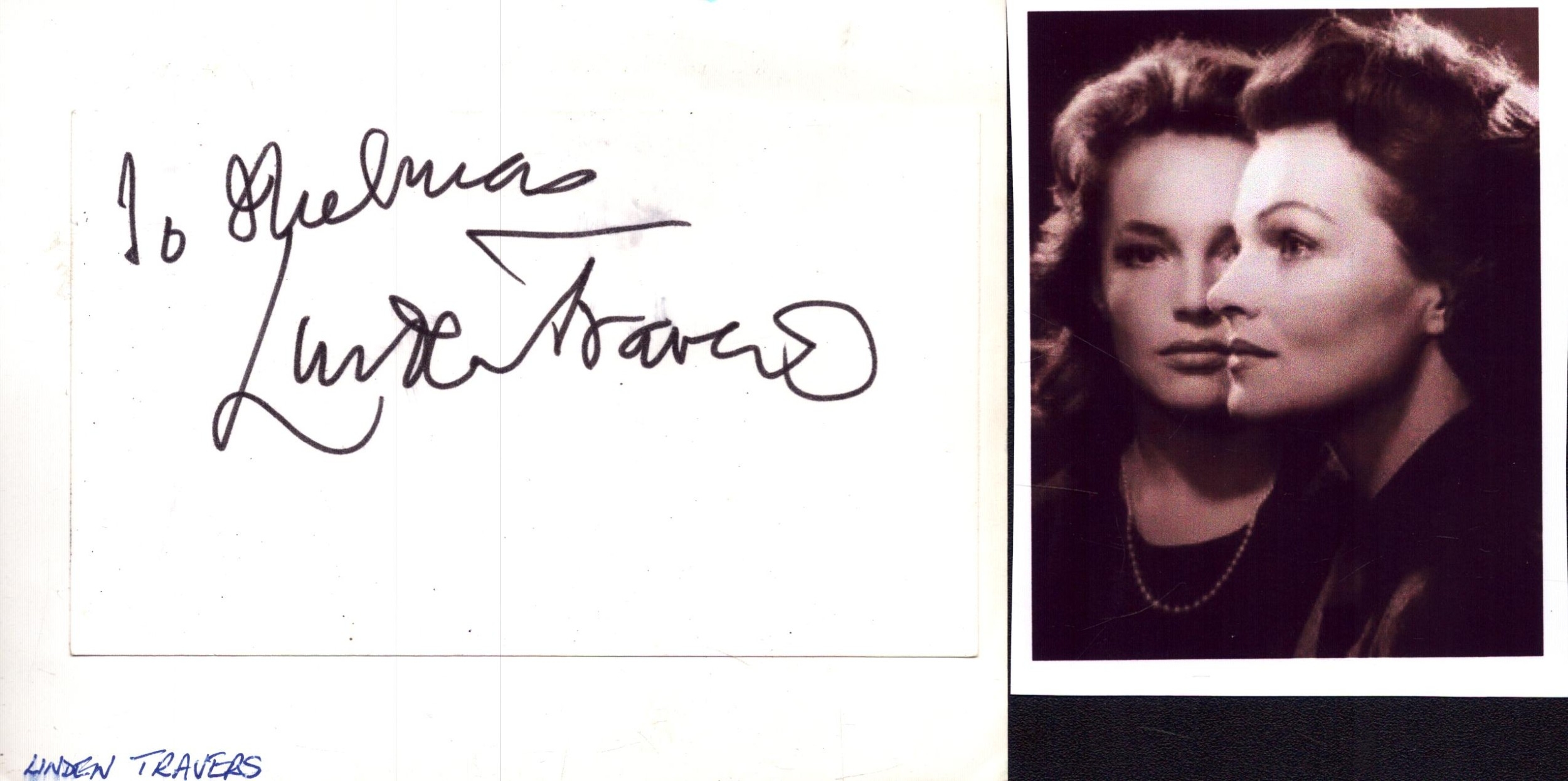 Linden Travers signed signature piece with black and white photo, DEDICATED.