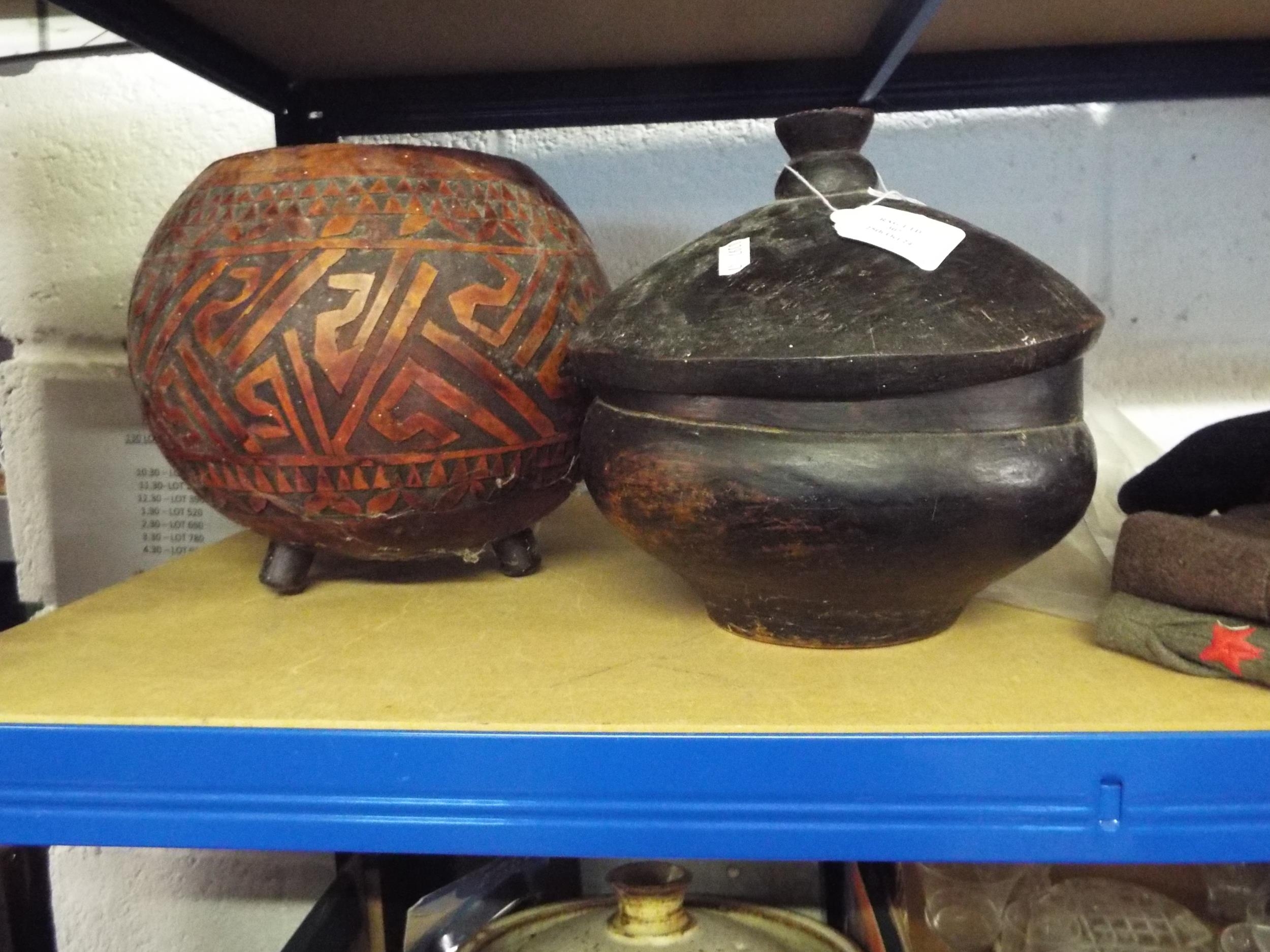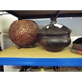 A hand carved coconut bowl and lidded pot