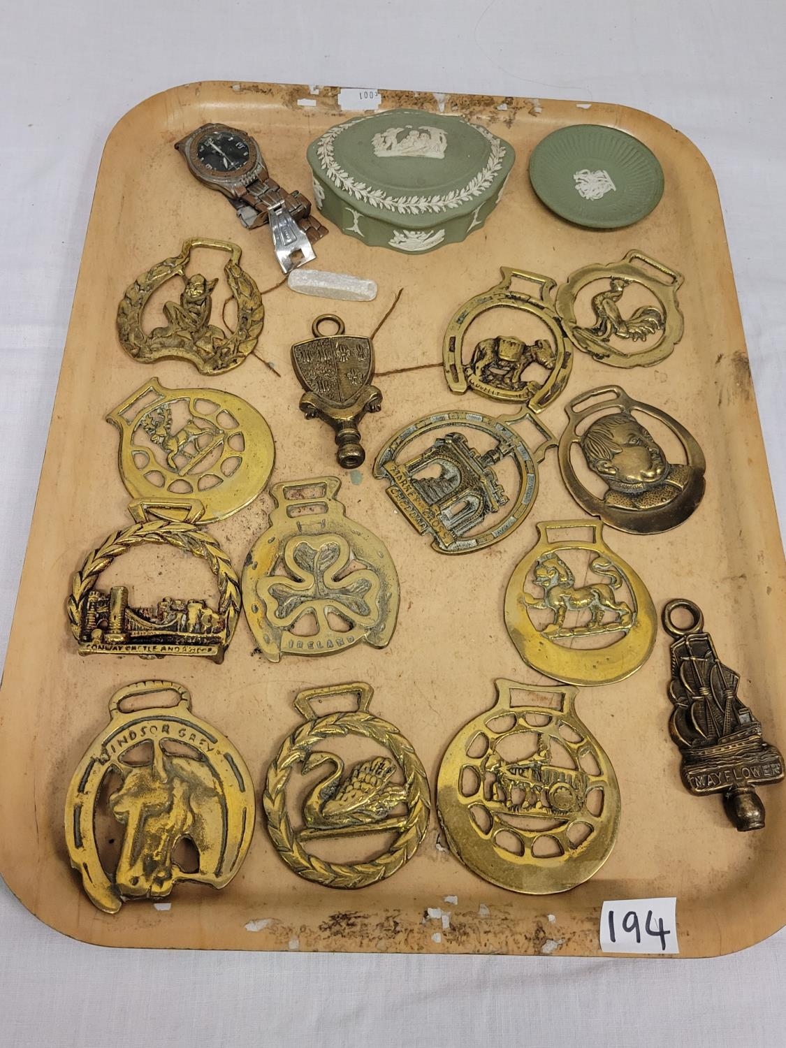 Tray of Brass Horse Brasses, Green Wedgwood Jasperware & Watch (A/F).