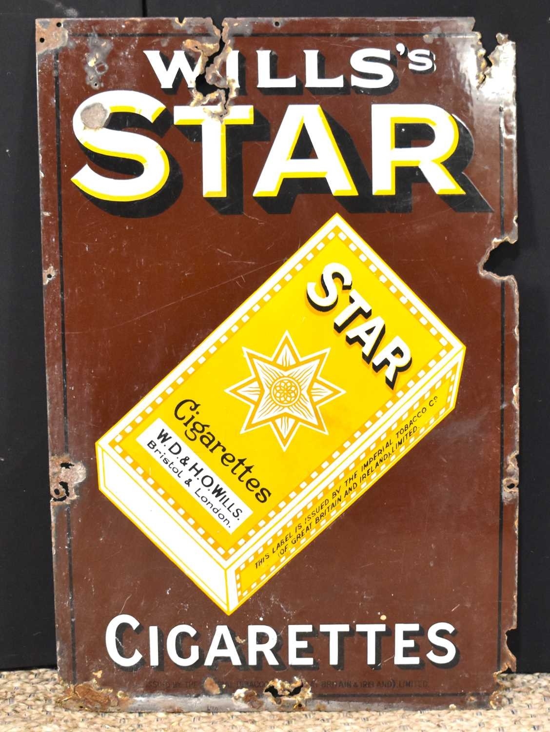 Enamel signs: A vintage Will's Star Cigarettes enamel advertising sign, 91.5cm by 61cm.