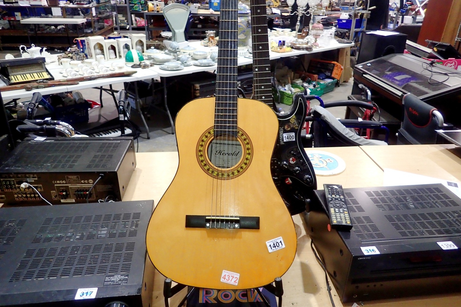 Herald HL34 six string acoustic guitar with Hercules stand and music book. Not available for in-house P&P