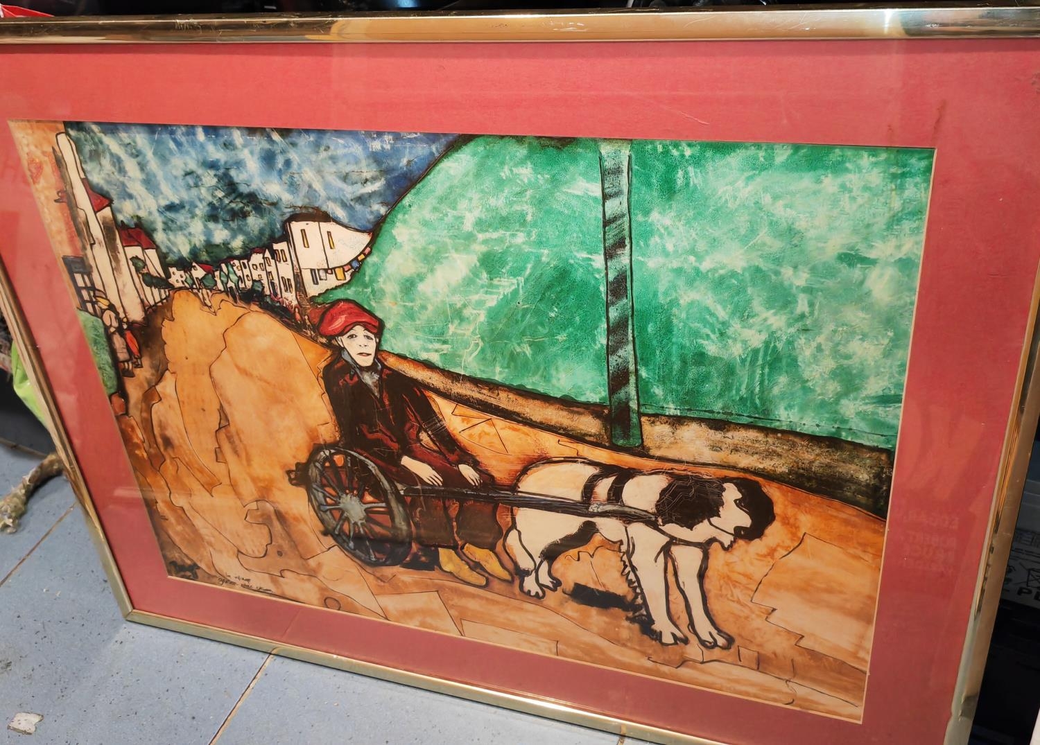 Framed And Glazed Paint The Boy And The Dog Cart Belge Signed Bags Size 71Cm X 92Cm