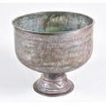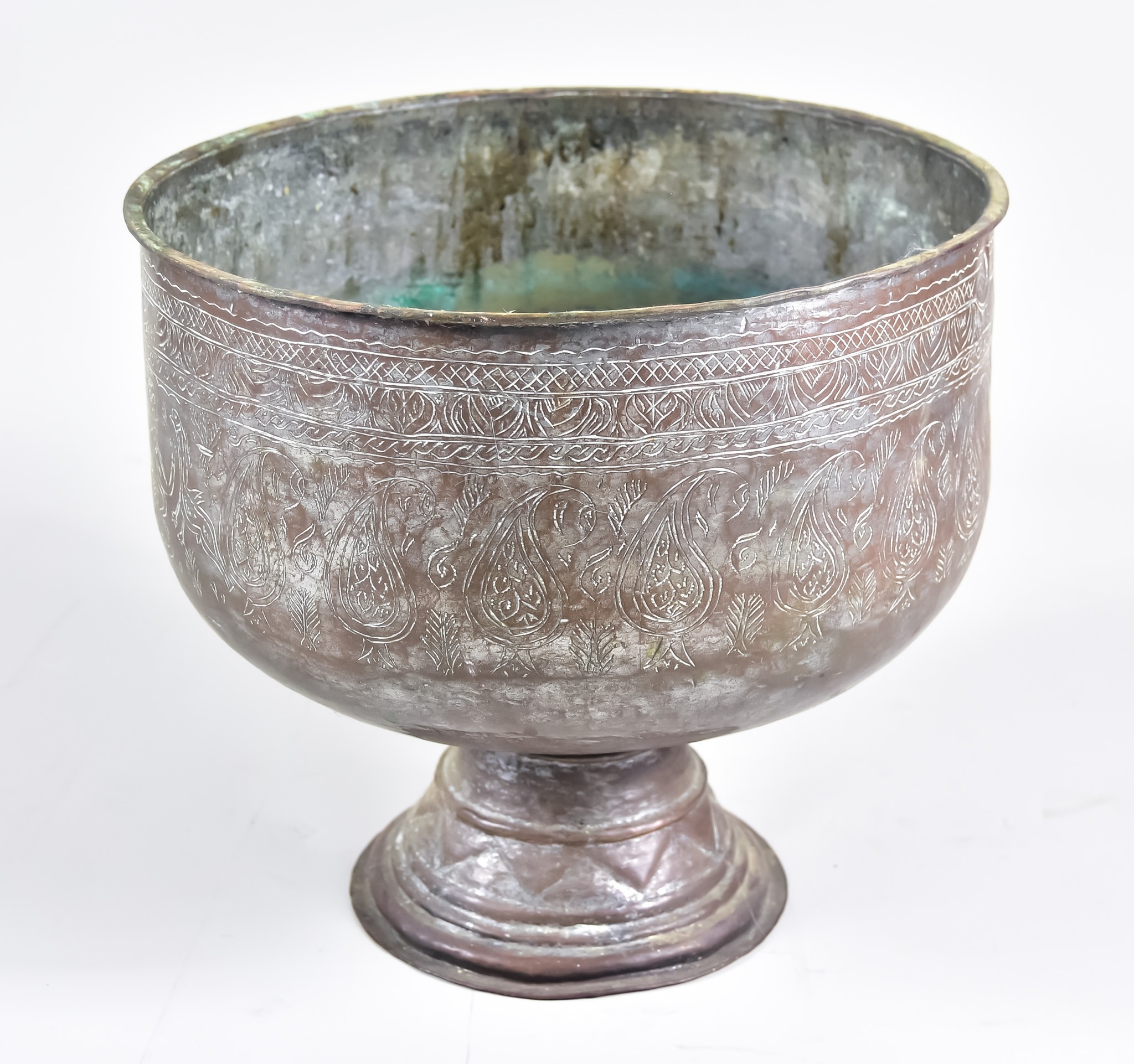 An Iranian, possibly Qajar Tinned Copper Pedestal Bowl, engraved with bands of pelmettes and geometric ornament, on tapered pedestal foot, 12.75ins (32.5cm) x 12ins (30.5cm) high