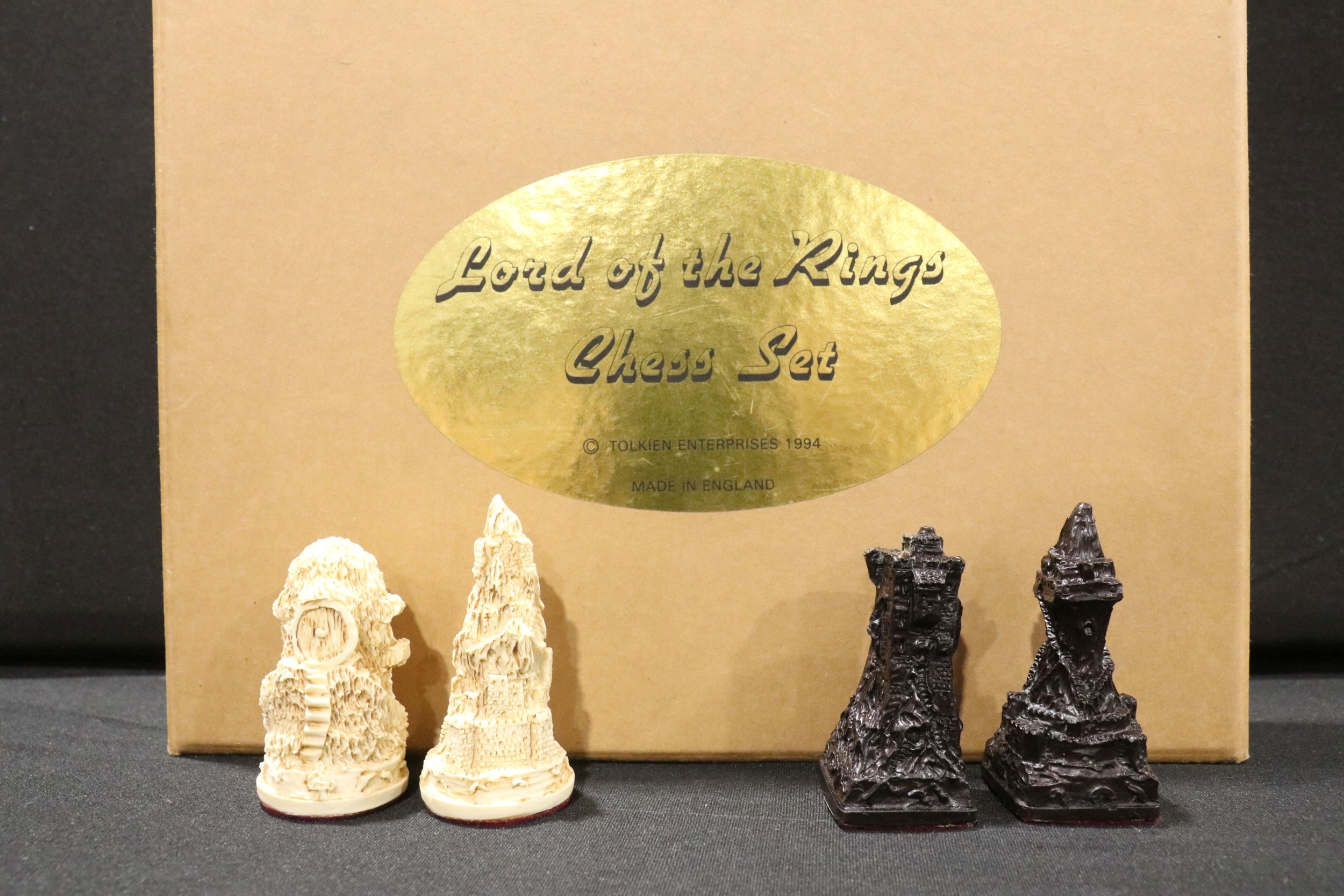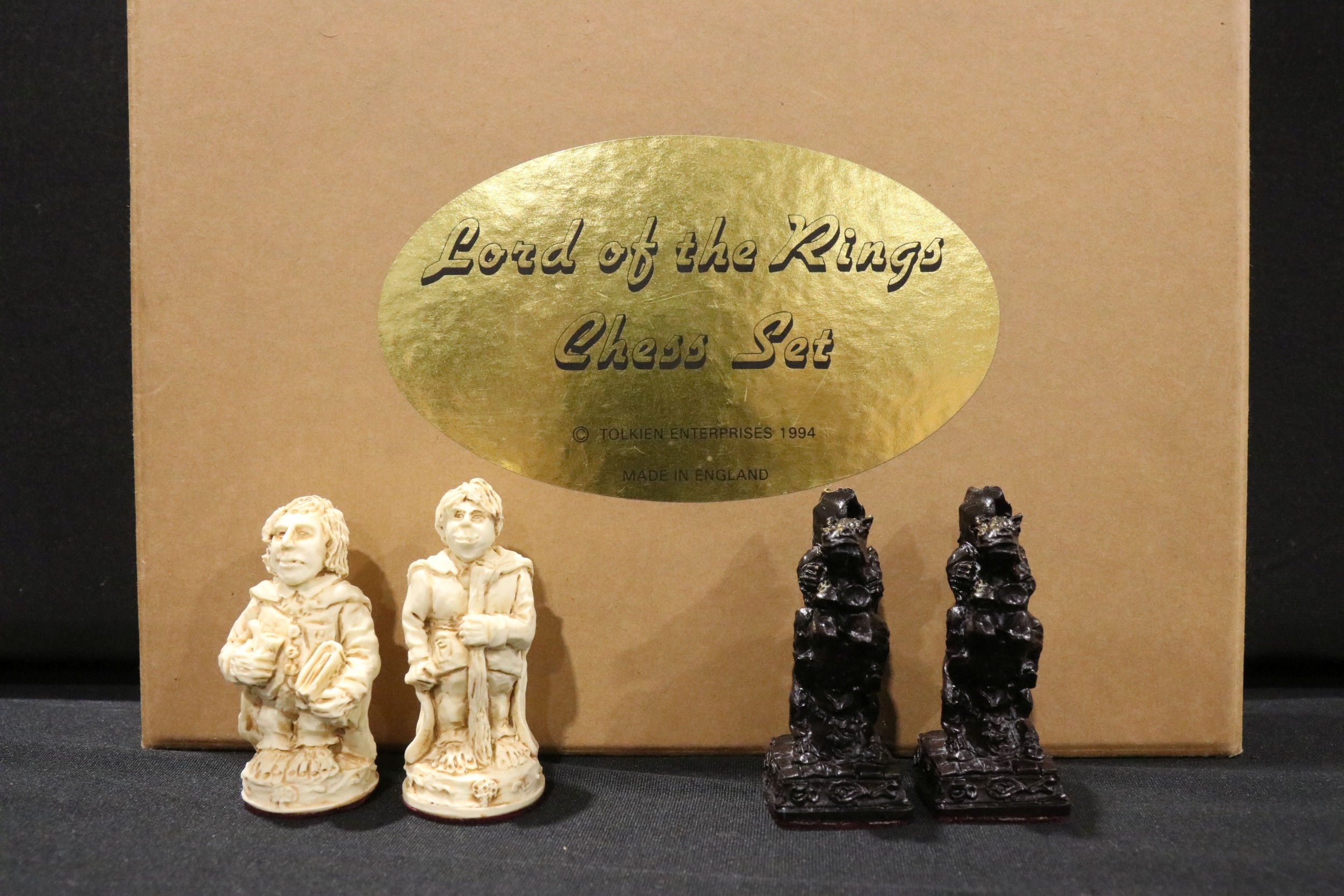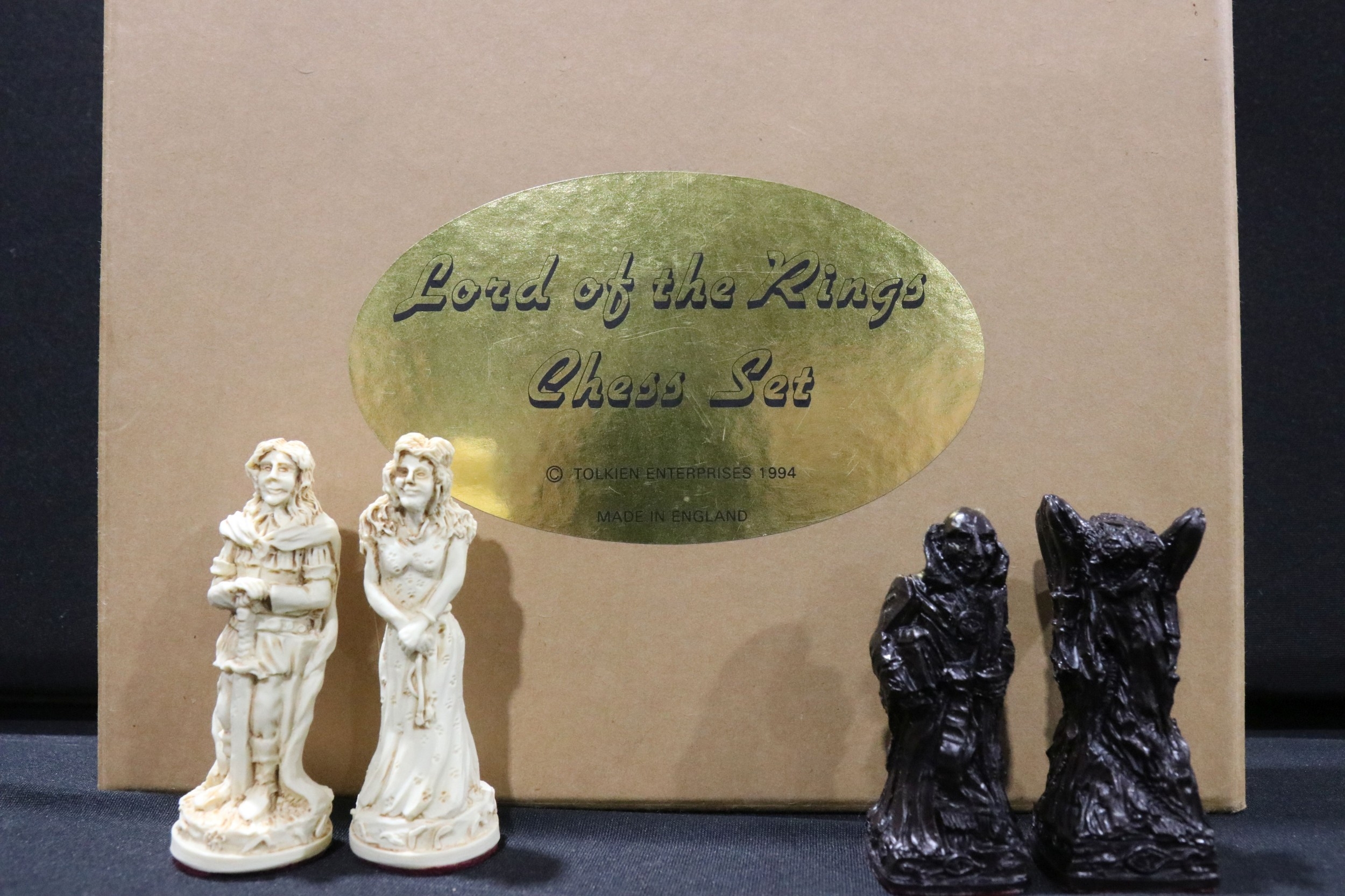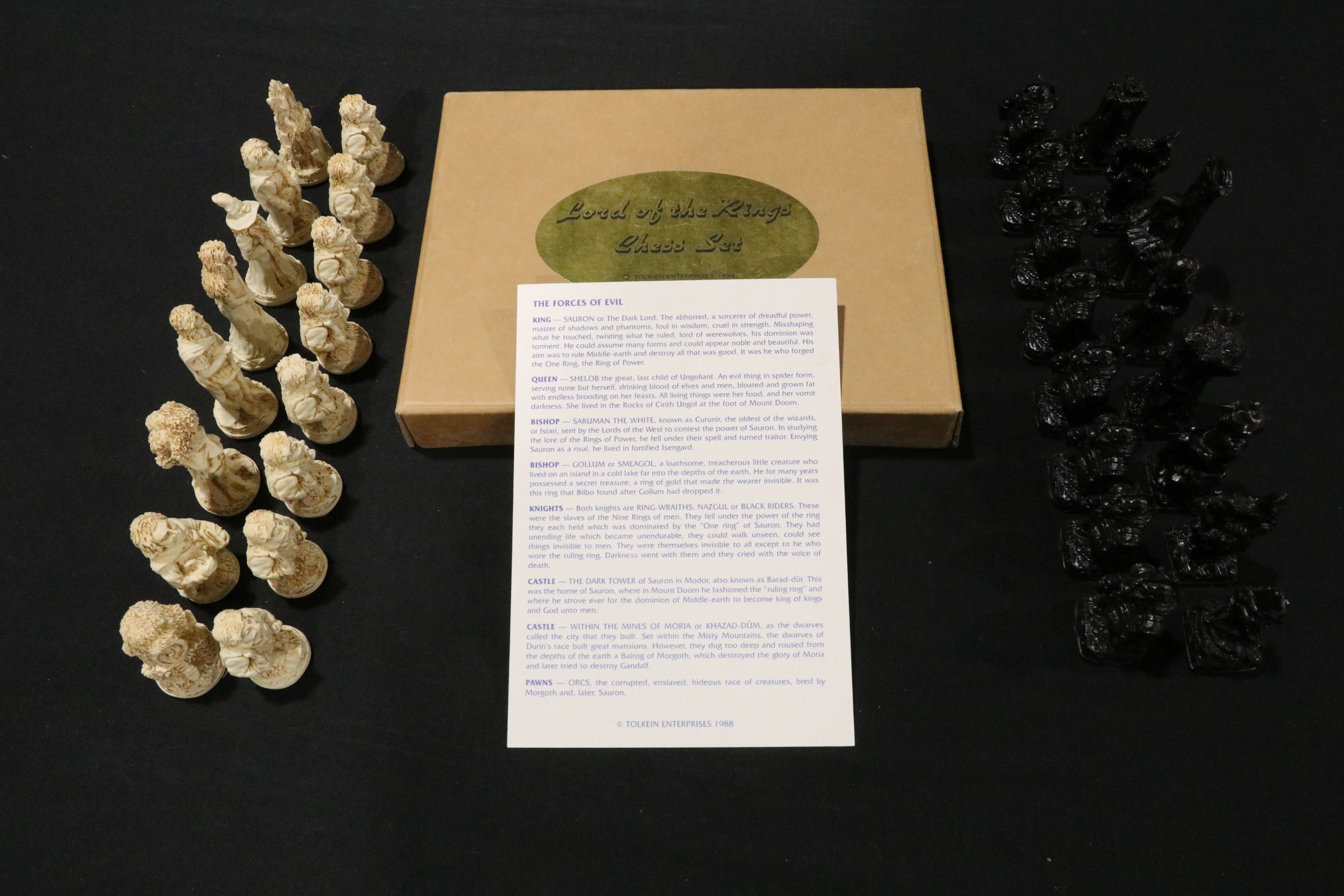 Boxed Tolkien Enterprises 1994 Lord of the Rings Chess Set pieces with paperwork, no board