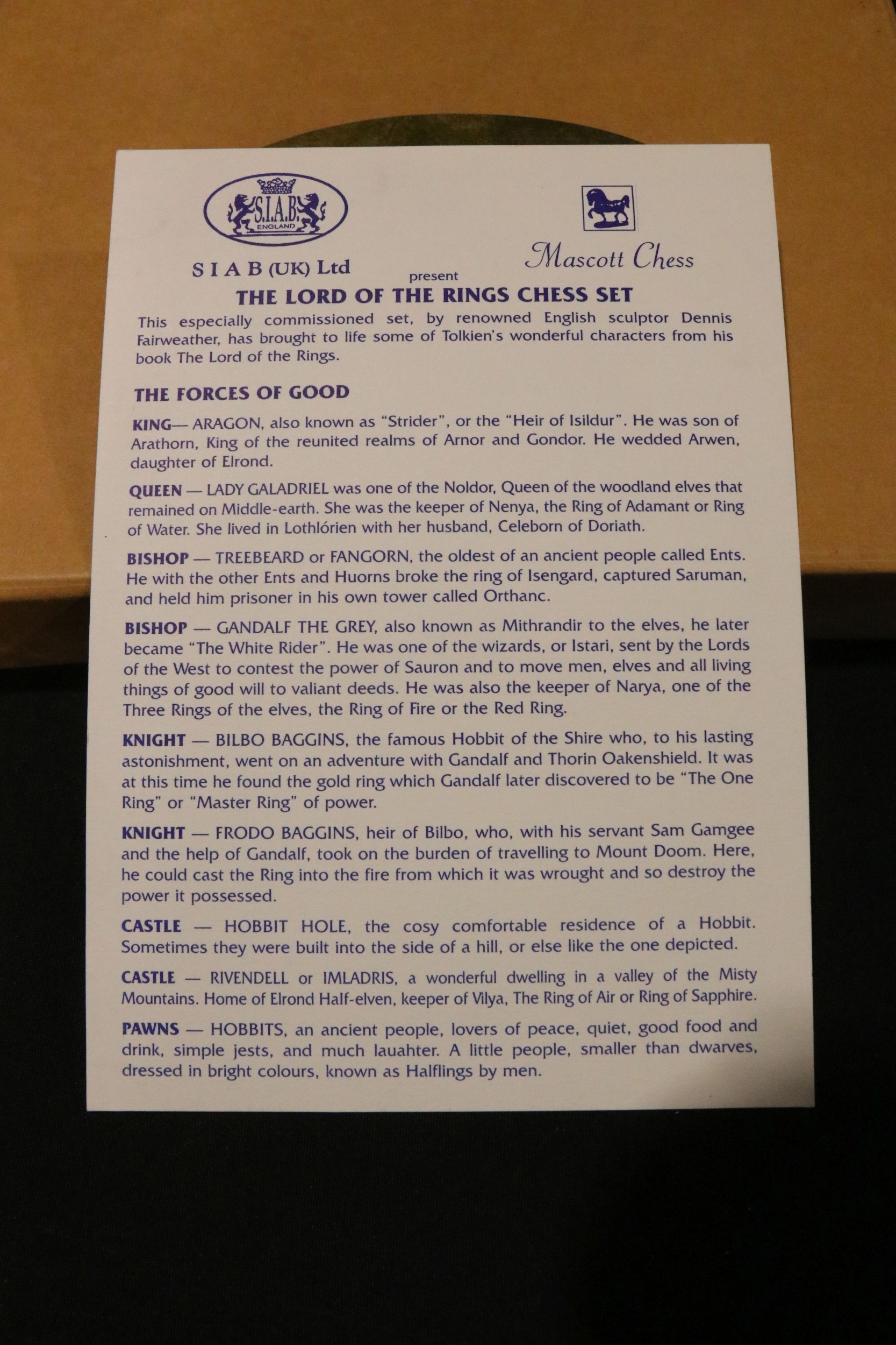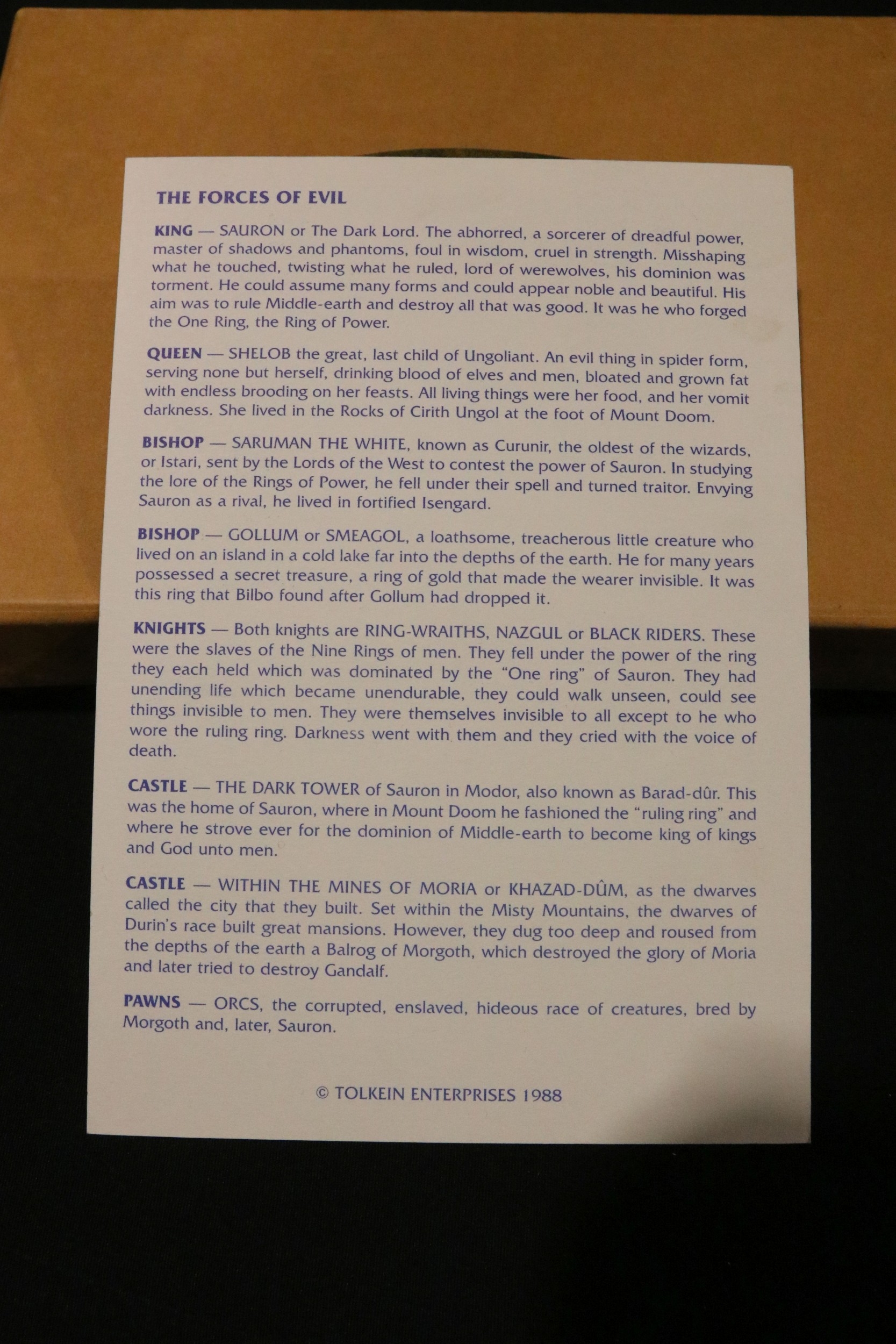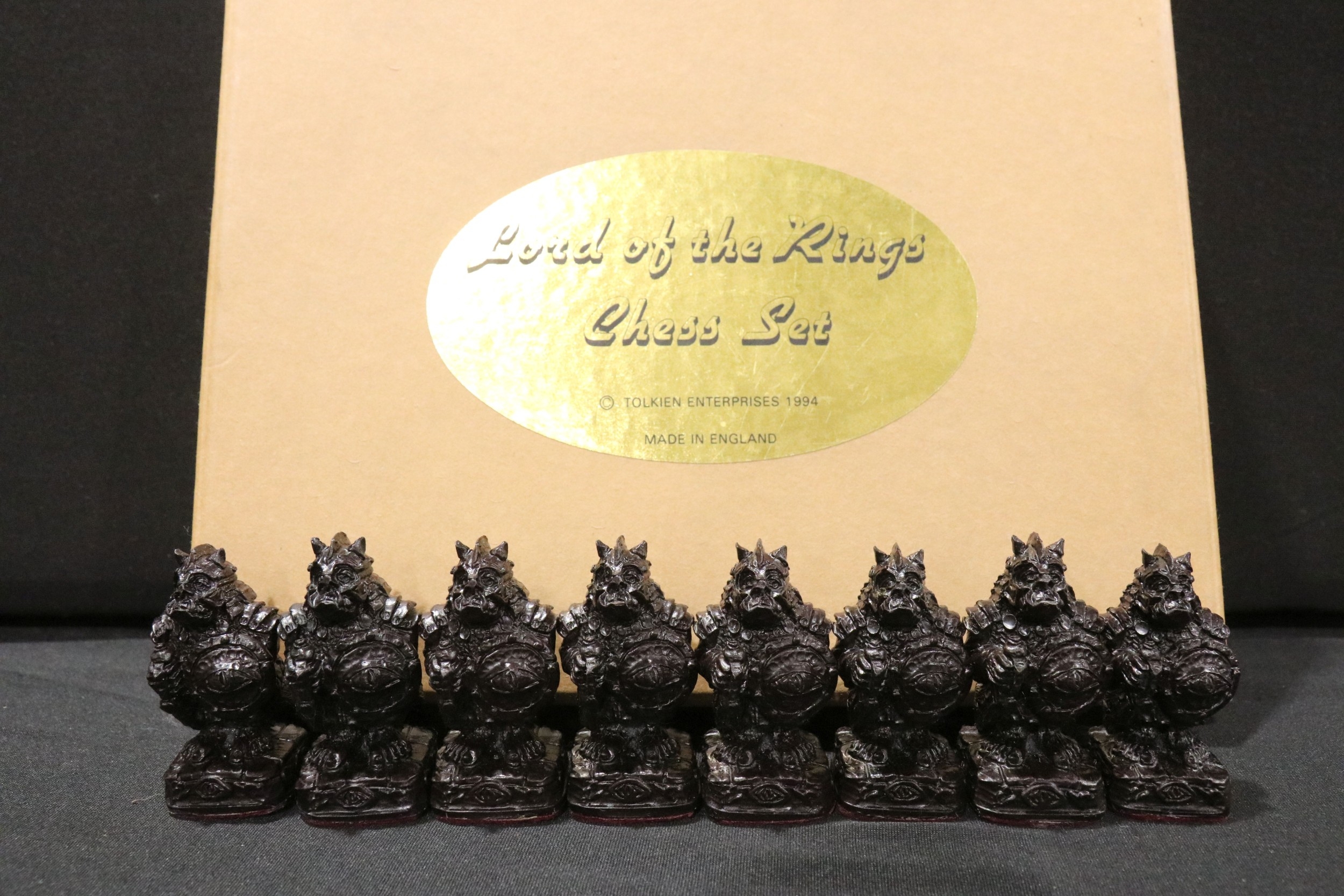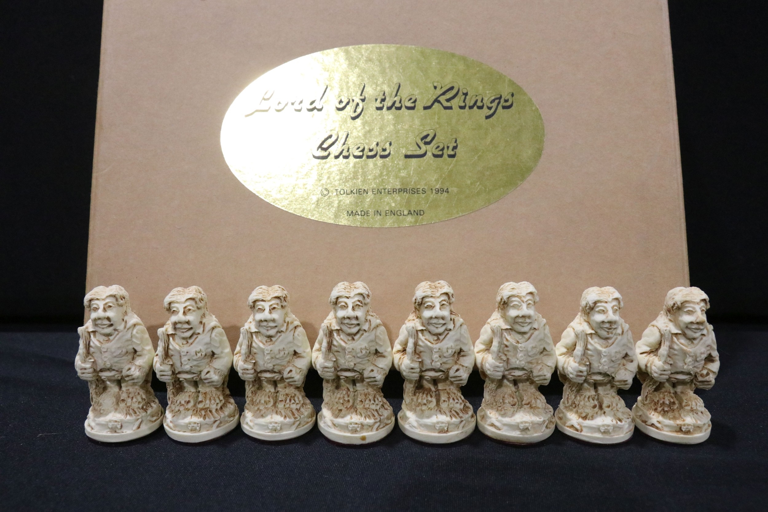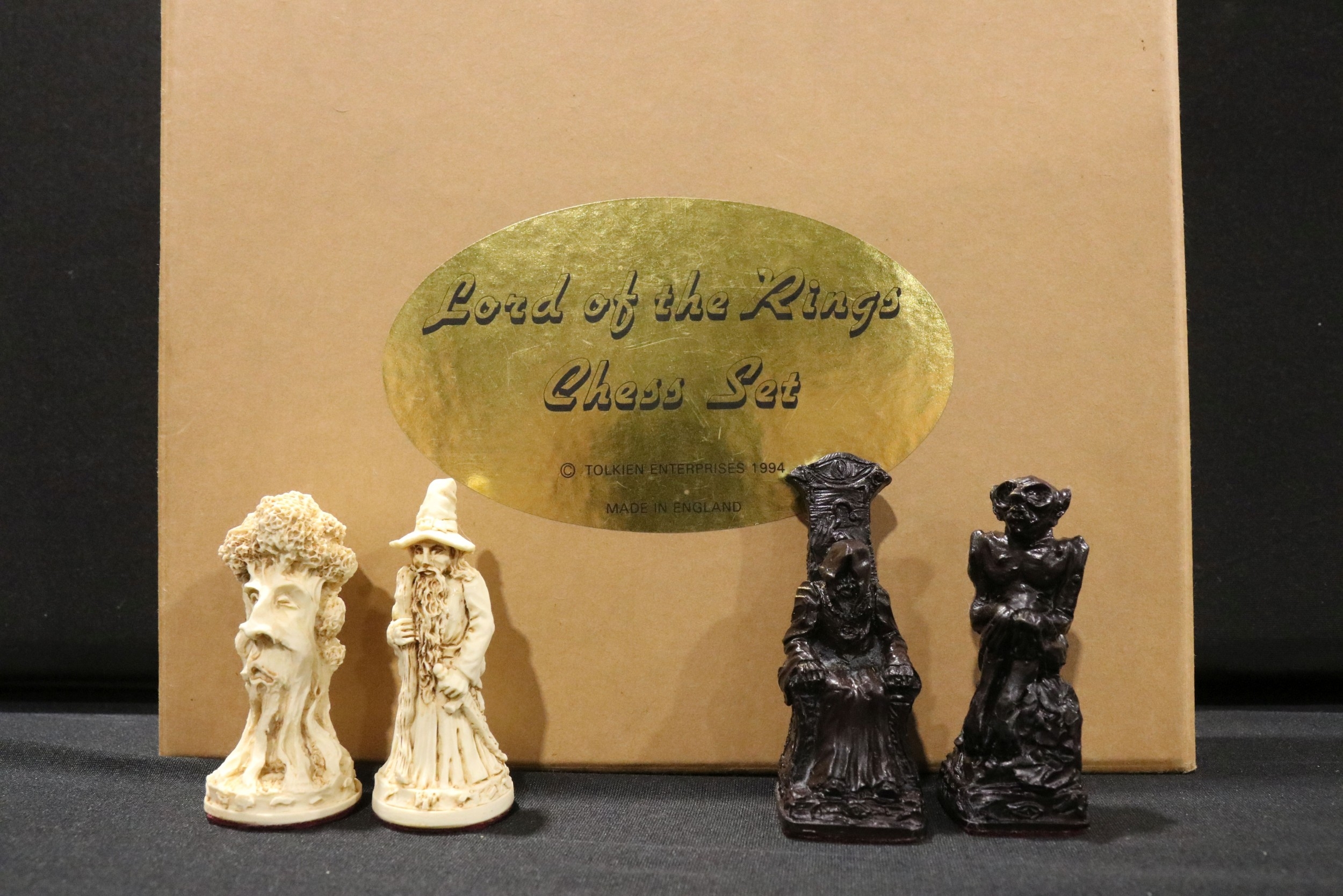 Boxed Tolkien Enterprises 1994 Lord of the Rings Chess Set pieces with paperwork, no board