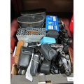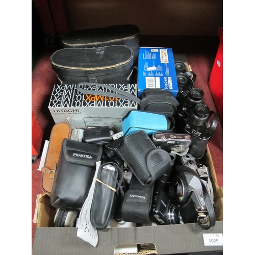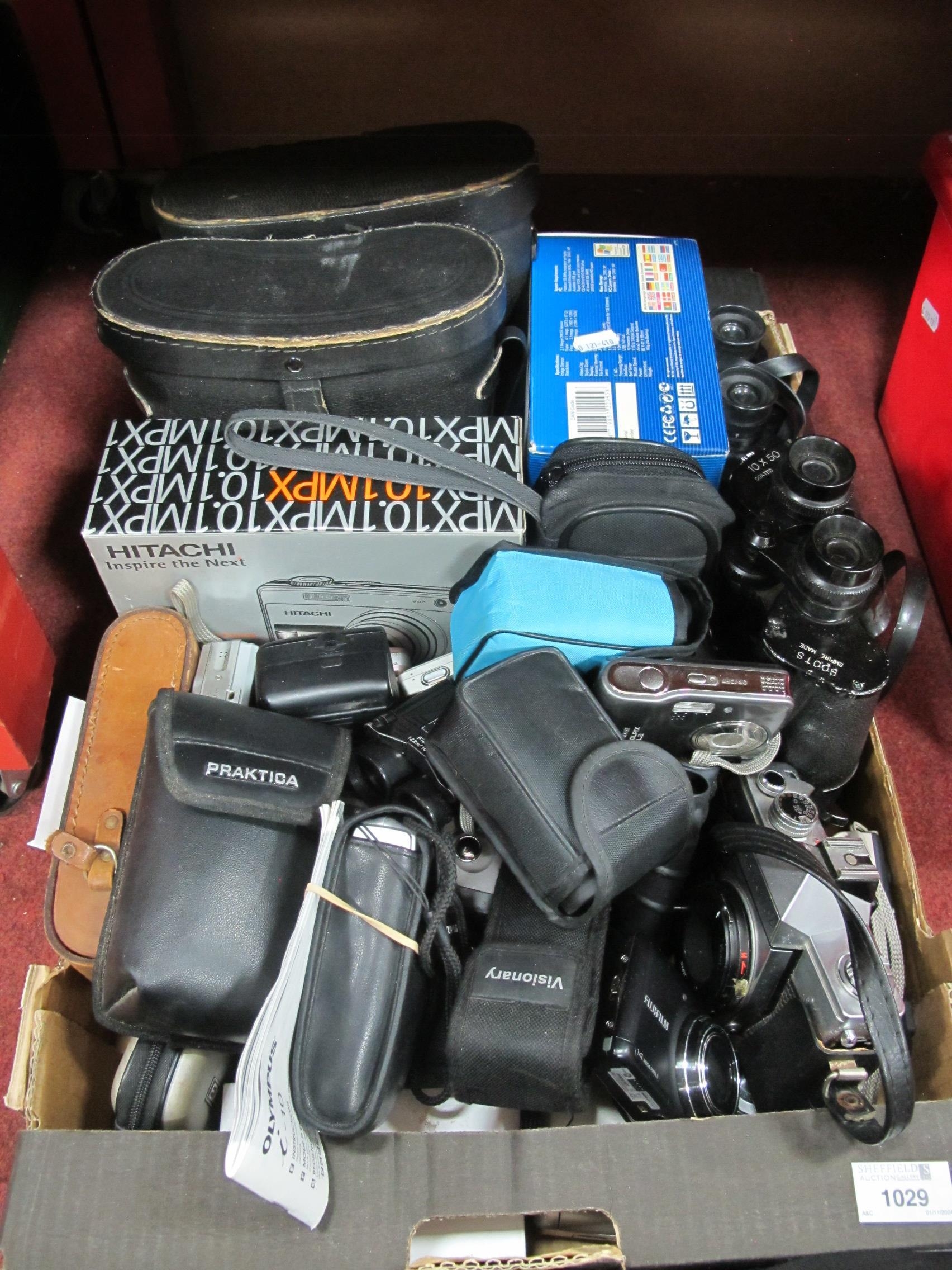 Cameras to include Praktica MTL 3 and many digital cameras by Nikon, Fujifilm, Olympus together with a quantity of binoculars many cased. One Box