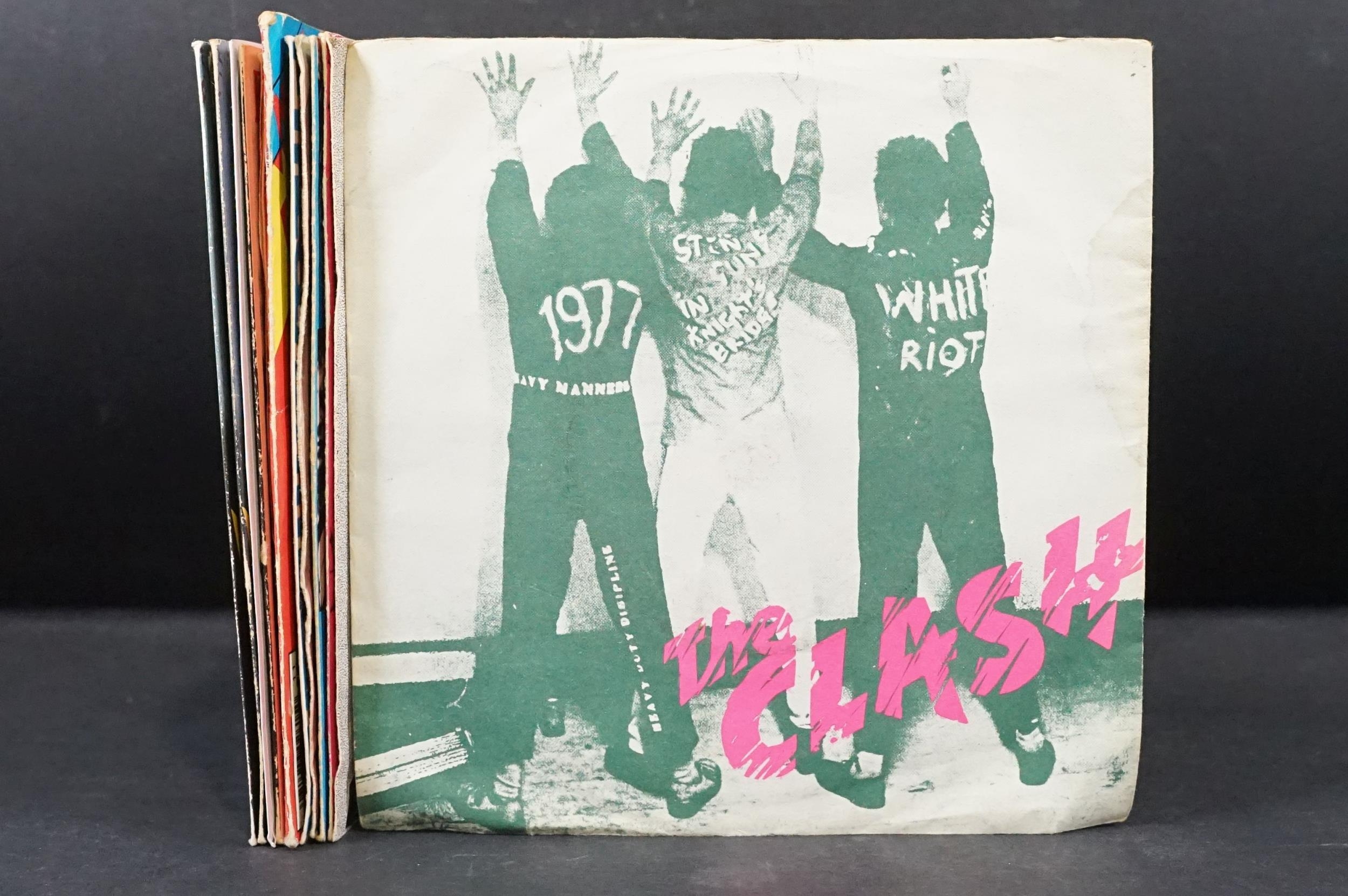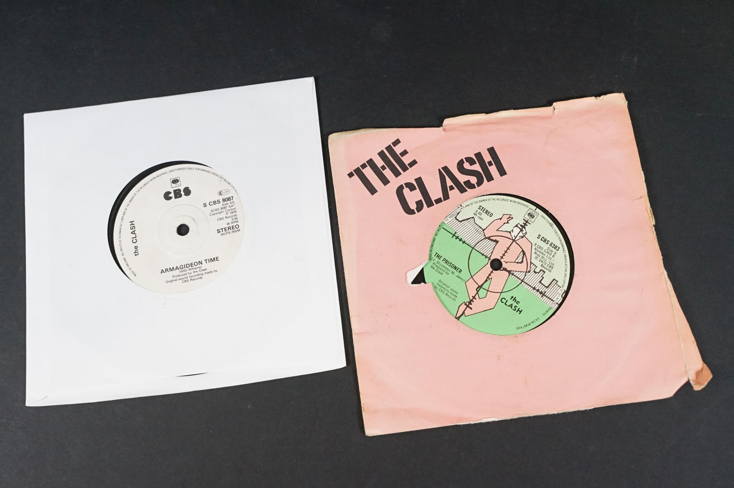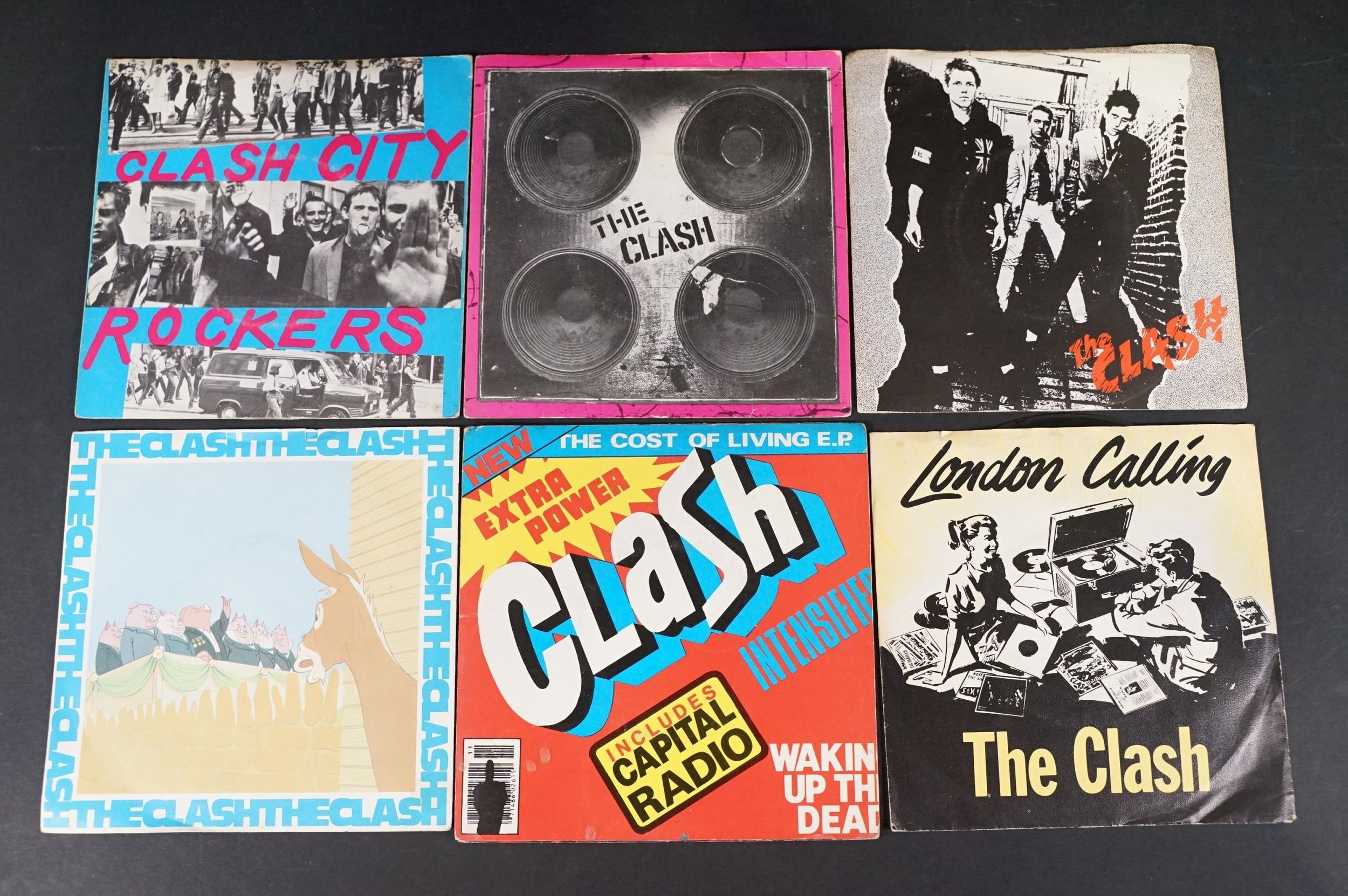 Vinyl - 17 The Clash original UK 7” singles to include: White Riot, Remote Control, Complete Control, Clash City Rockers, (White Man) In Hammersmith Palais (pink sleeve), English Civil War (Johnny Comes Marching Home), The Cost Of Living EP, London Calling / Armagideon Time x 2 (both UK printed in Holland with white labels and black print, one with P/S one without), Bankrobber, Should I Stay Or Should I Go / Straight To Hell x 2 (one solid labels and one large hole). Condition at least VG overall.