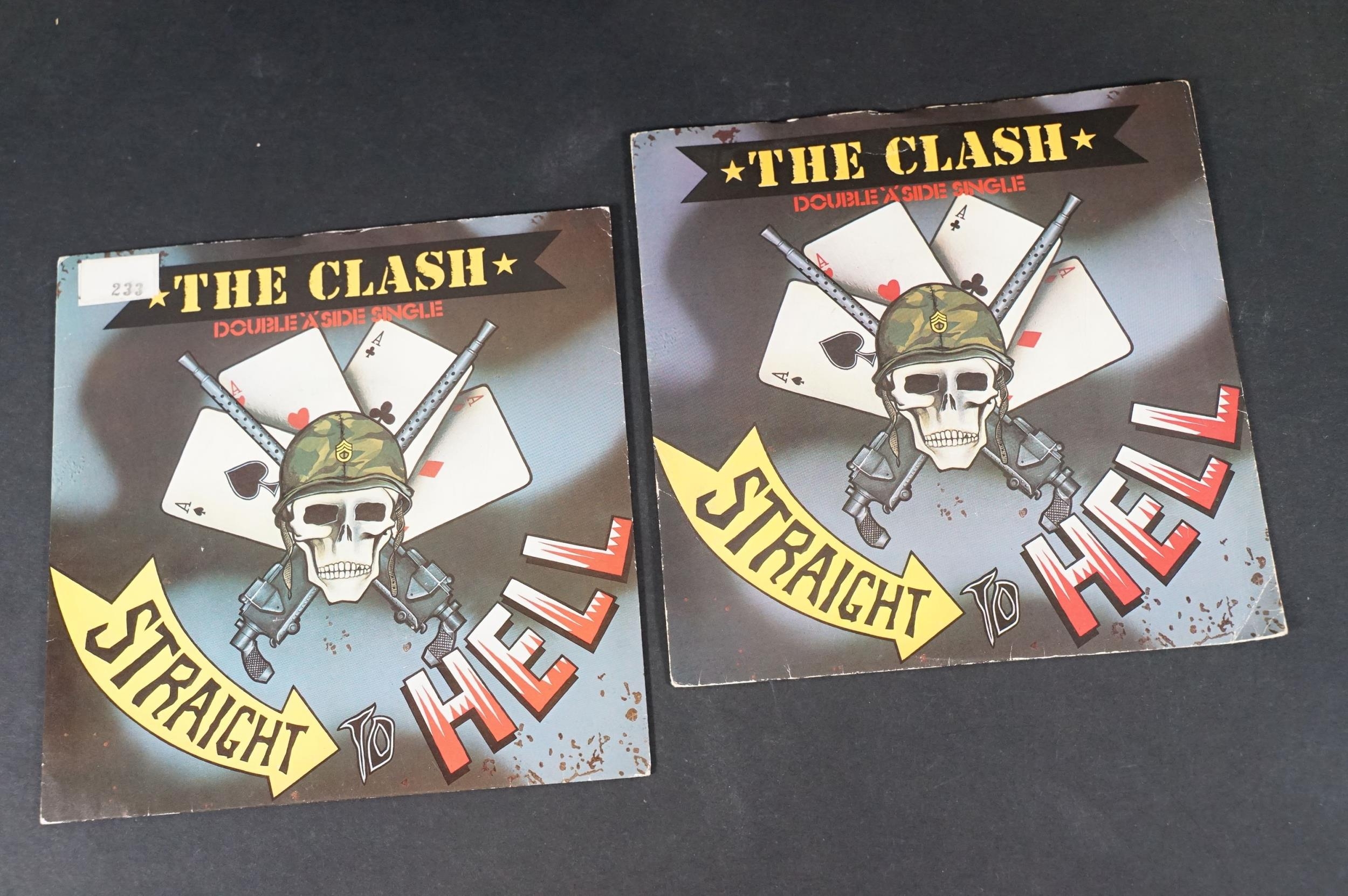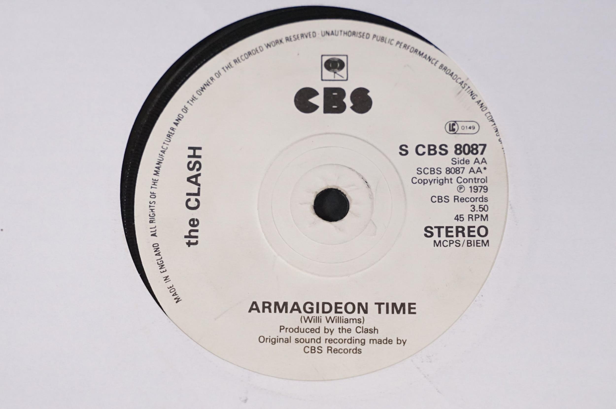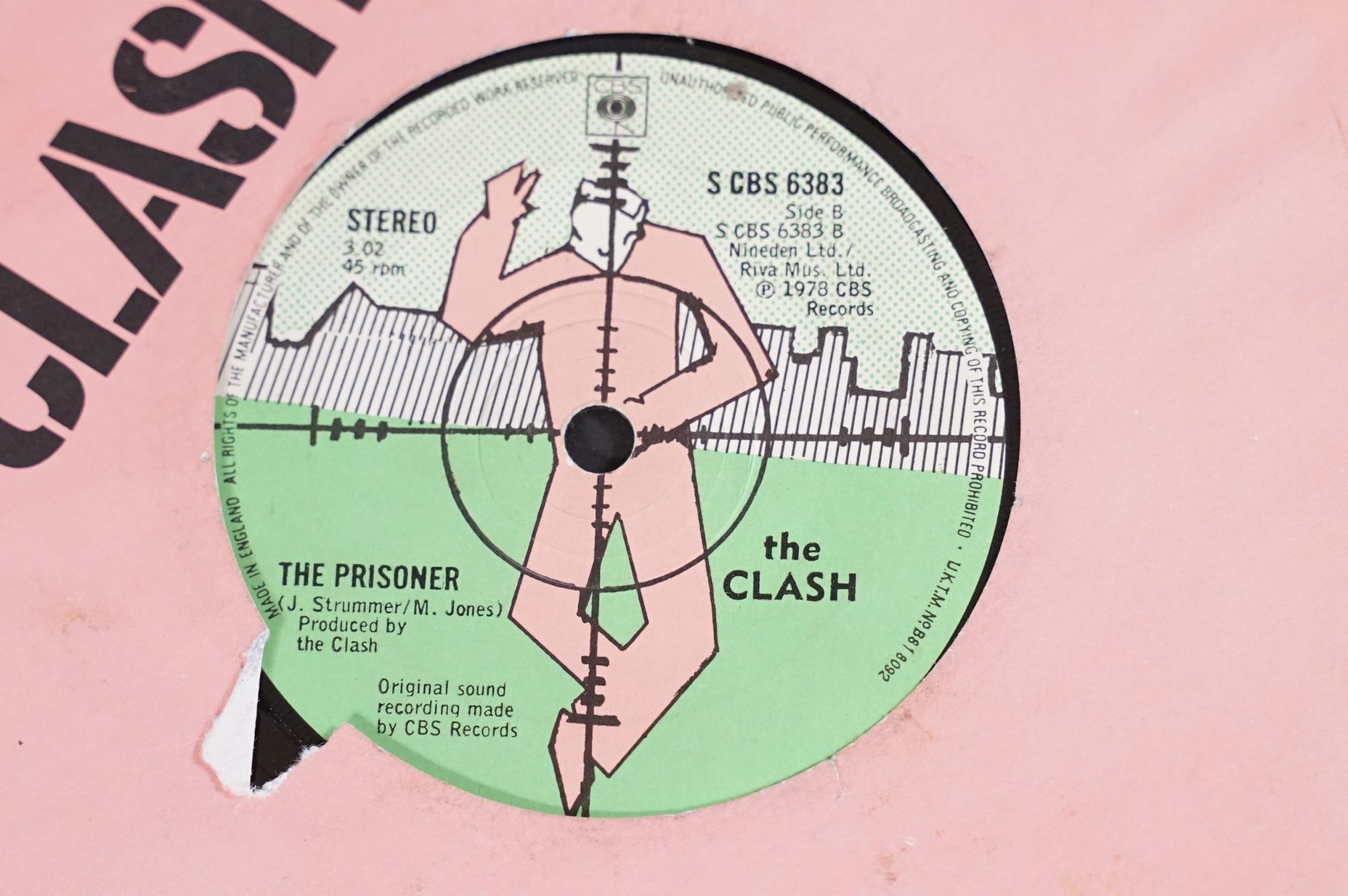 Vinyl - 17 The Clash original UK 7” singles to include: White Riot, Remote Control, Complete Control, Clash City Rockers, (White Man) In Hammersmith Palais (pink sleeve), English Civil War (Johnny Comes Marching Home), The Cost Of Living EP, London Calling / Armagideon Time x 2 (both UK printed in Holland with white labels and black print, one with P/S one without), Bankrobber, Should I Stay Or Should I Go / Straight To Hell x 2 (one solid labels and one large hole). Condition at least VG overall.