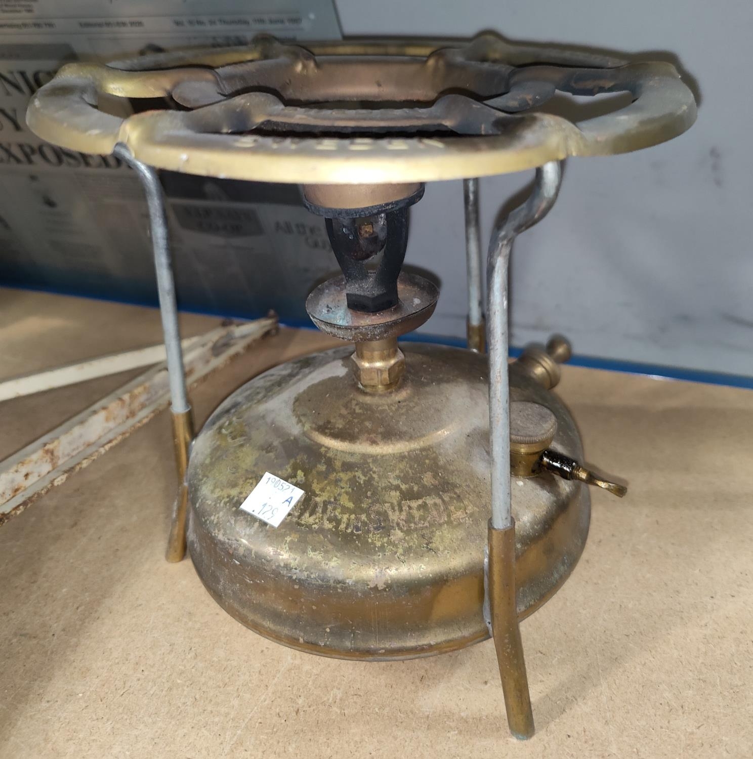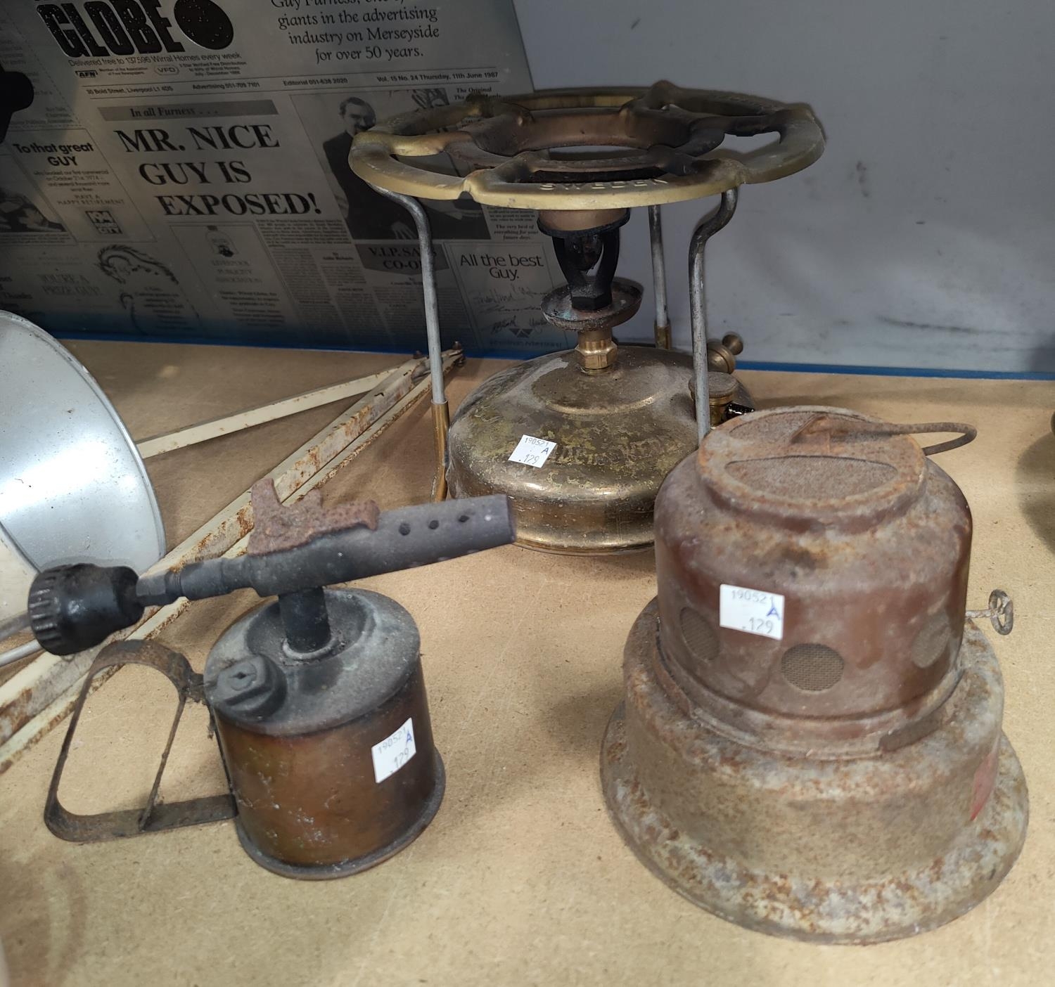 A vintage Swedish 'The King of Stoves' brand Svea 106 stove; a vintage Swedish blow lamp and a vintage hanging lamp