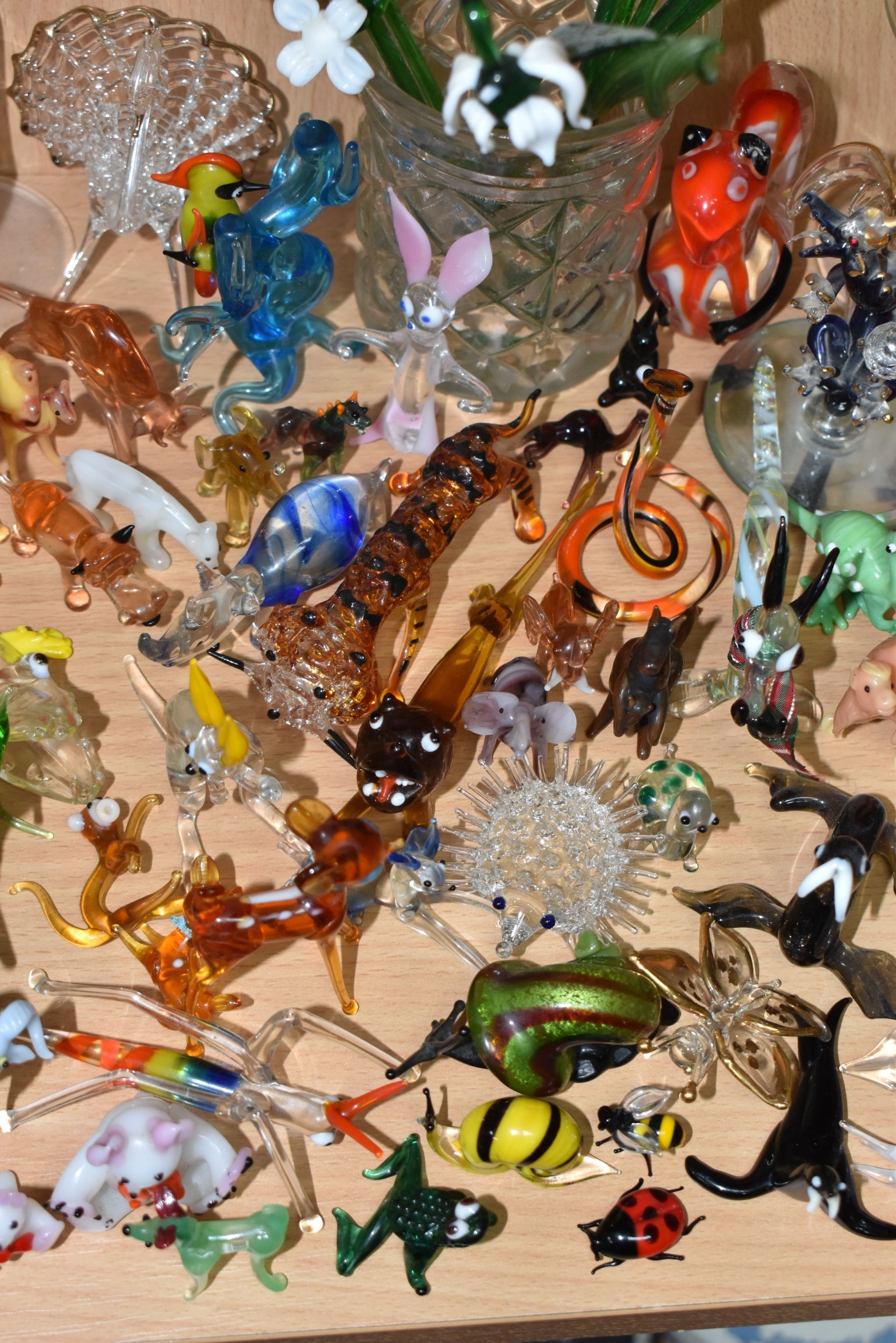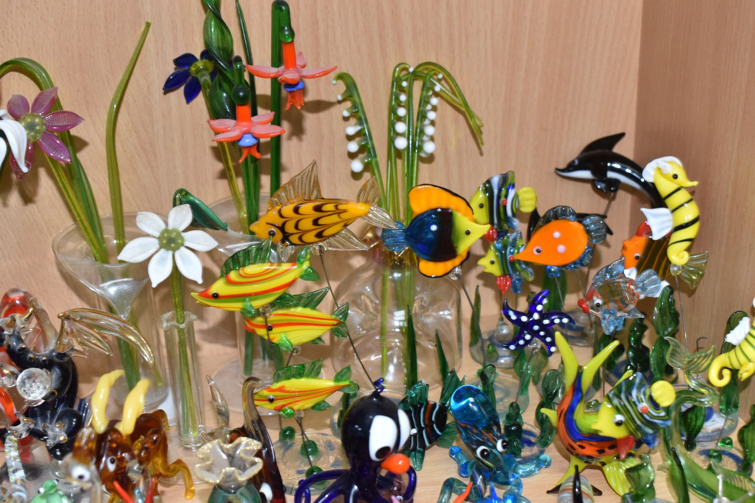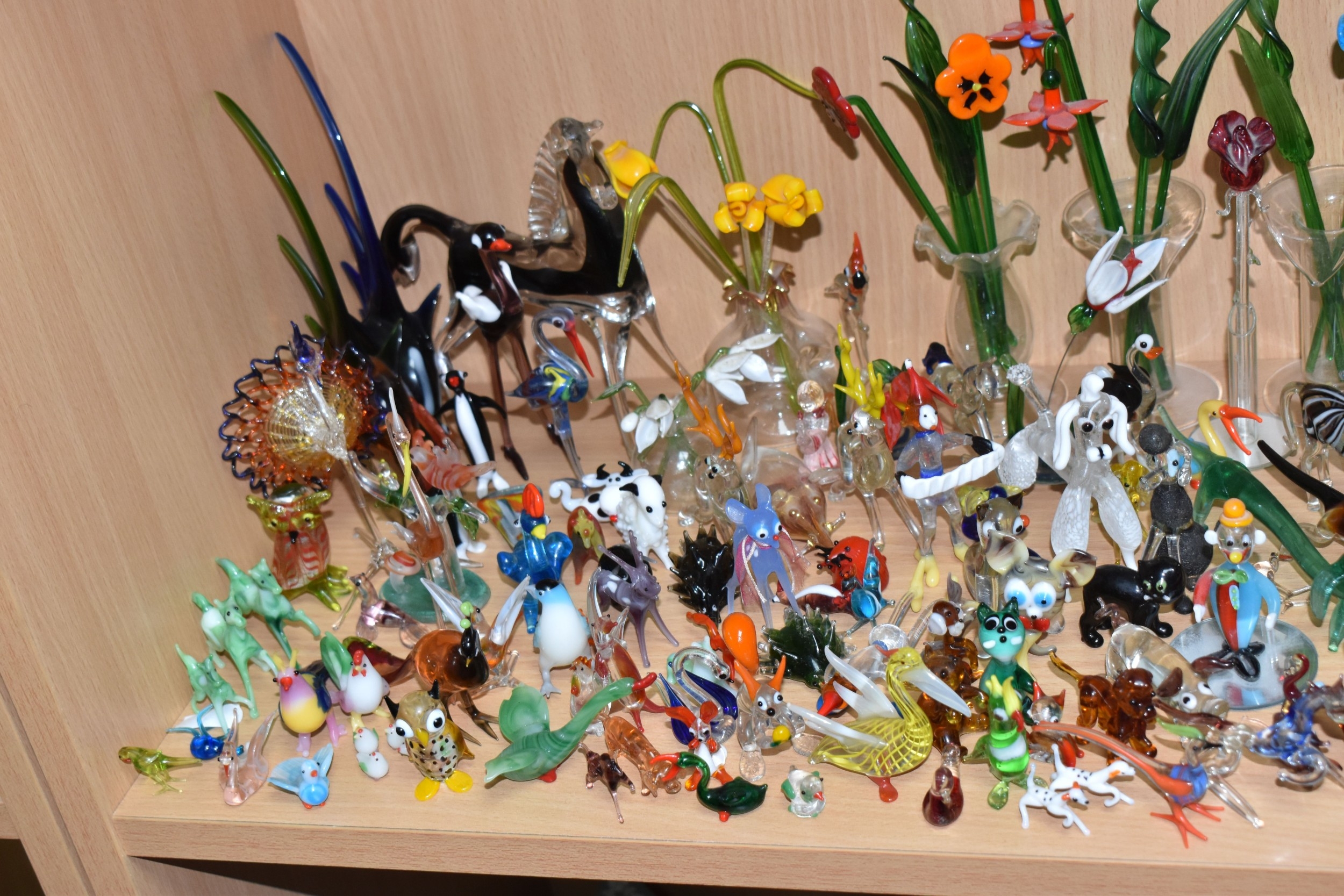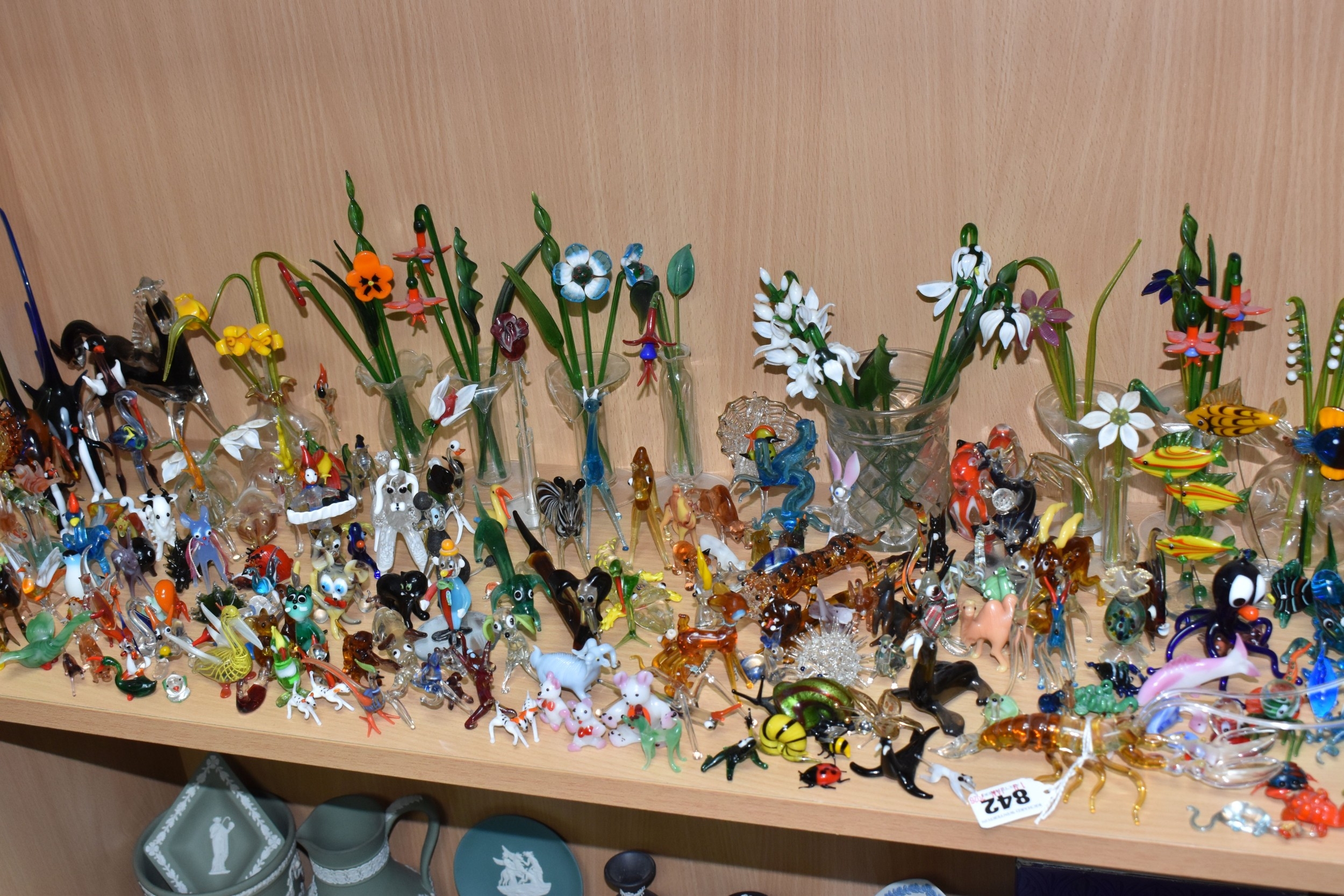A COLLECTION OF GLASS LAMPWORK ANIMALS AND FLOWERS, approximately two hundred pieces, to include several vases of flowers, fish, lobster/shrimp, octopus, snails, sealions, camels, tiger, goat, sheep, horses, dogs, cats, kangaroo, dinosaur, dragon, birds, insects, crocodiles, zebra, snake, deer, hedgehogs, etc (qty) (Condition Report: most pieces appear in good condition, some losses and other damage)