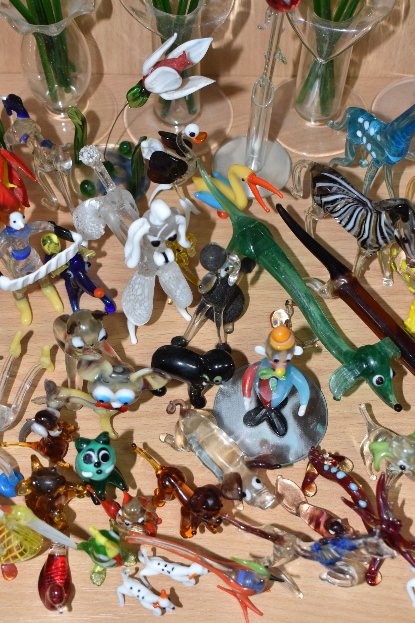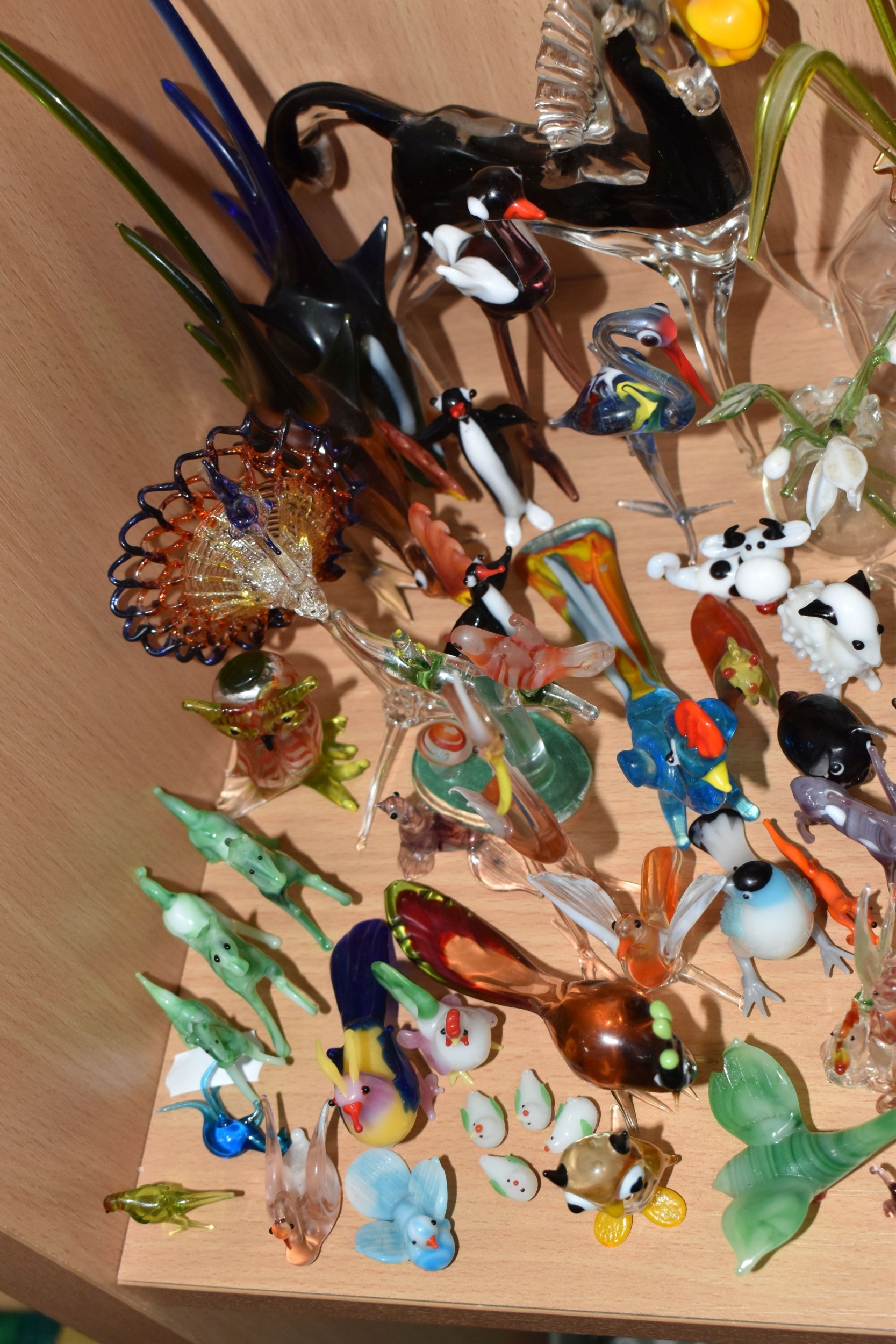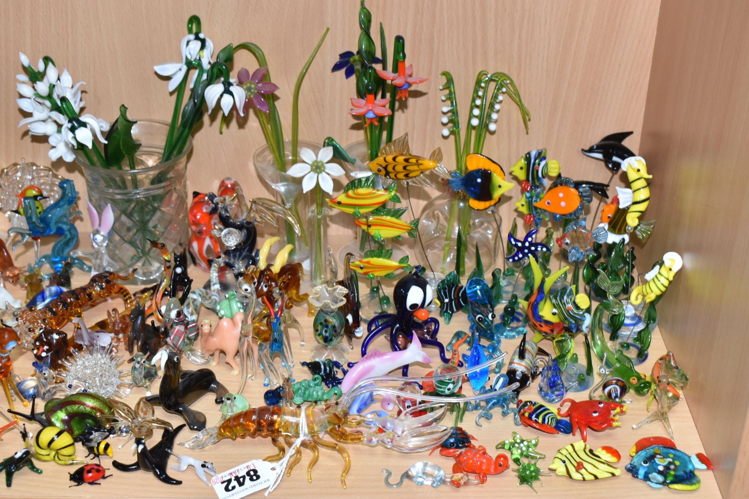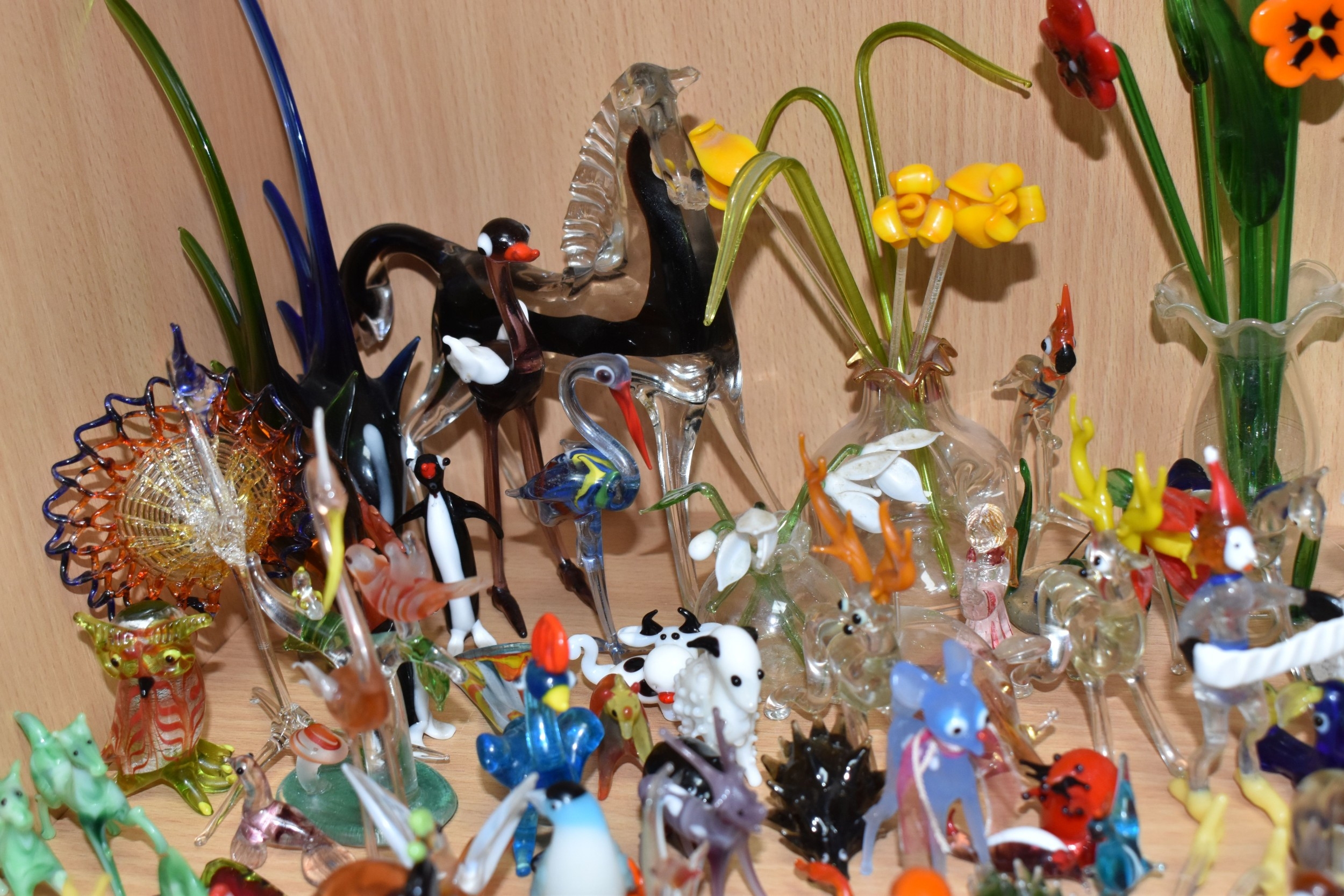A COLLECTION OF GLASS LAMPWORK ANIMALS AND FLOWERS, approximately two hundred pieces, to include several vases of flowers, fish, lobster/shrimp, octopus, snails, sealions, camels, tiger, goat, sheep, horses, dogs, cats, kangaroo, dinosaur, dragon, birds, insects, crocodiles, zebra, snake, deer, hedgehogs, etc (qty) (Condition Report: most pieces appear in good condition, some losses and other damage)