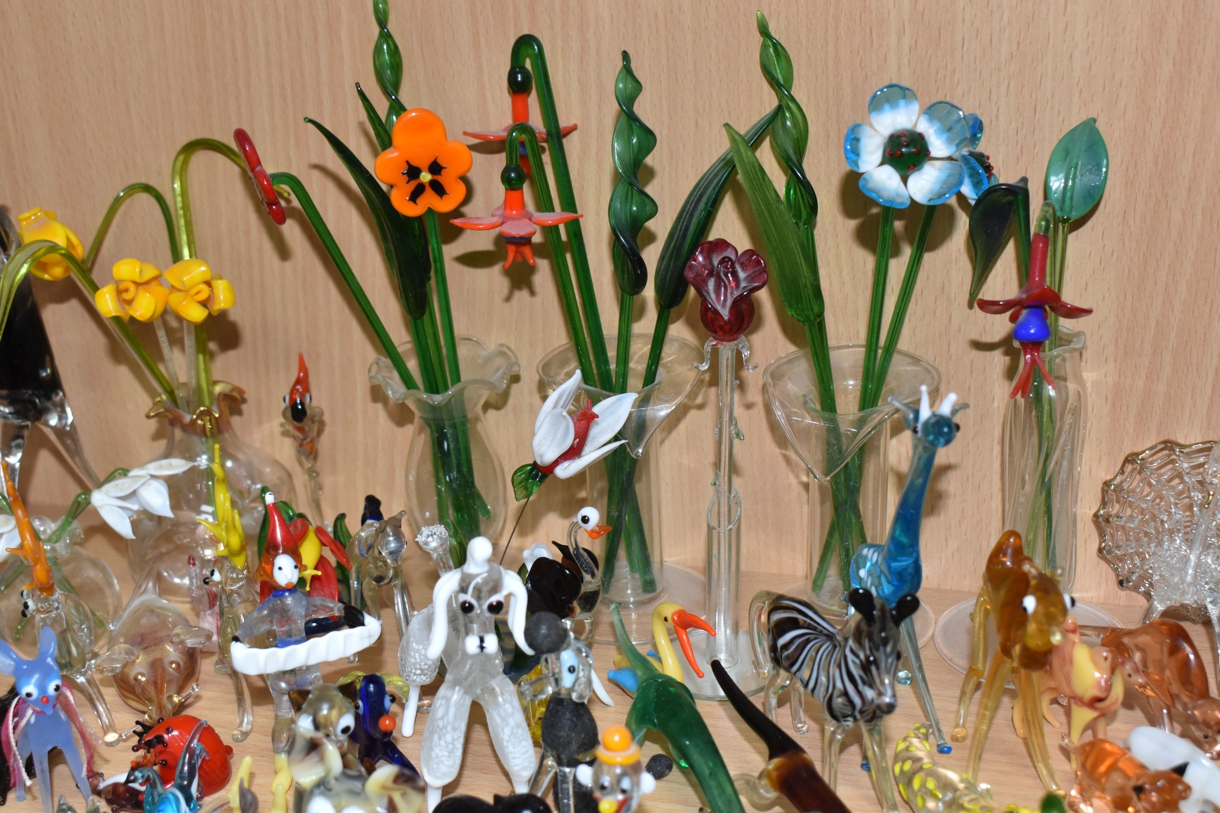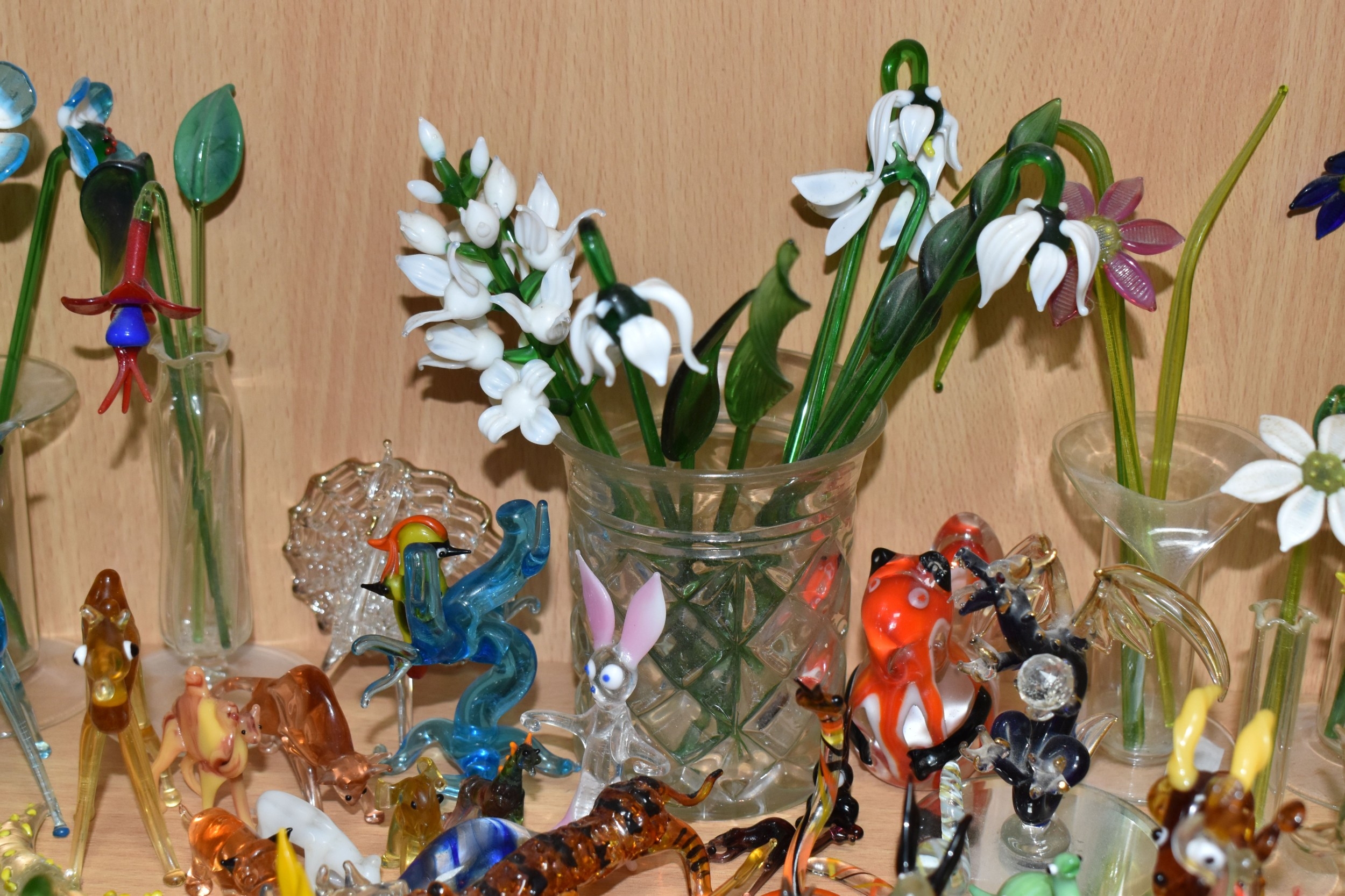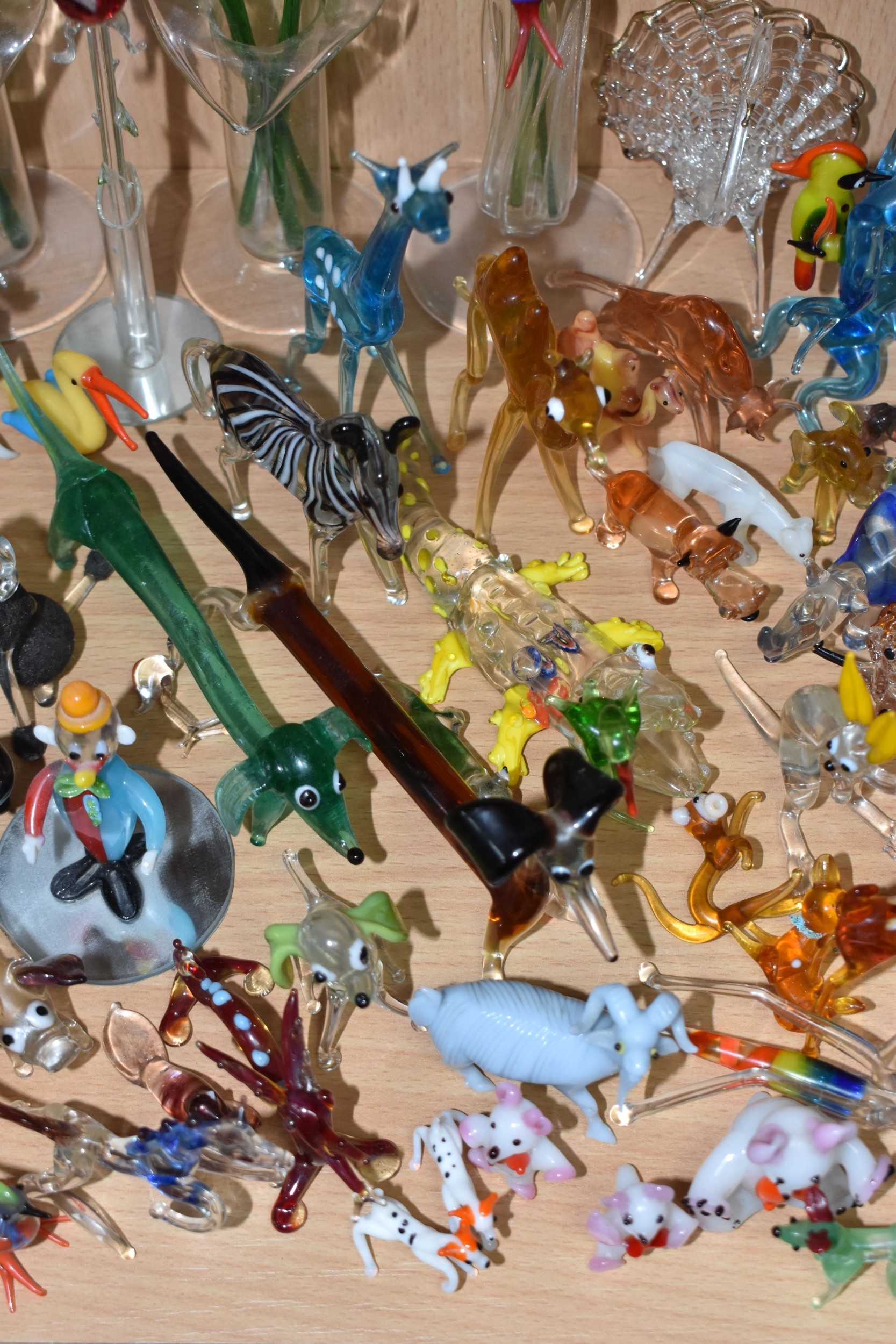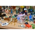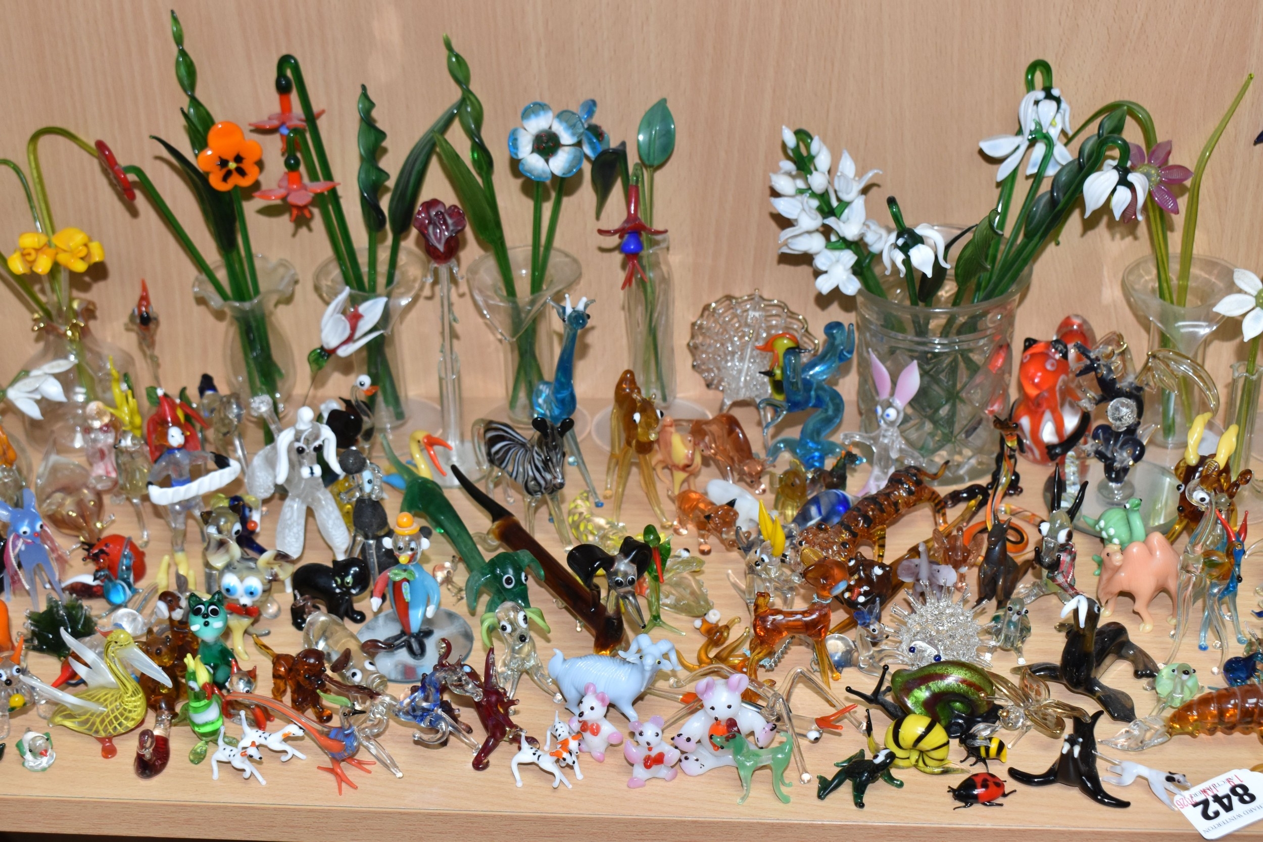A COLLECTION OF GLASS LAMPWORK ANIMALS AND FLOWERS, approximately two hundred pieces, to include several vases of flowers, fish, lobster/shrimp, octopus, snails, sealions, camels, tiger, goat, sheep, horses, dogs, cats, kangaroo, dinosaur, dragon, birds, insects, crocodiles, zebra, snake, deer, hedgehogs, etc (qty) (Condition Report: most pieces appear in good condition, some losses and other damage)