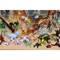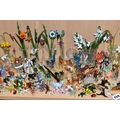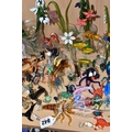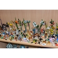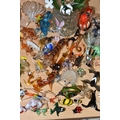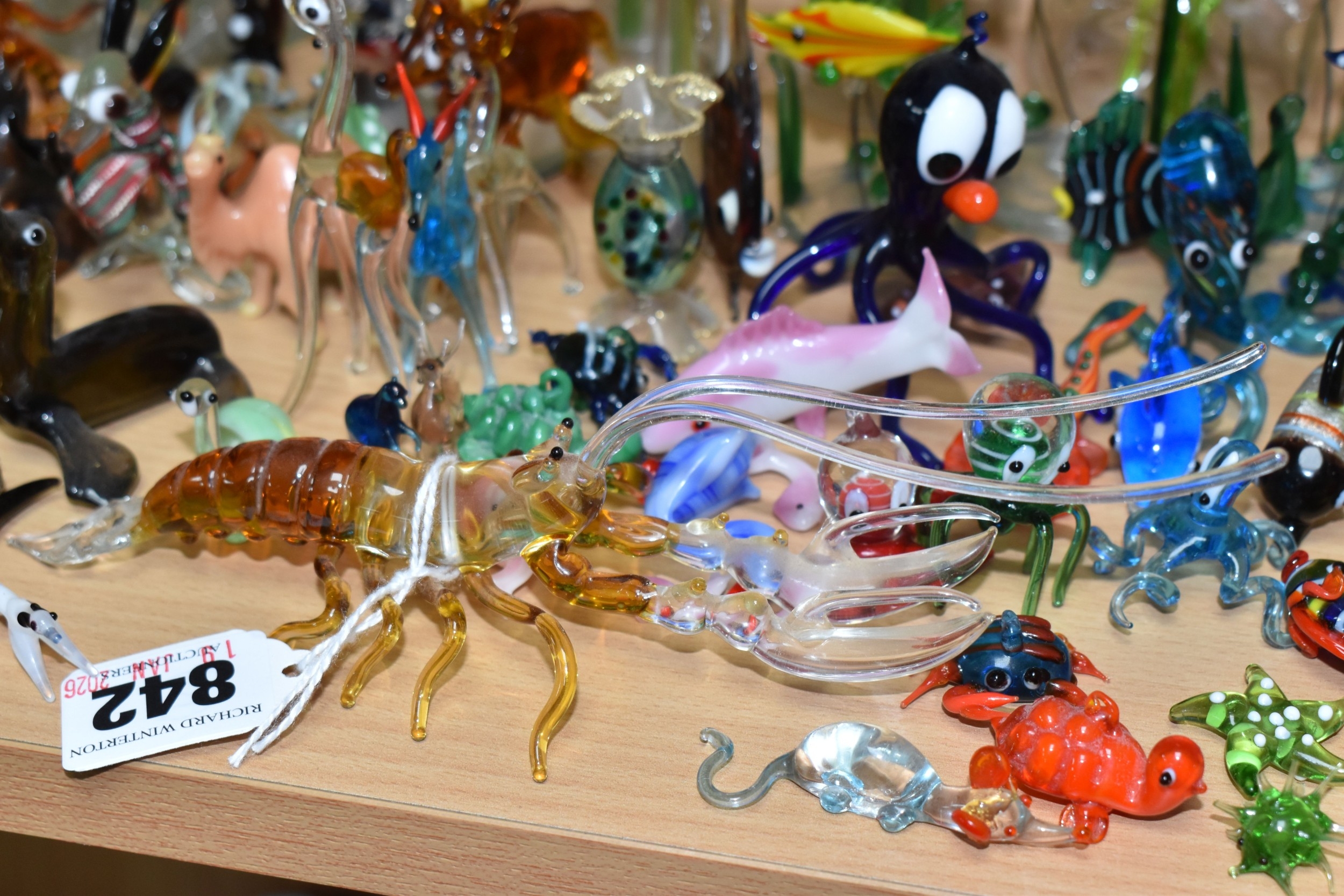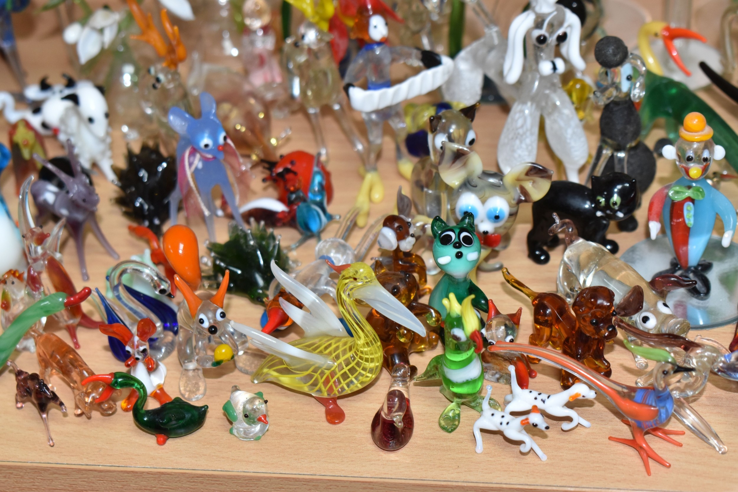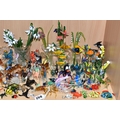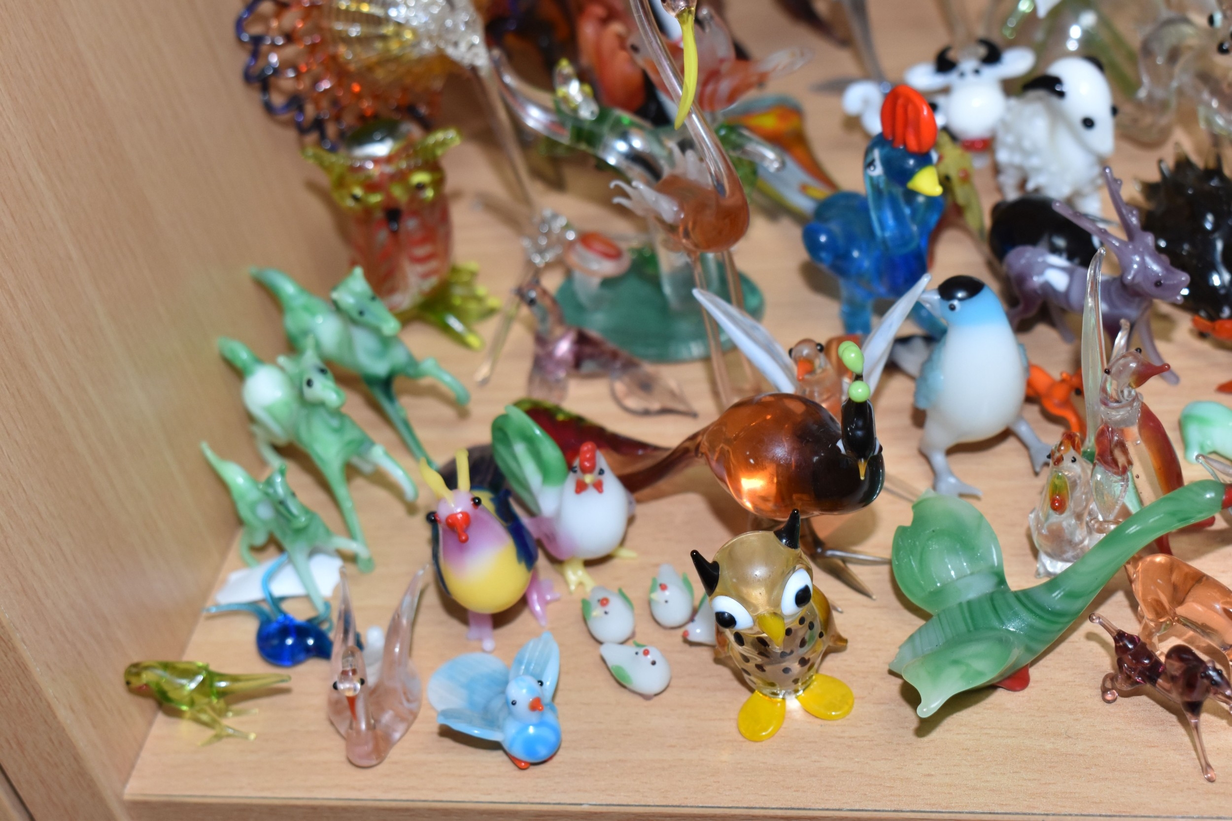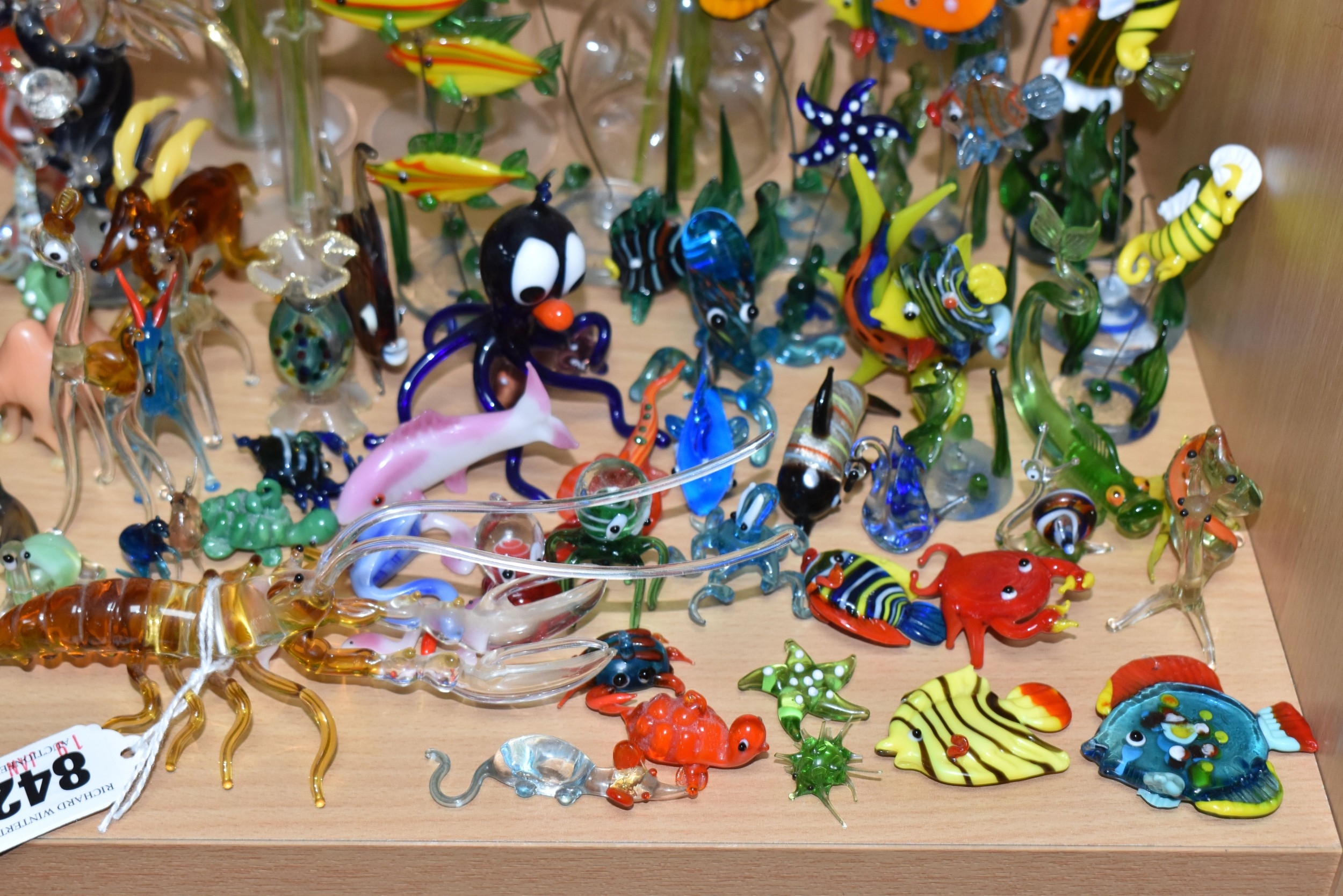 A COLLECTION OF GLASS LAMPWORK ANIMALS AND FLOWERS, approximately two hundred pieces, to include several vases of flowers, fish, lobster/shrimp, octopus, snails, sealions, camels, tiger, goat, sheep, horses, dogs, cats, kangaroo, dinosaur, dragon, birds, insects, crocodiles, zebra, snake, deer, hedgehogs, etc (qty) (Condition Report: most pieces appear in good condition, some losses and other damage)