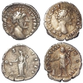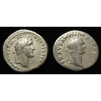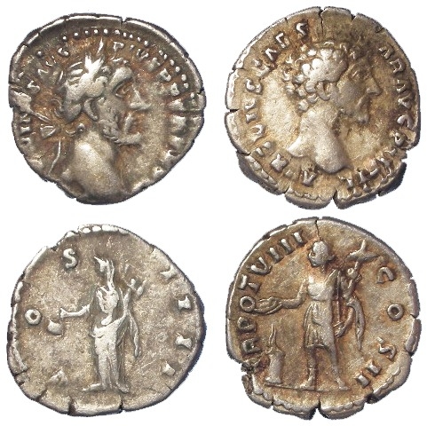 Roman Imperial (2) silver Denarii: Antoninus Pius, Rome 151-152, Re.: COS IIII, Vesta, veiled, draped, standing left, holding simpulum in extended right hand and palladium in left. RIC III 203; BMC 762, 3.36g, nVF; along with Marcus Aurelius as Caesar, Rome, Rev: TR POT VIII COS II, Genius Exercitus, in military dress, standing left, sacrificing out of patera in right hand over lighted altar and holding a legionary eagle in left. RIC 461; Cohen 673; BMC 825, 3.32g, VF.