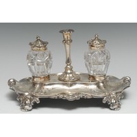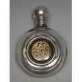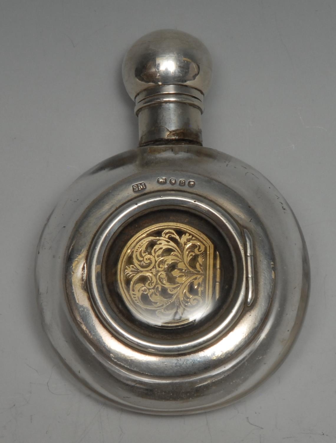 A Victorian silver and clear glass moon flask novelty combination scent bottle, vinaigrette and snuff box, hinged domed cover, glazed apertures, 8.5cm long, Sampson Mordan & Co, London 1873