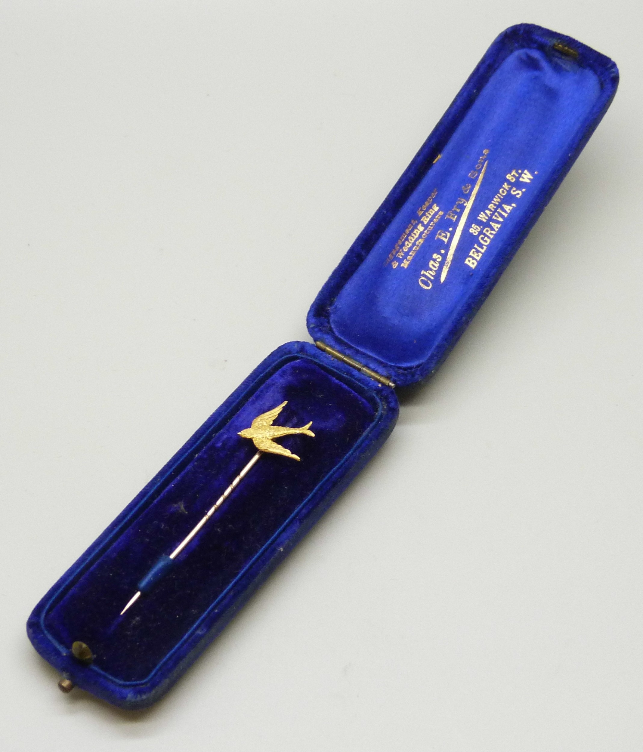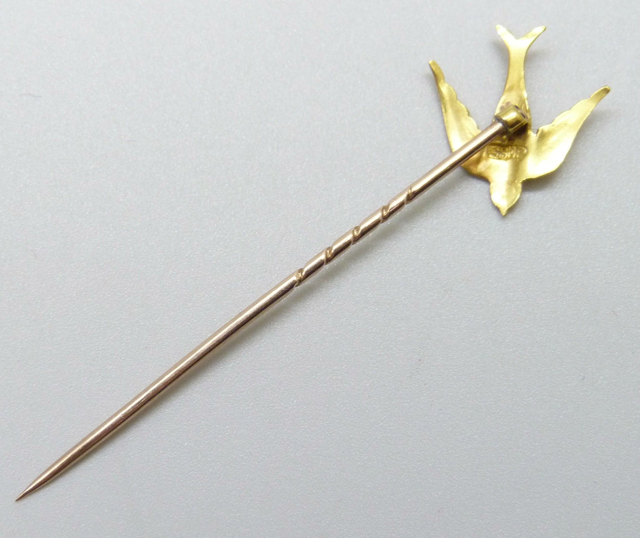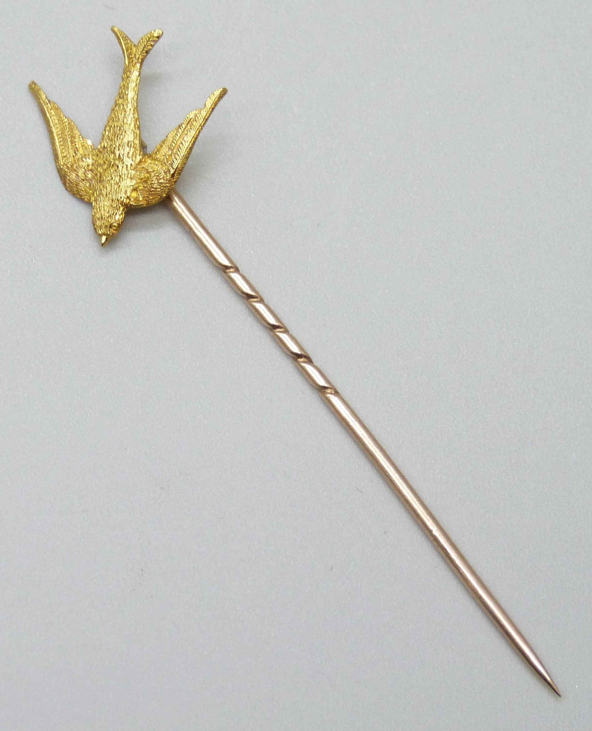 A bird design stick pin, marked SS 18, 1.1g, 5.5cm, boxed