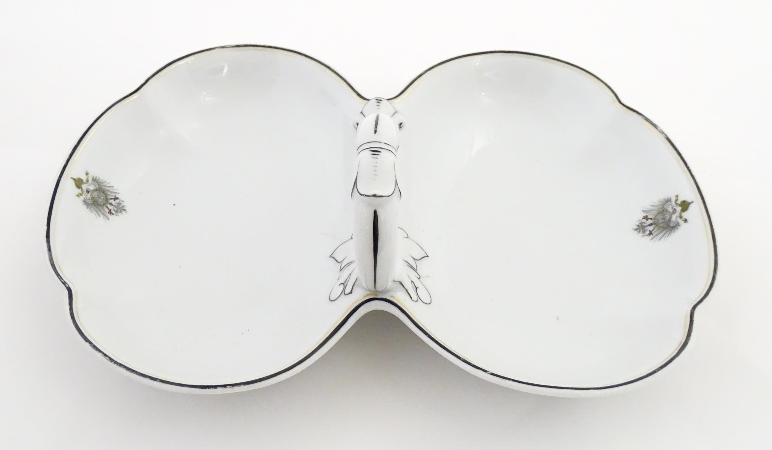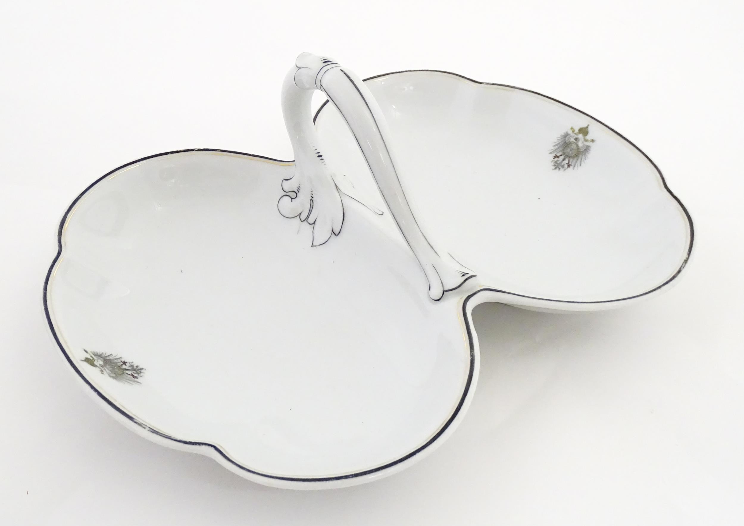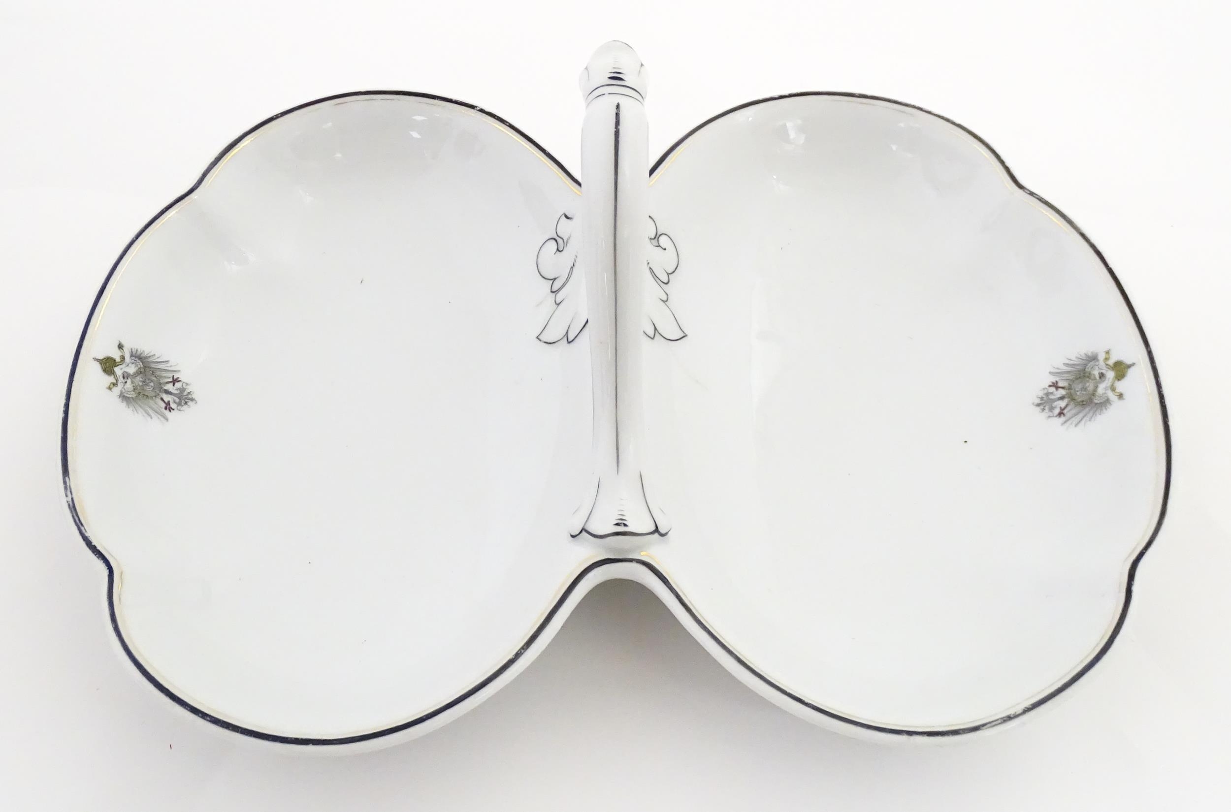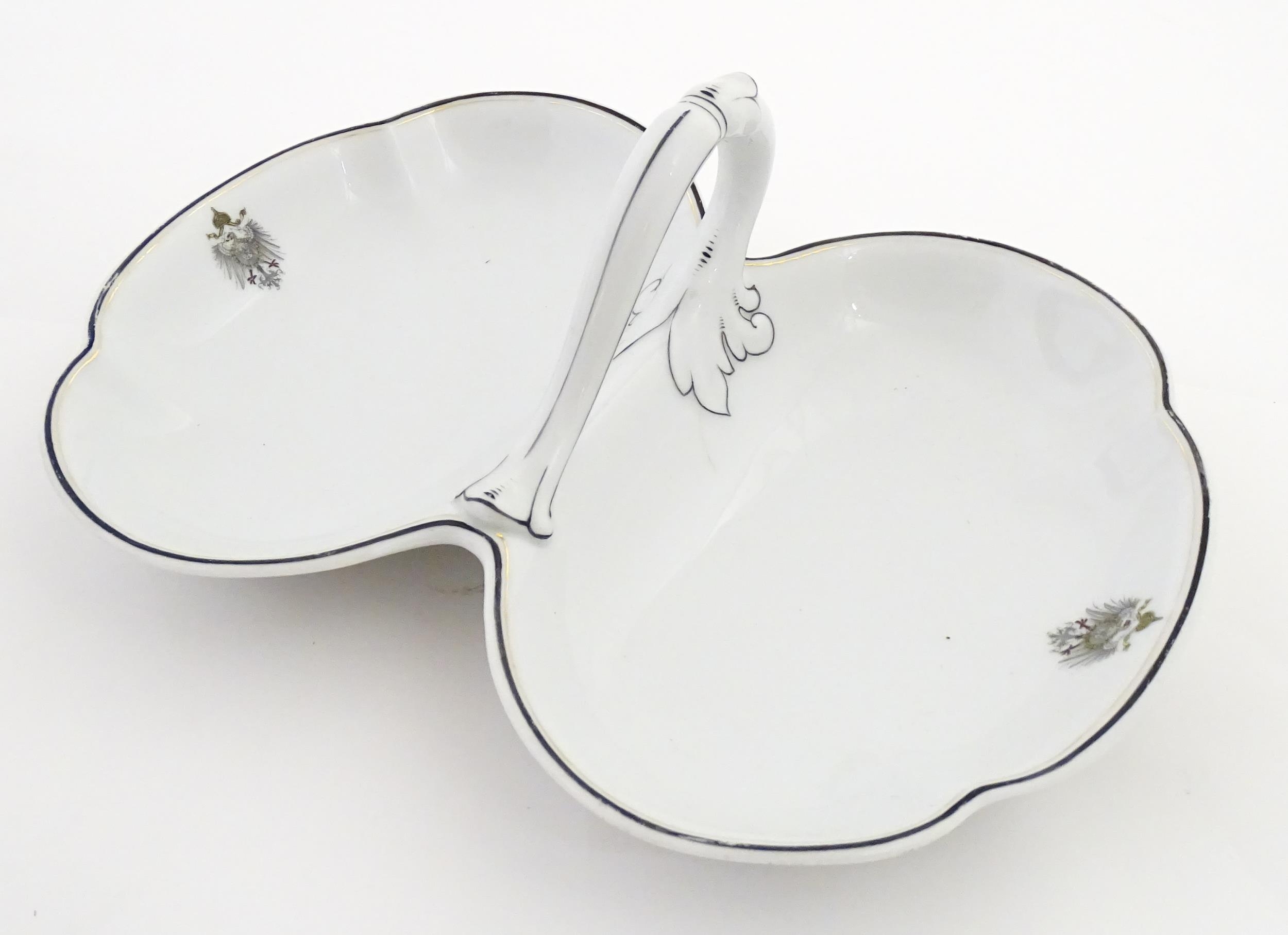A German Fraureuth serving dish with central handle with Imperial eagle crest detail. Marked under. Approx. 11 3/4" wide